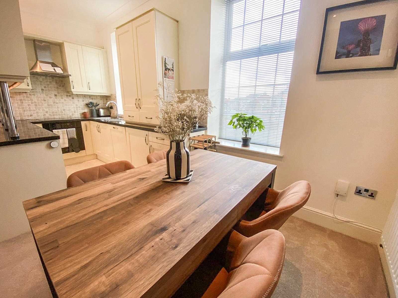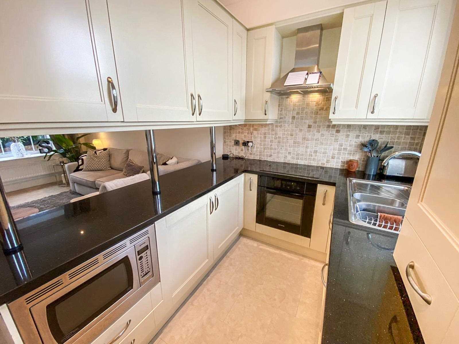Two double glazed windows, integrated dishwasher, washer/dryer, microwave, fridge and freezer, electric hob, oven and extractor fan, wall to base units, stainless steel sink with drainer and mixer, radiator & spotlights. Open to the dining space.