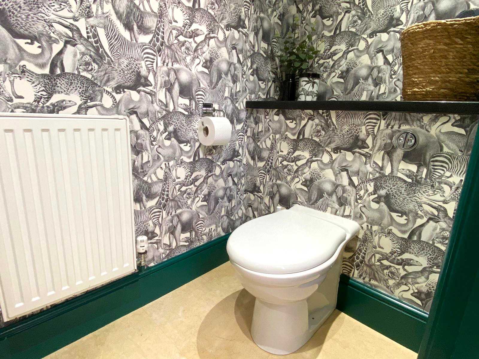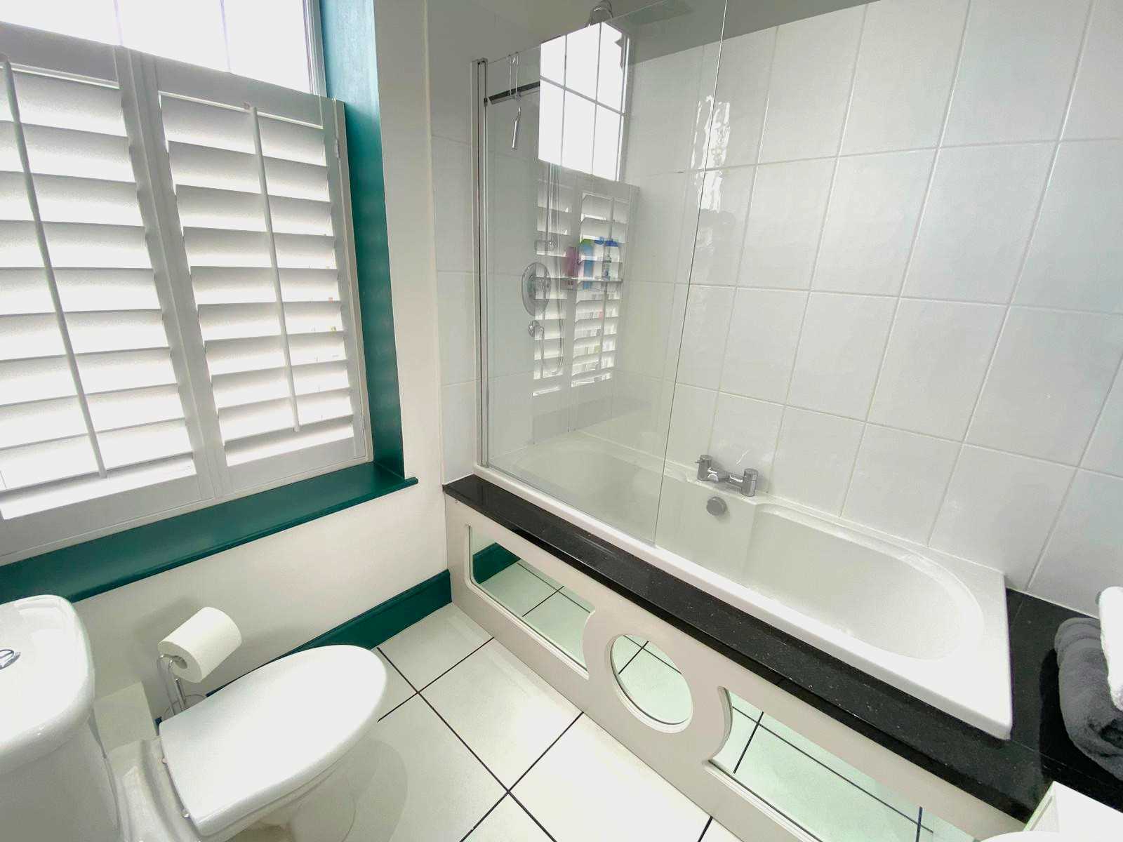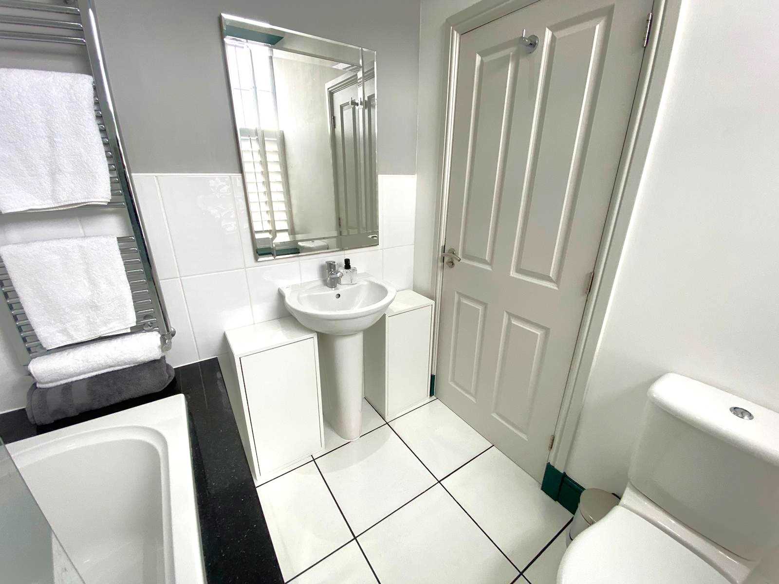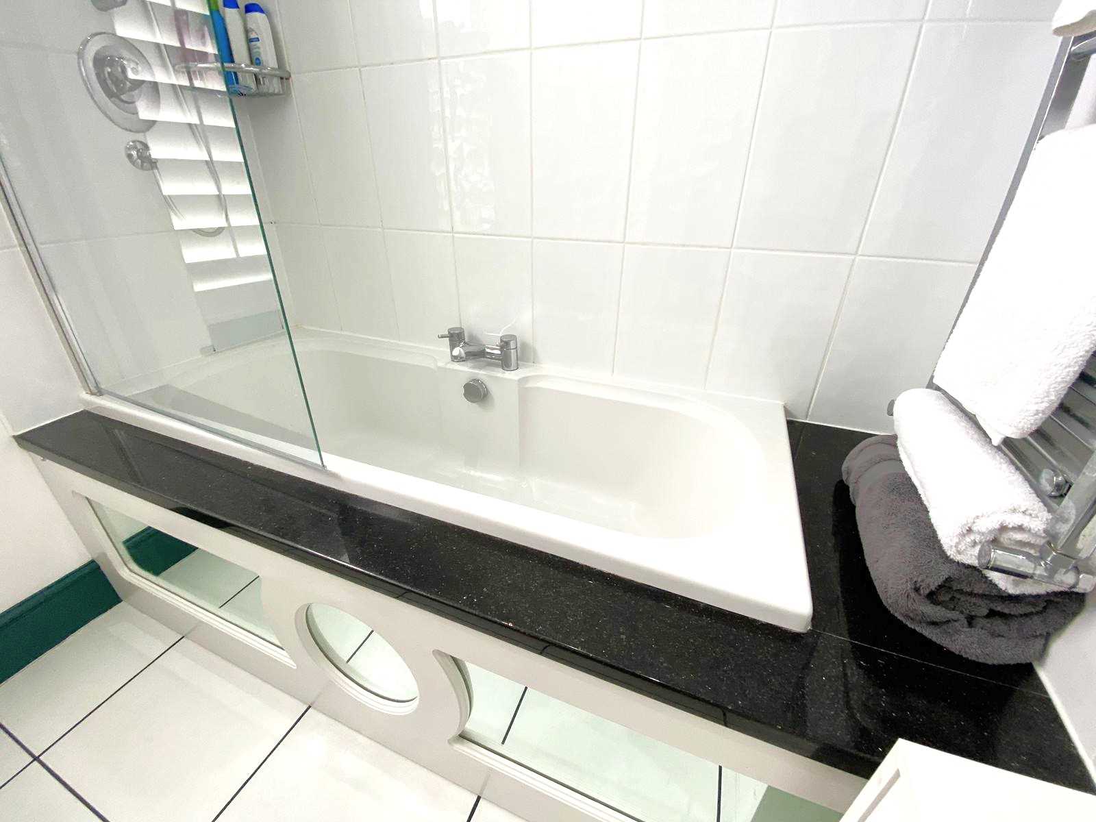 Bath with integrated shower, double glazed window, tiled flooring and splash backs, extractor fan, heated towel rail, low level WC & wash hand basin.