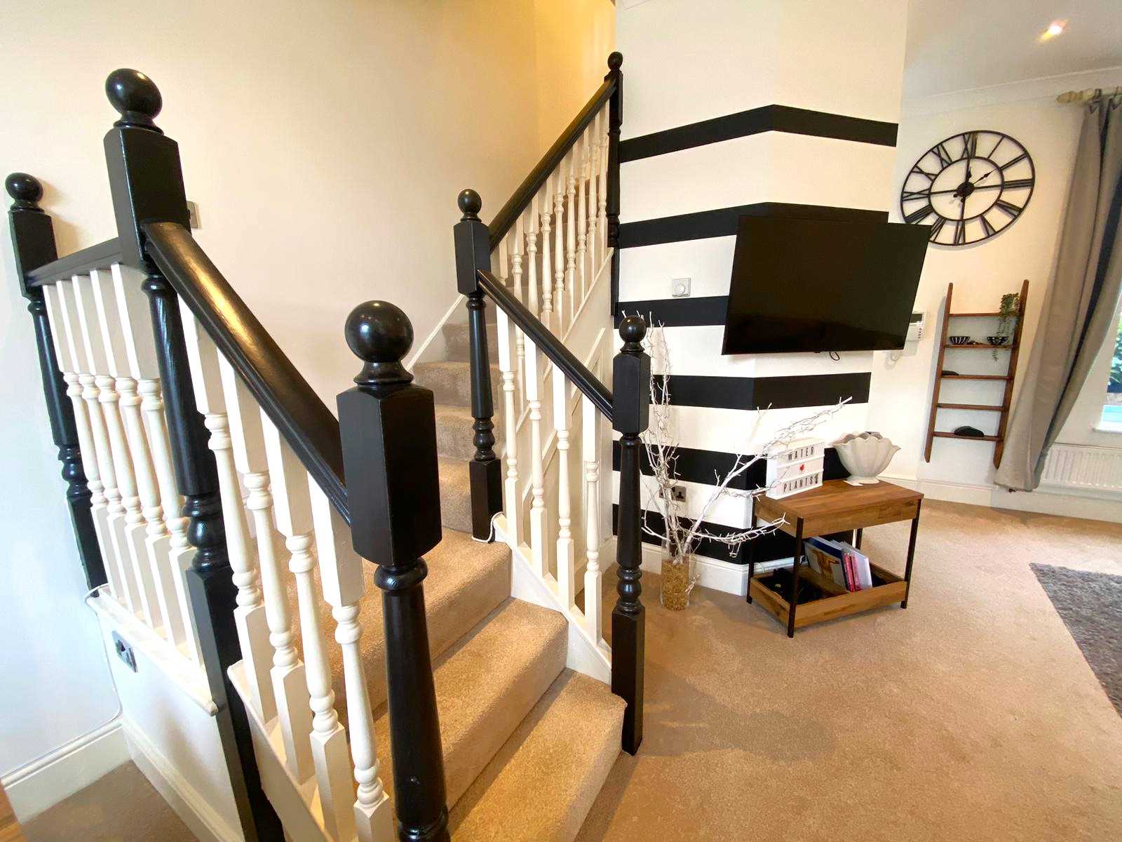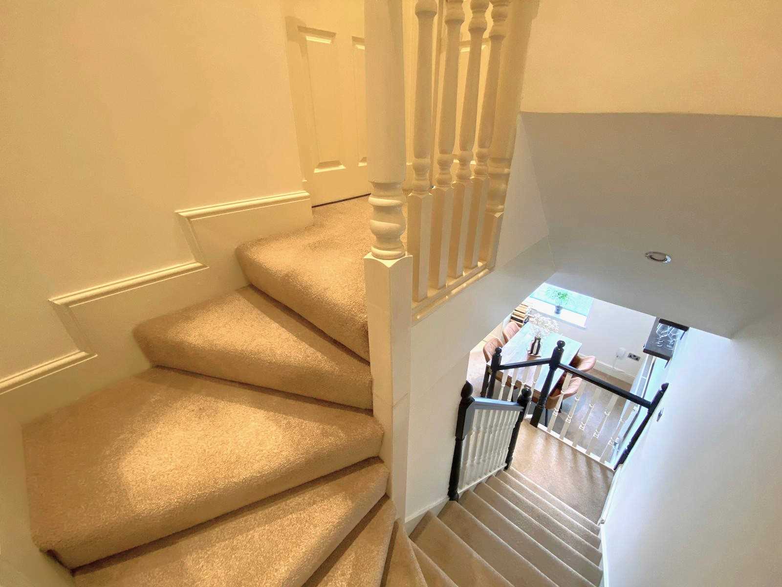Stairs from the living room to the landing area giving access to the bedrooms & storage cupboard.