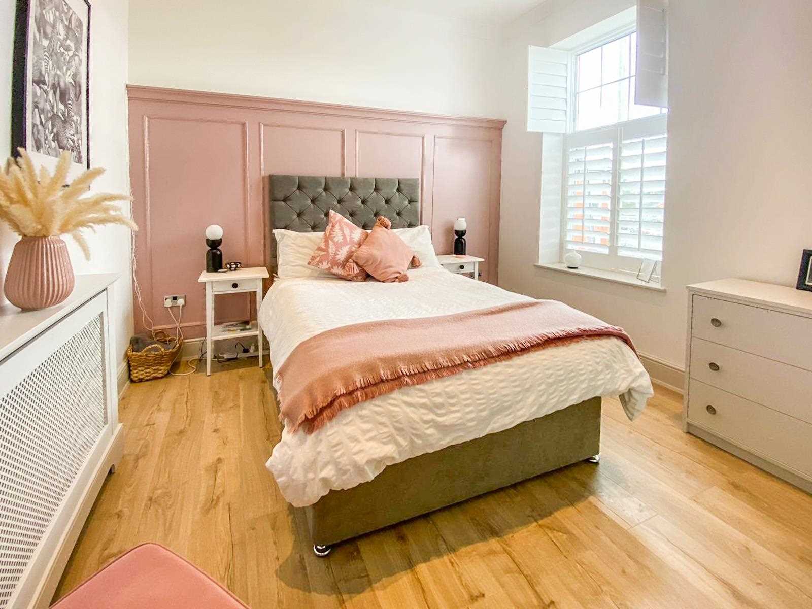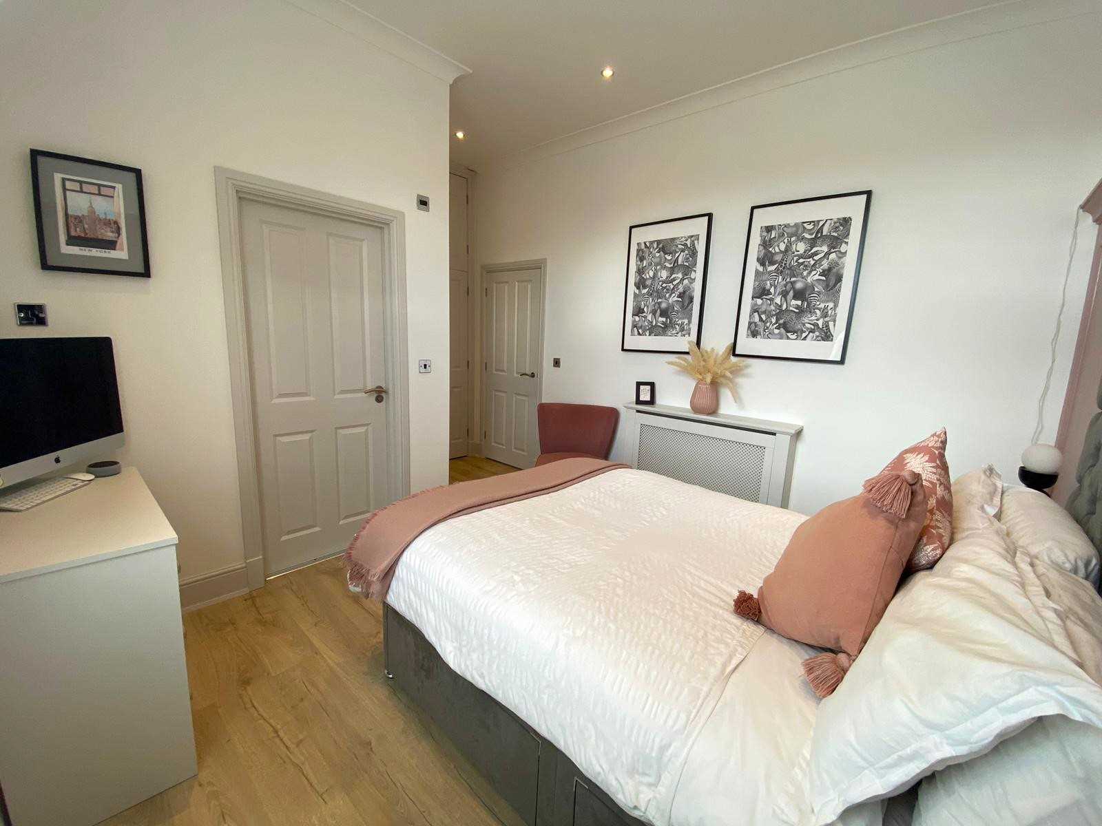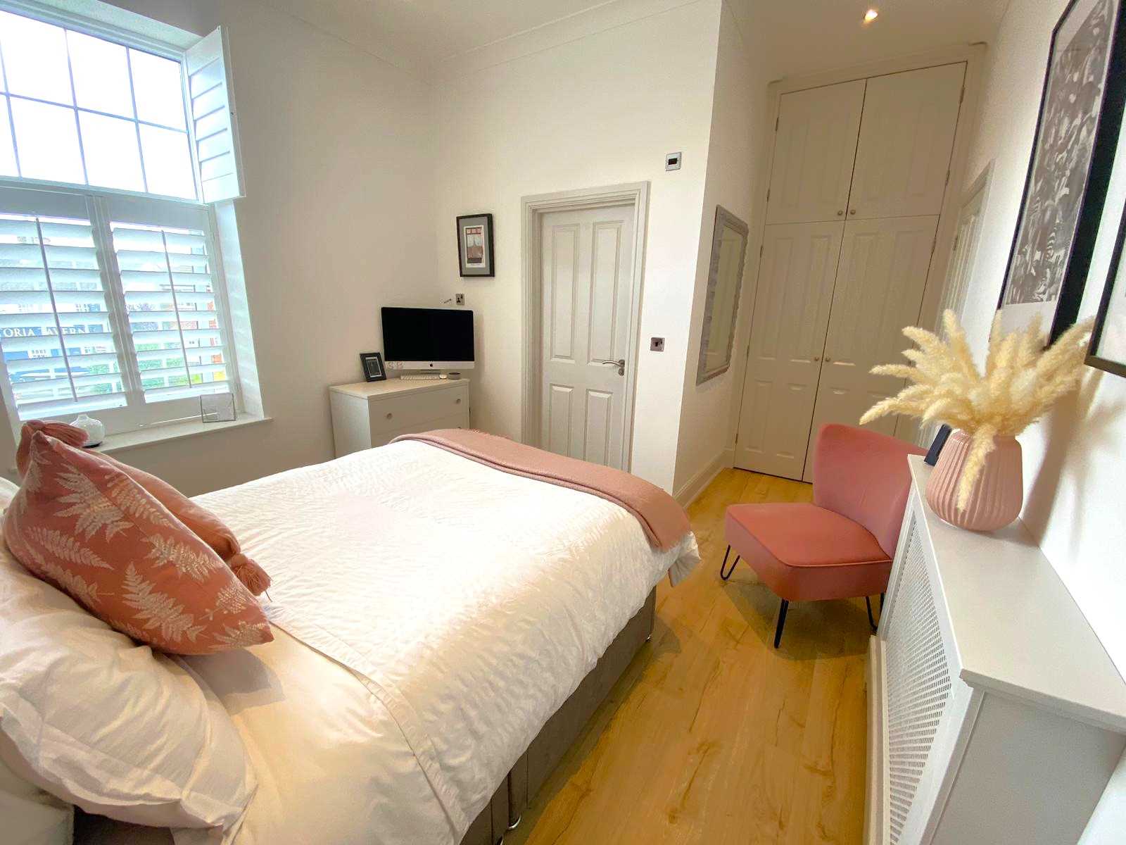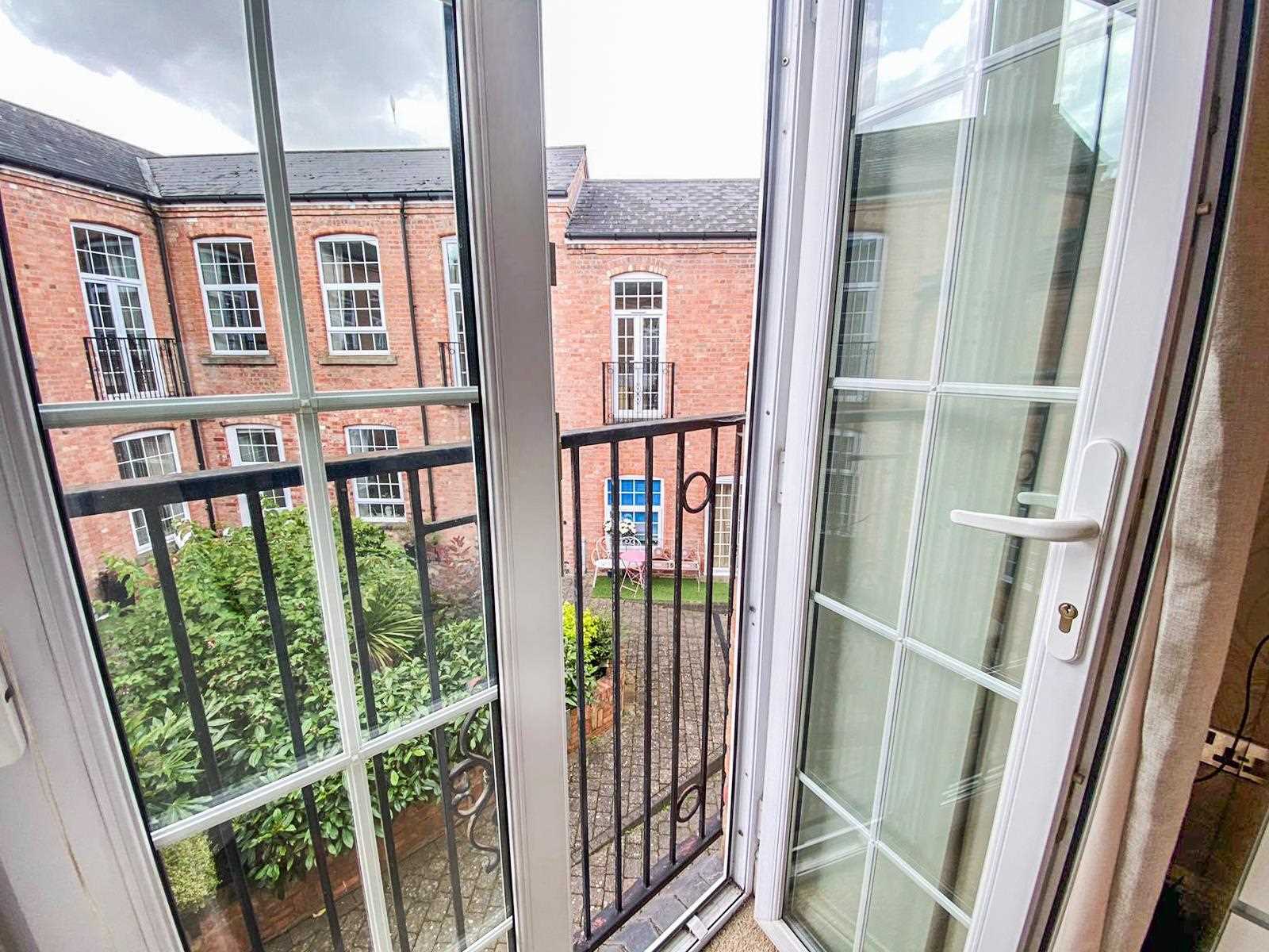 Double glazed window overlooking the courtyard, juliet balcony, access to the loft, storage cupboards & radiator.