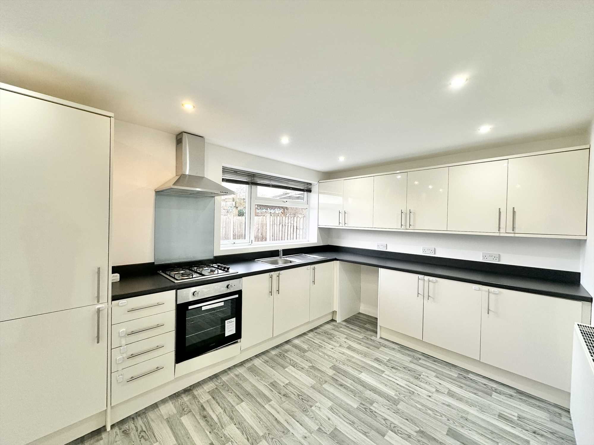 UPVC double glazed door to the rear aspect, UPVC double glazed windows to the rear aspect, ceiling spotlights, matching wall, drawer and base units, integrated oven with extractor hood above, single sink and drainer unit with mixer tap above, radiator, laminate effect flooring.