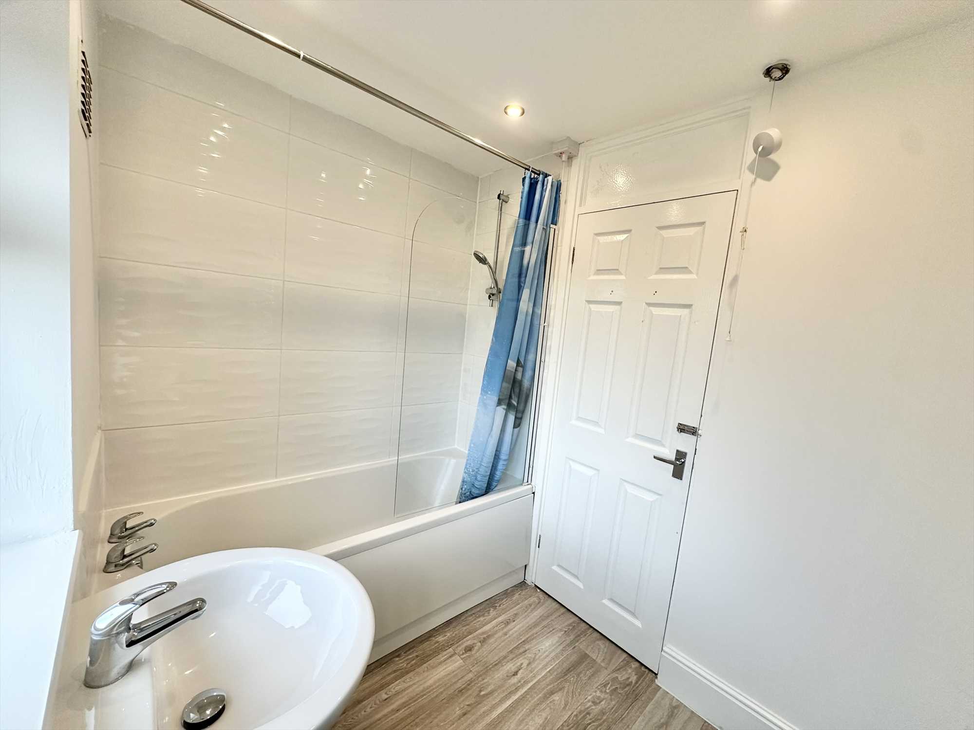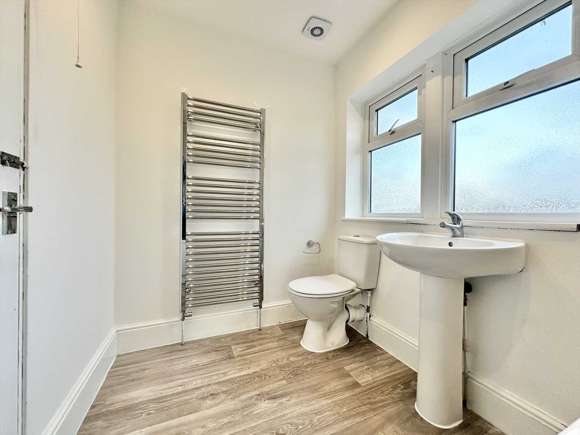 UPVC obscure double glazed window to the rear aspect, ceiling light fitting, panelled bath with shower over and glass screen, pedestal hand wash basin, low level flush WC, heated tower rail, partially tiled walls, laminate effect flooring.