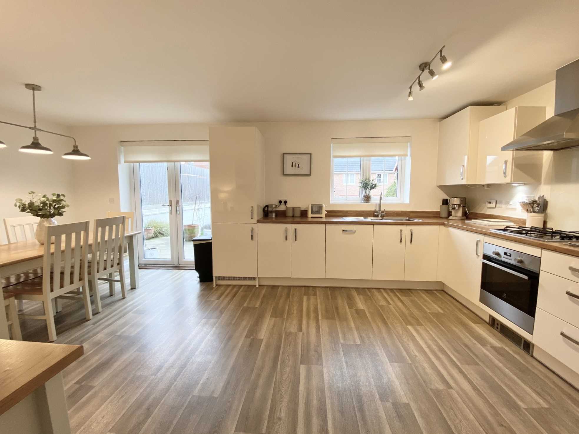 Fitted with a range of contemporary wall, drawer and base units with roll top work surfaces over, inset one and a half bowl sink unit with mixer tap over, electric oven with four ring gas hob and stainless steel extractor hood over, integrated fridge/freezer, integrated dishwasher, UPVC double glazed windows to the rear aspect, UPVC double glazed French doors leading out onto the garden, ceiling spotlight fitting, ceiling light pendant, storage cupboard, radiator, wood effect flooring.