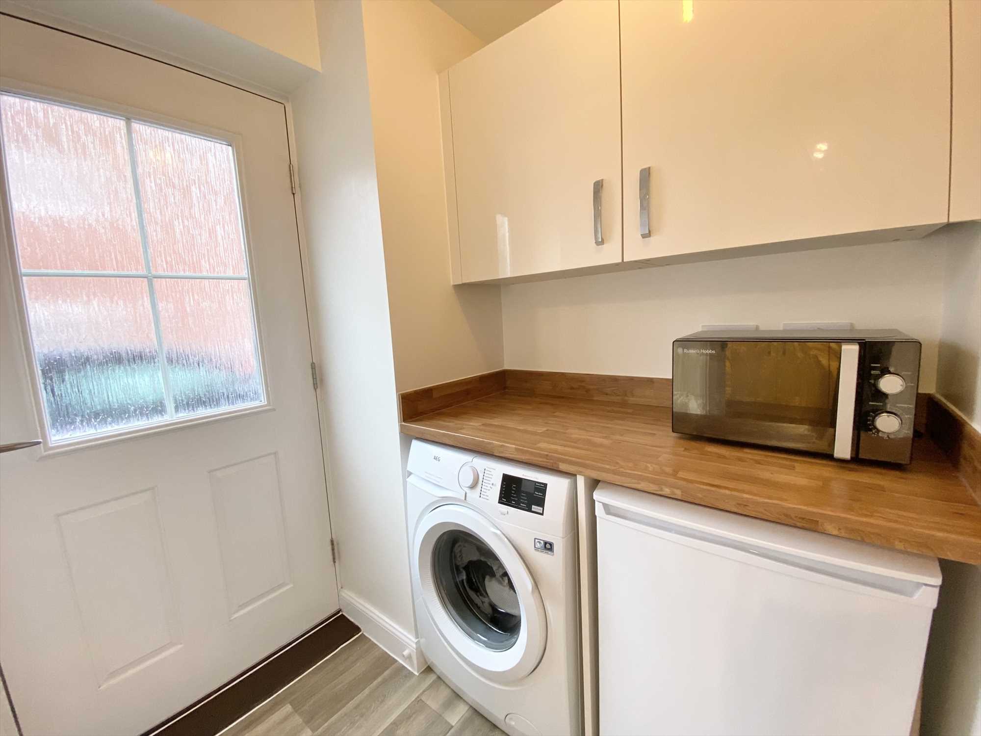 UPVC obscure double glazed exterior door to side aspect, ceiling light fitting, a range of wall and base units with roll top work surface over, space and plumbing for a washing machine, space for a tumble dryer, wood effect flooring.