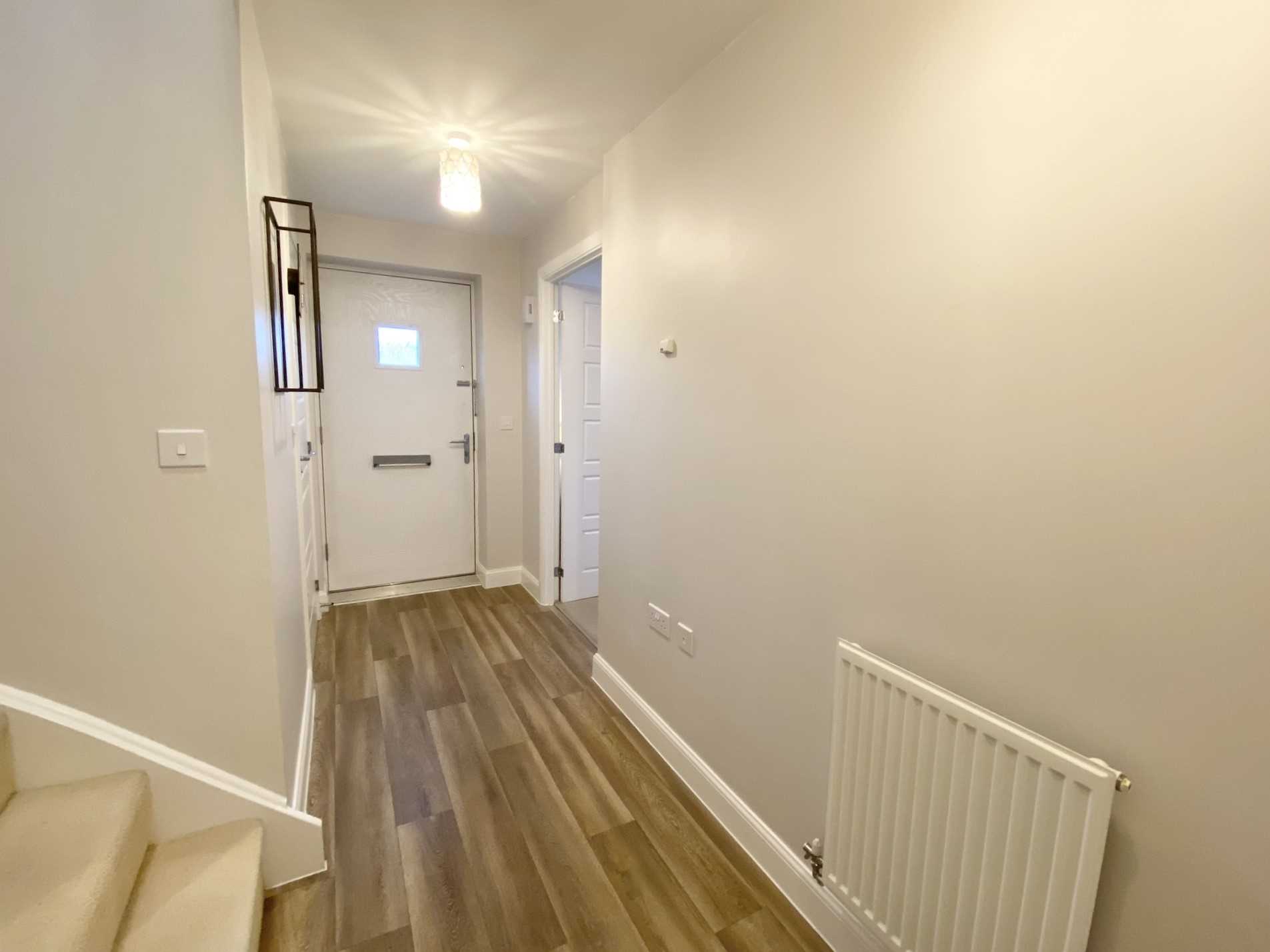 Composite exterior door to front aspect, ceiling light pendant, stairs to first floor, storage cupboard, radiator, wood effect flooring.