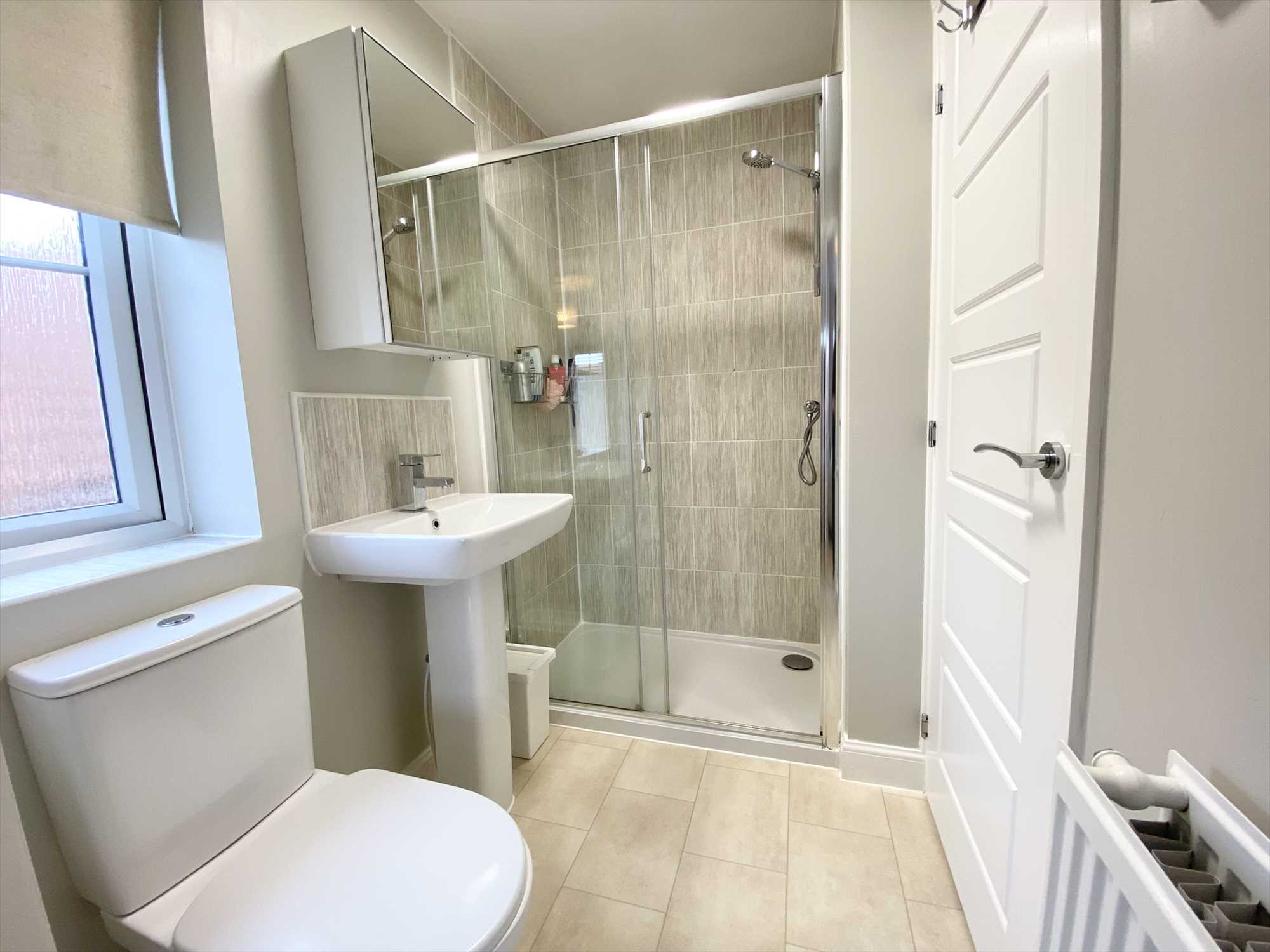 UPVC obscure double glazed window to side aspect, low level flush WC, pedestal hand wash basin, enclosed shower unit with sliding glass door, partially tiled walls, storage cupboard, radiator, tiled flooring.