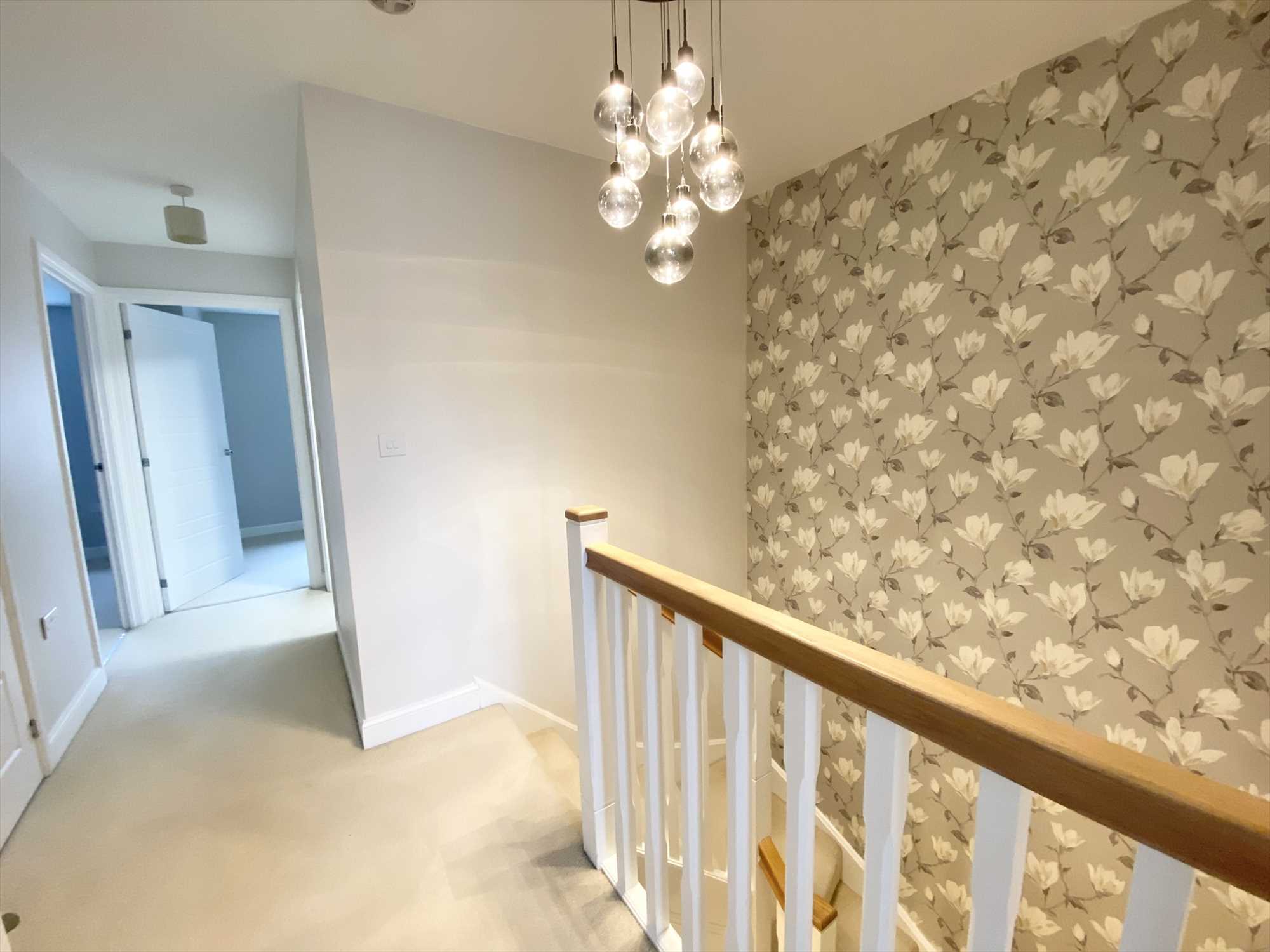 Feature ceiling light pendant, stairs leading down to the entrance hallway, storage cupboard, doors leading to bedrooms and the family bathroom, radiator, carpet.