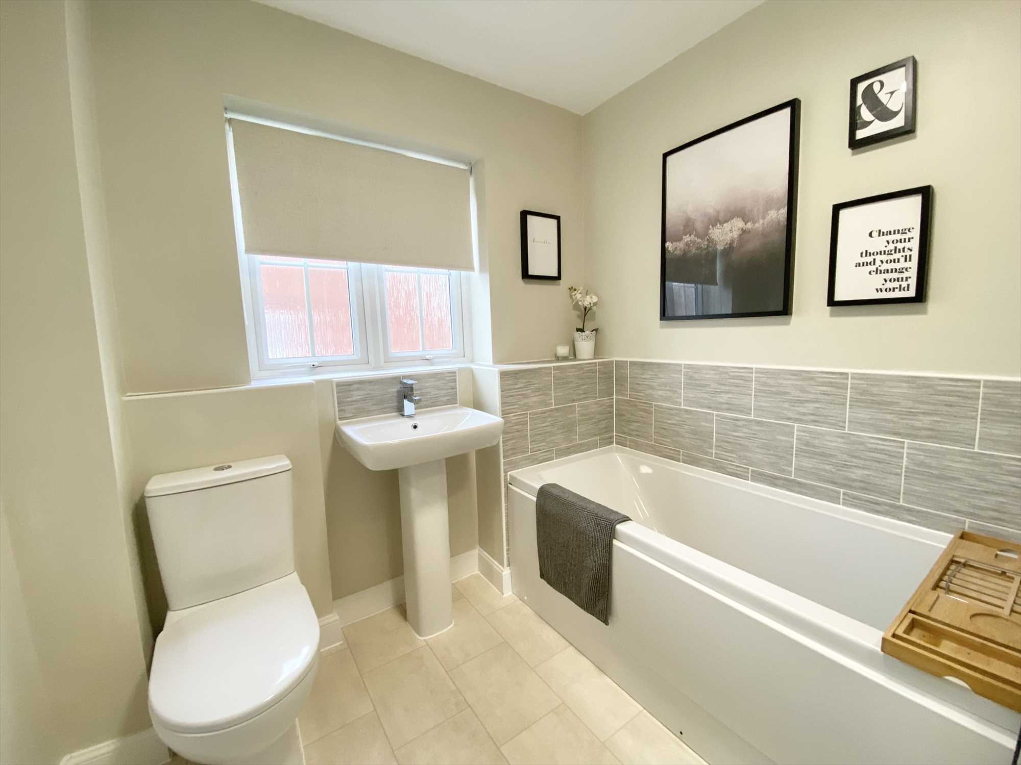 UPVC obscure double glazed window to side aspect, low level flush WC, panelled bath, pedestal hand wash basin, partially tiled walls, tiled flooring.