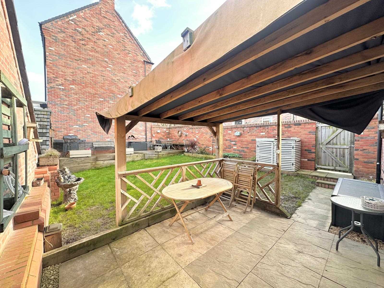 Private walled rear garden is mainly laid to lawn, with a patio seating area under a timber pergola, and an additional decking area. Outside tap.