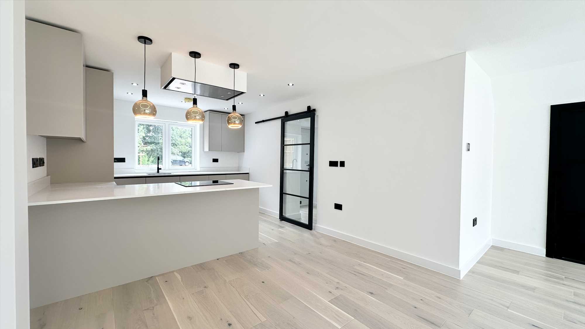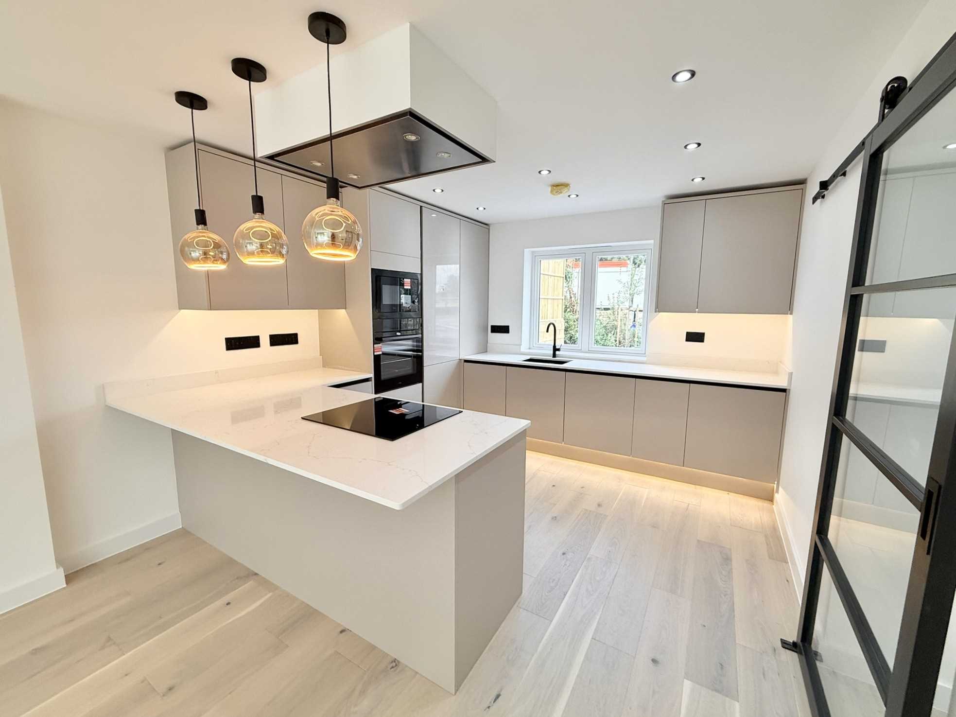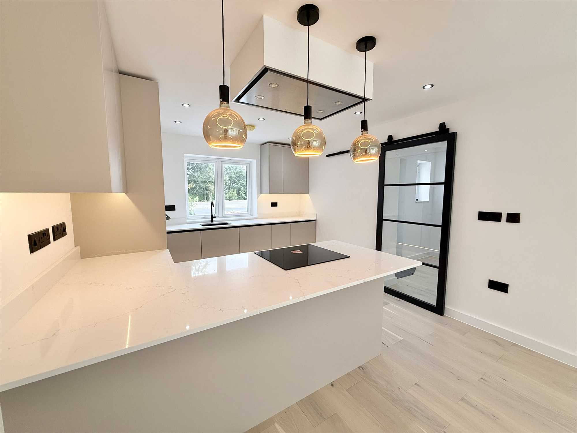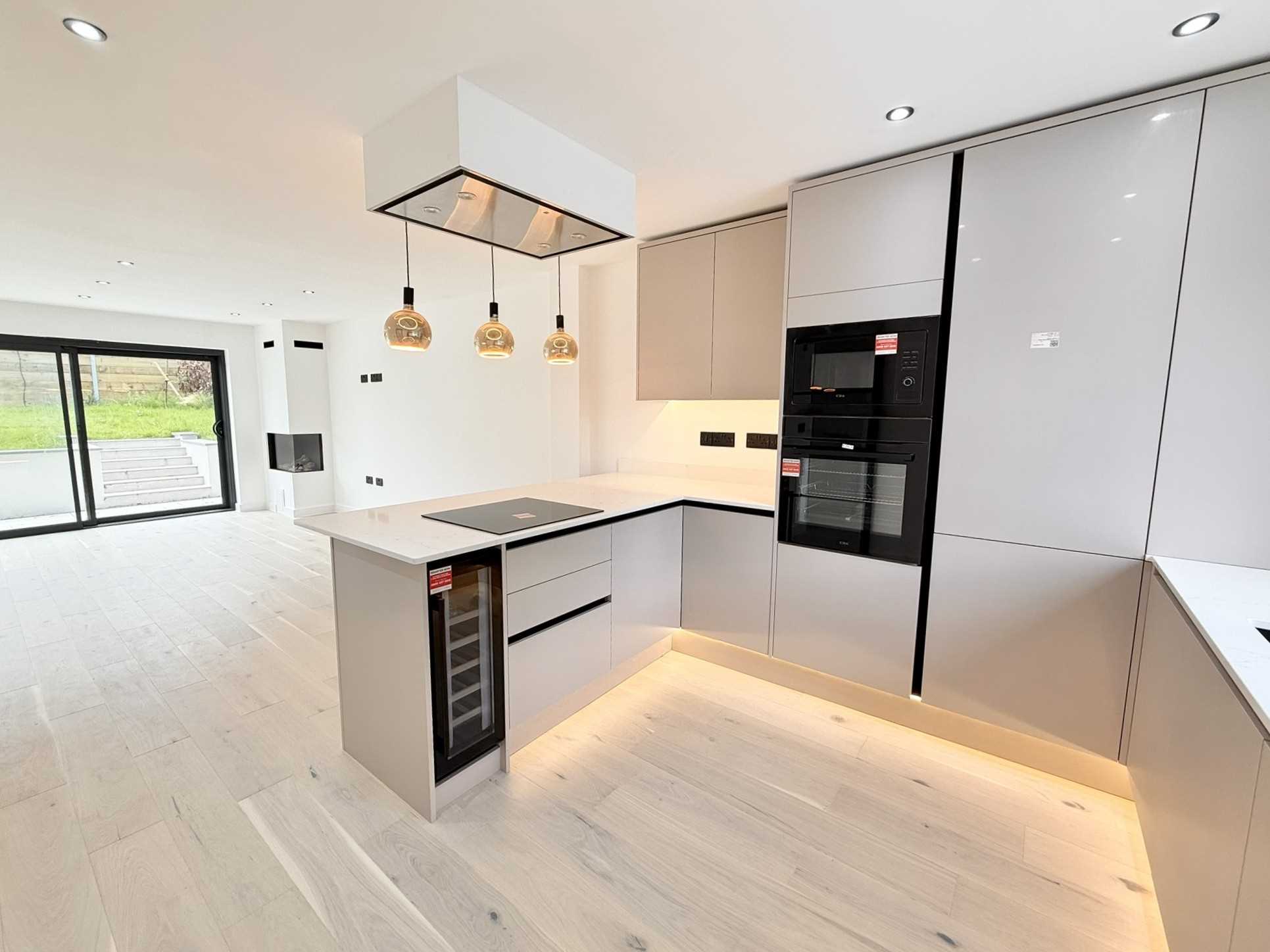 UPVC double glazed window to the front aspect, a range of wall and base cashmere units with marble effect quartz worktops, CDA four ring induction hob, electric oven, microwave, sink with mixer tap over, wine cooler, integral dishwasher and Baumatic washing machine, integral fridge / freezer, extractor fan, sliding glass door, wooden flooring, three hanging light pendants, spotlight ceiling pendants.