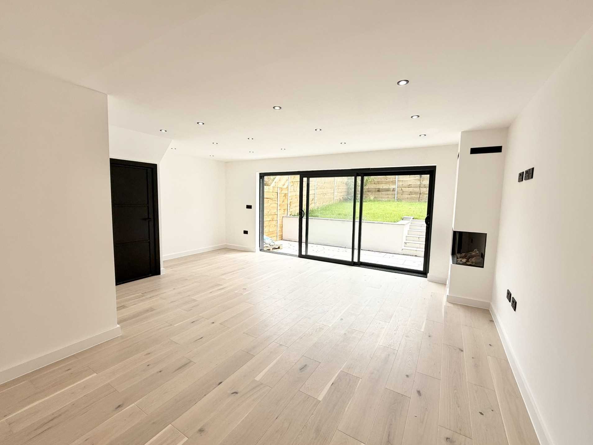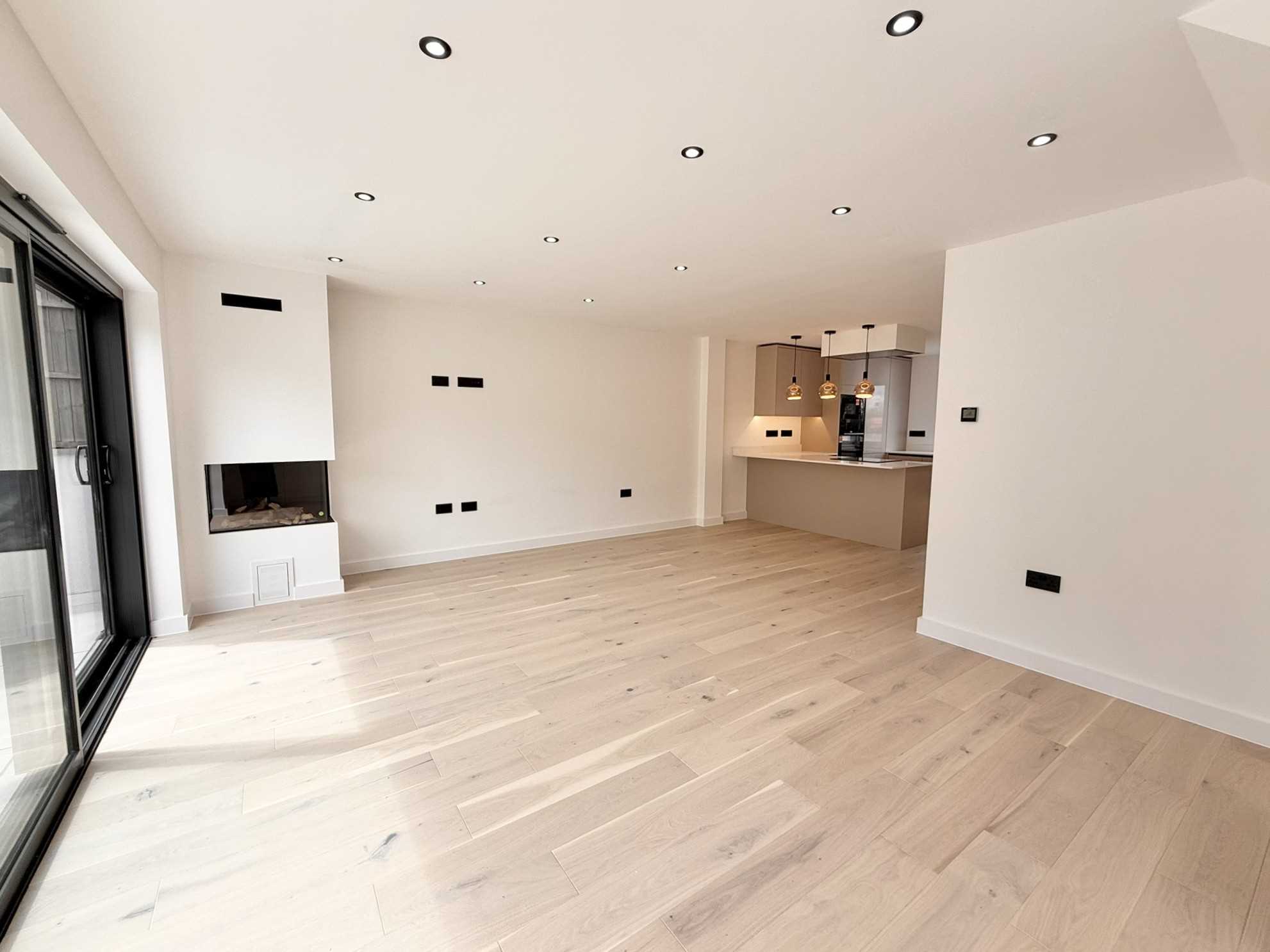 UPVC double glazed sliding doors to the rear aspect, Barbas Bellfires gas feature fireplace, underfloor heating, storage cupboard, wooden flooring, spotlight ceiling pendants.