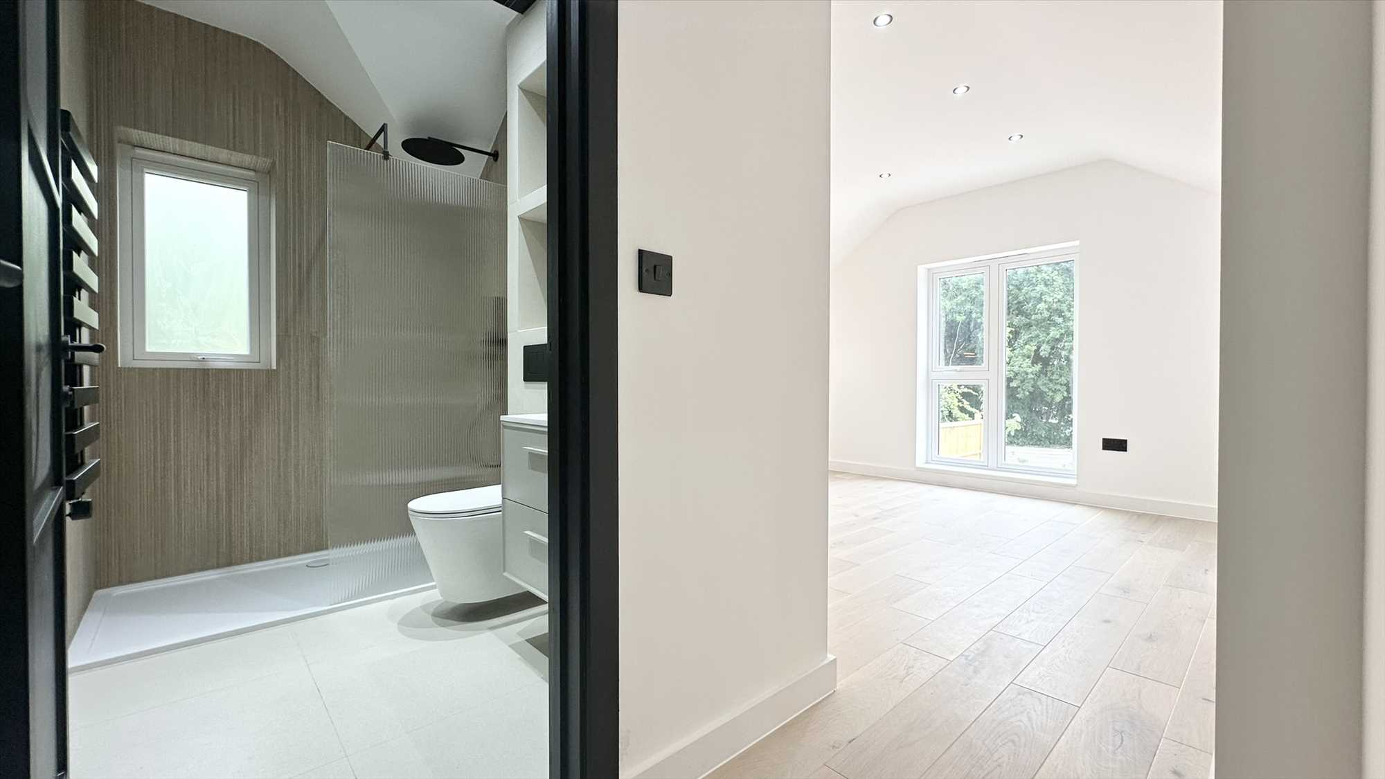 UPVC double glazed frosted obscure window to the front aspect, three piece white suite with black accents comprising of Cubik white wood grain vanity, LED mirror, single shower tray with Mira attachment over and glass surround, vermont free standing stone bath 1500mm, Faro matte wall hung WC, heated hand towel rail, tiled surround, spotlight ceiling pendants.