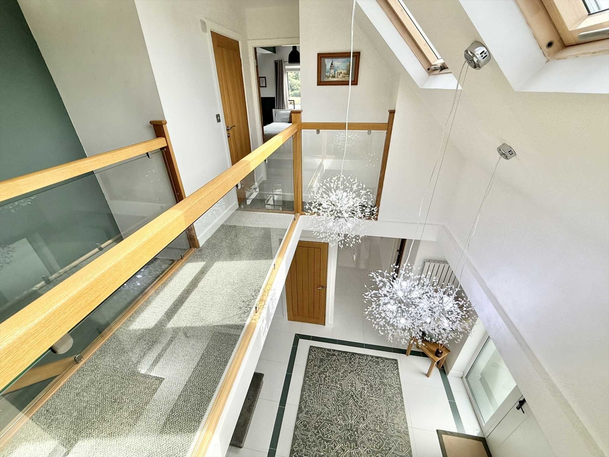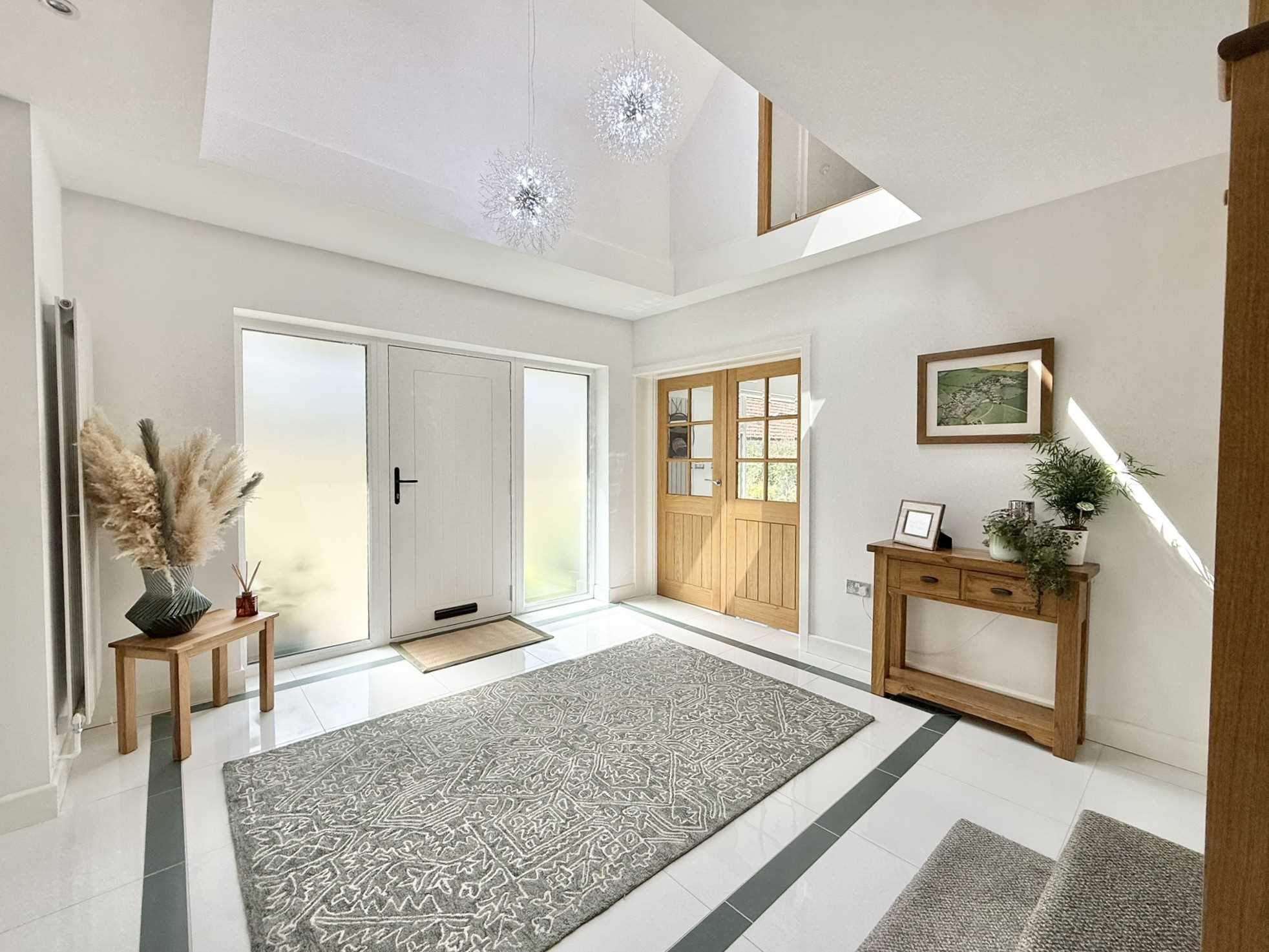 Exterior door with obscure double glazed side panels, feature ceiling light pendant, ceiling spotlights, open view to galleried landing above, oak staircase with glass balustrade to first floor, tiled flooring.