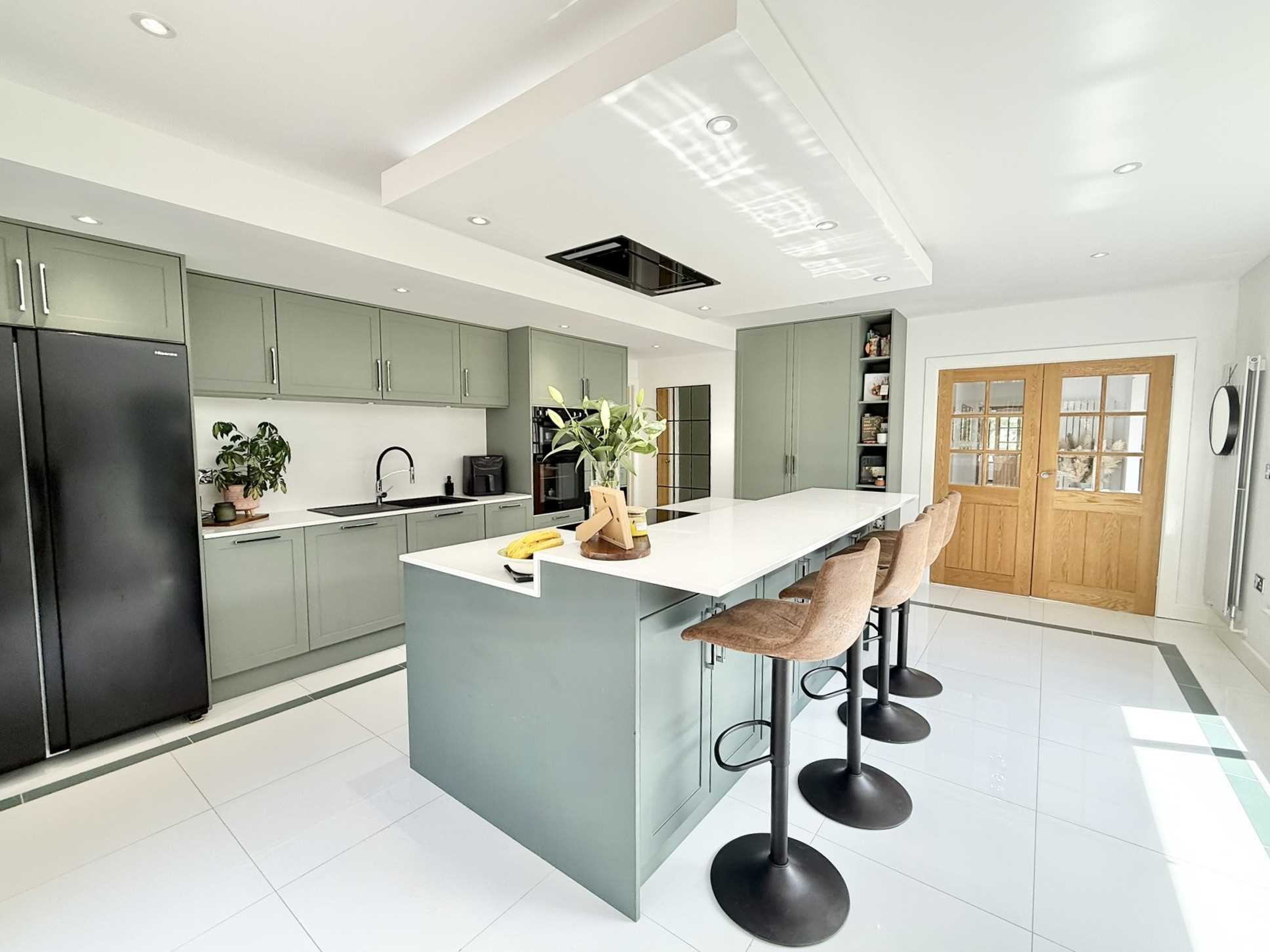 Double glazed window to front aspect, double glazed sliding patio doors to side aspect, ceiling spotlights, a range of contemporary wall, drawer, and base units with worktop over, matching island with breakfast bar, sink and drainer unit with mixer tap over, integrated double oven, integrated microwave, wine cooler, dishwasher, five ring induction hob with ceiling extractor over, space for an American style fridge freezer, vertical radiator, tiled flooring.