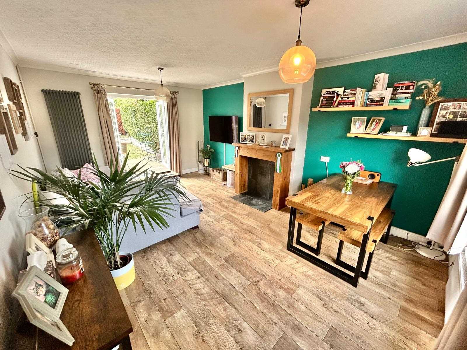 Window to the front aspect & french doors opening onto the rear garden. Wood effect flooring, two ceiling light pendants & radiator.
