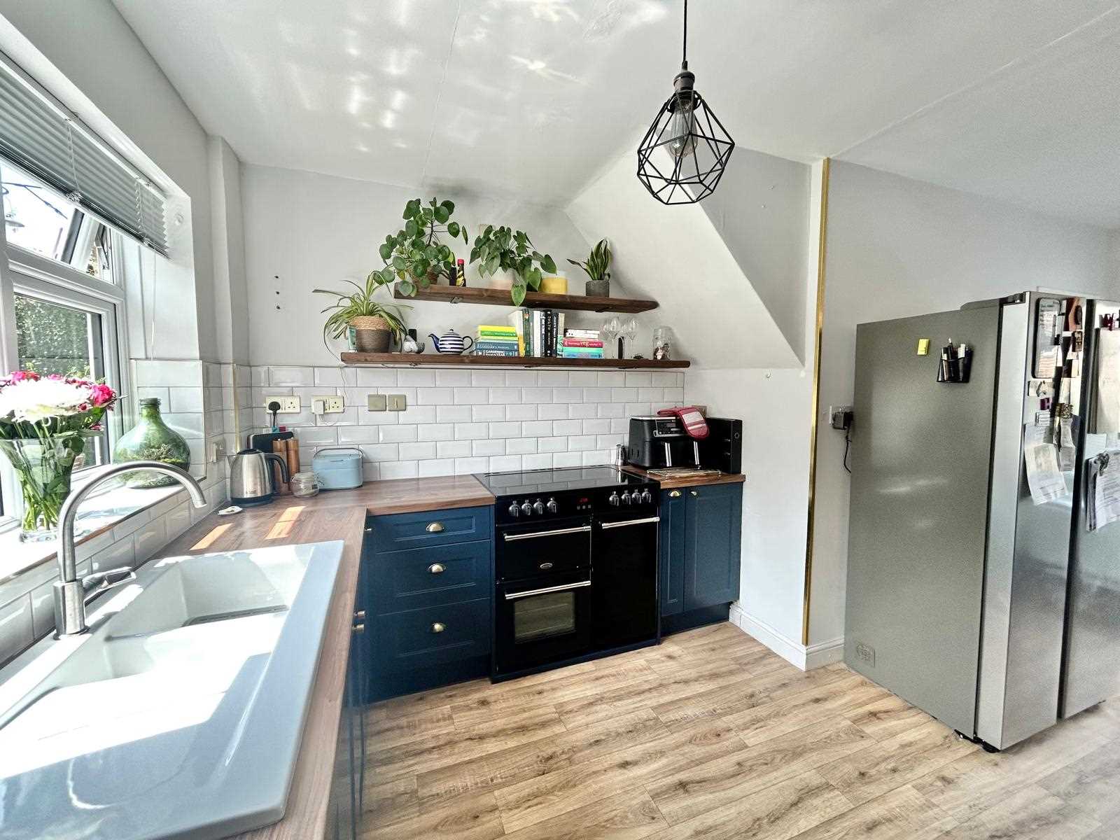 Blue fitted base, wall & drawer units with work surface over. Integrated dishwasher, white ceramic sink with mixer tap, double oven, space for free standing fridge freezer, UPVC double glazed window to the front & rear aspect.