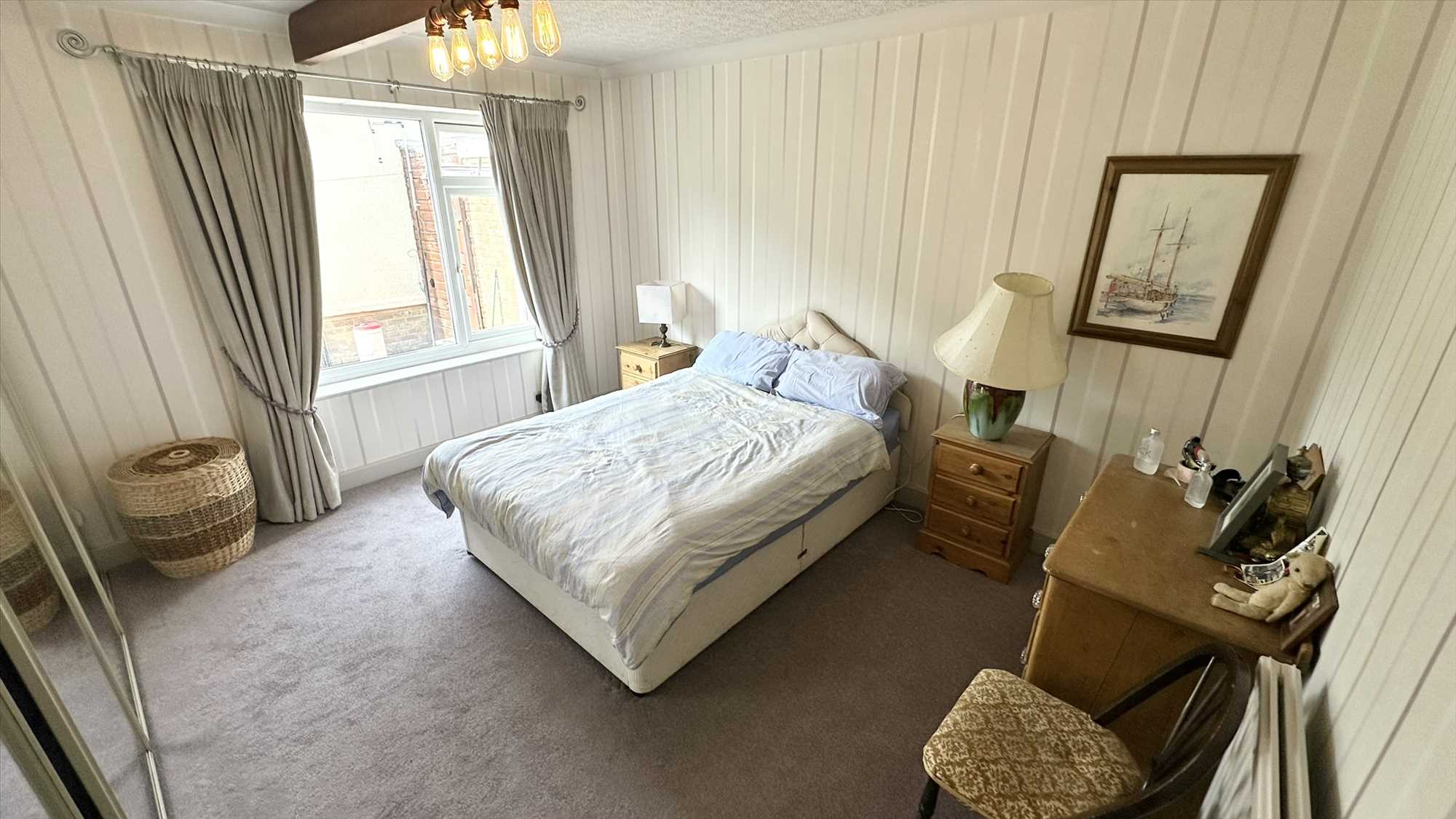 Three UPVC double glazed windows to front and side aspects, exposed beams, carpet to flooring, wall light pendants.