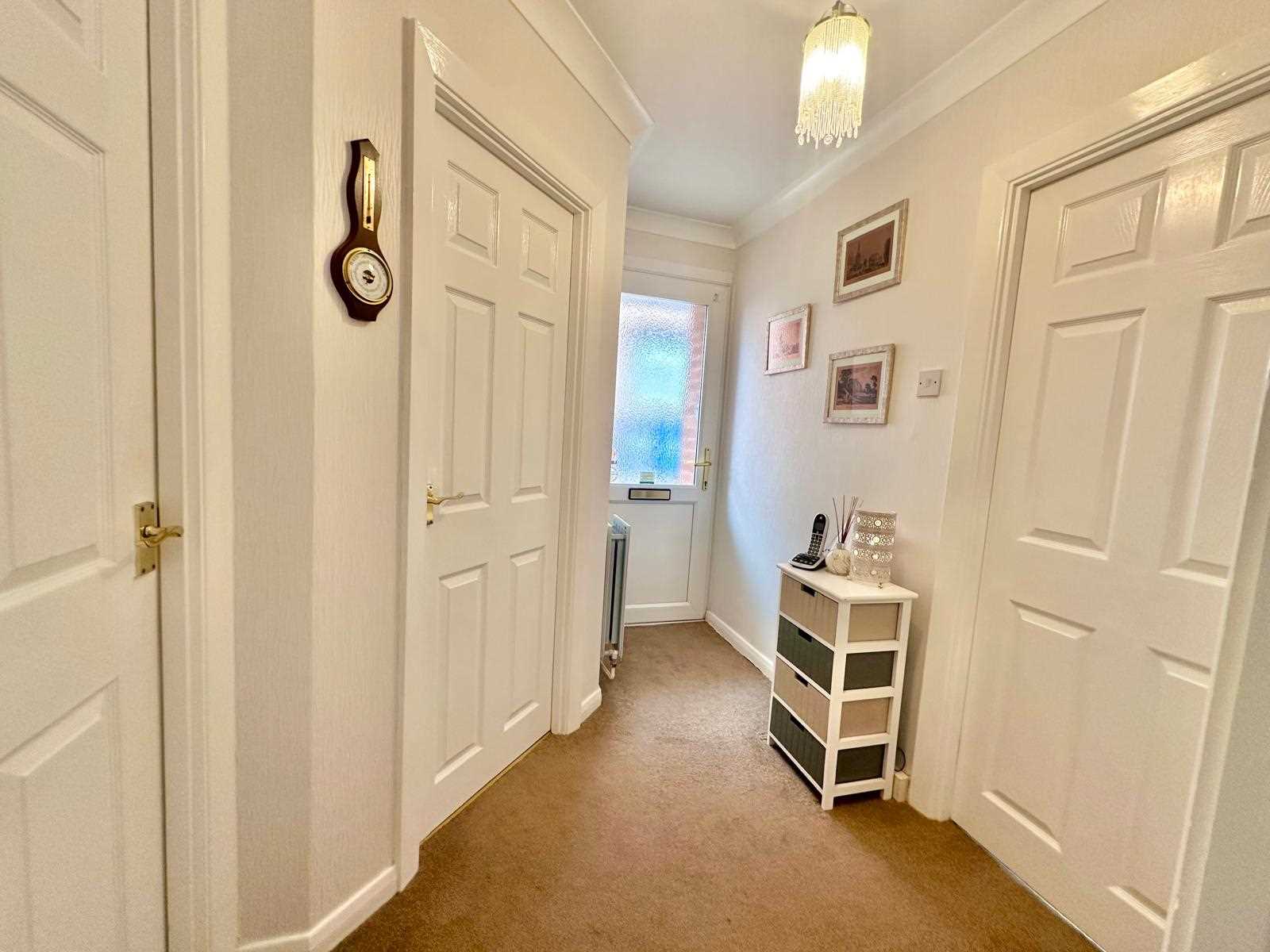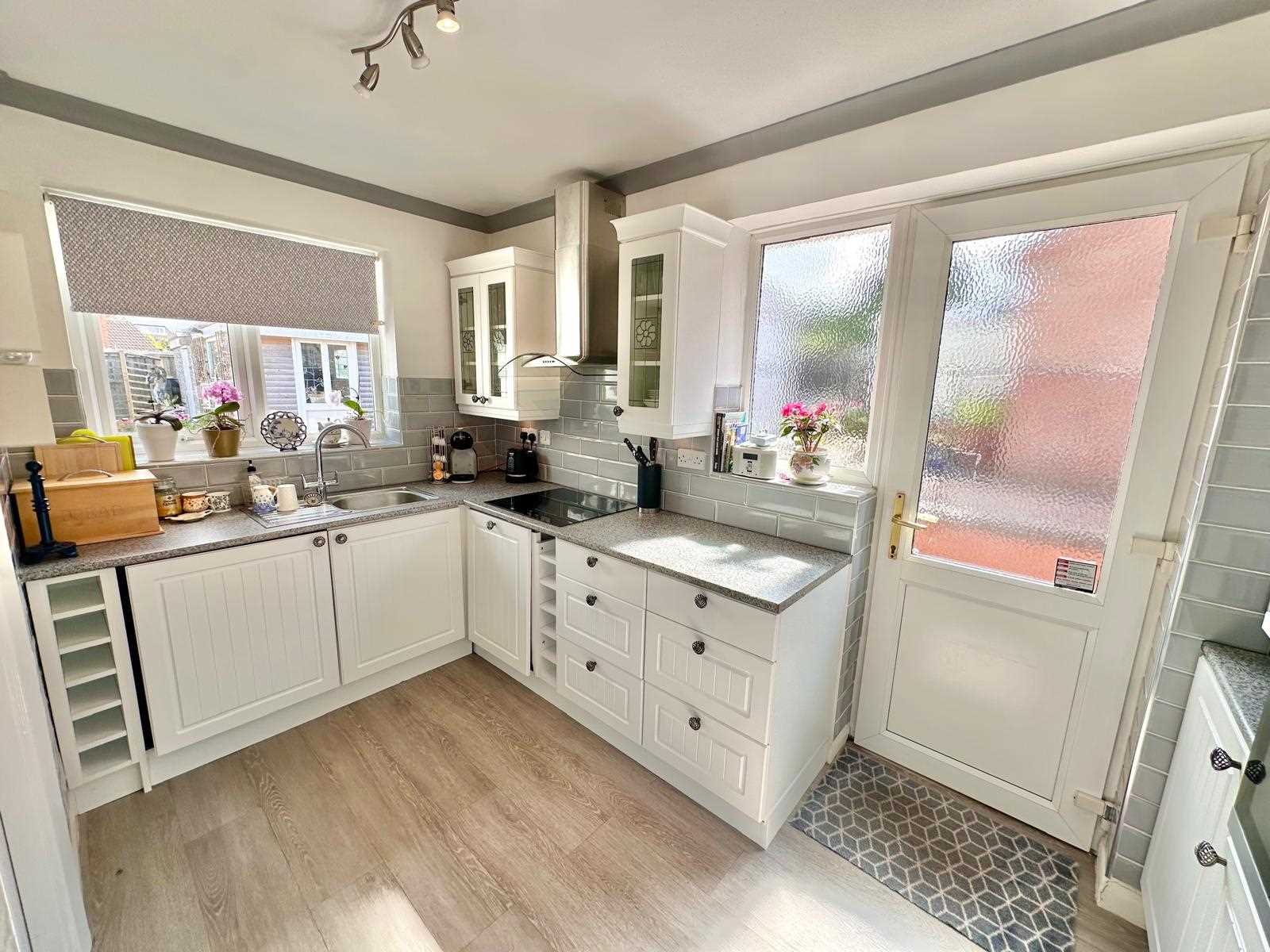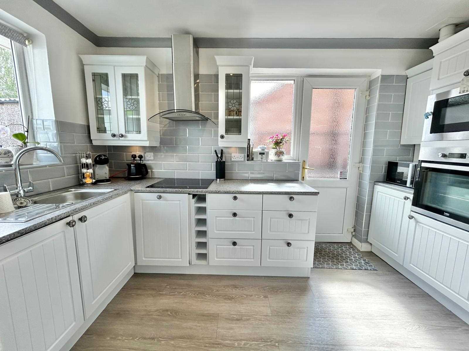 Obscure double glazed side door leading to driveway, Upvc double glazed window over looking the rear garden, having a range of wall and base units, roll top work surfaces ,stainless steal sink unit with drainer and mixer tap, splash back tiling, fitted induction hobs with extractor hood above, integrated dishwasher, cupboard housing boiler, integrated microwave, integrated electric oven, integrated stacked fridge freezer, radiator, vinyl flooring.