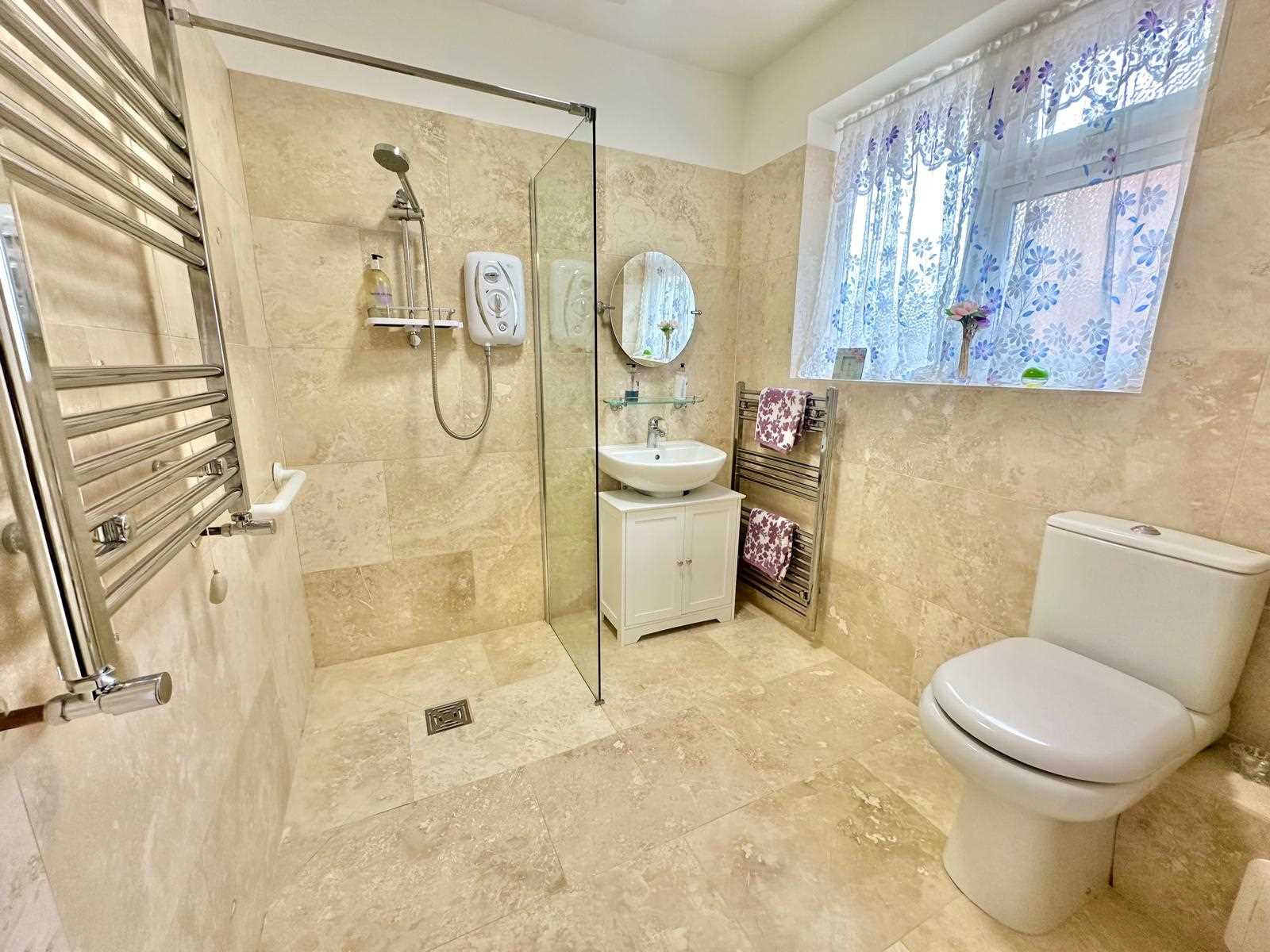 Upvc double glazed window to the side of the property, ceiling light fitting, extractor fan, fully tiled floor and walls, electric shower fitting with glass screen, fitted hand rail, wash hand basin with fitted storage, toilet.