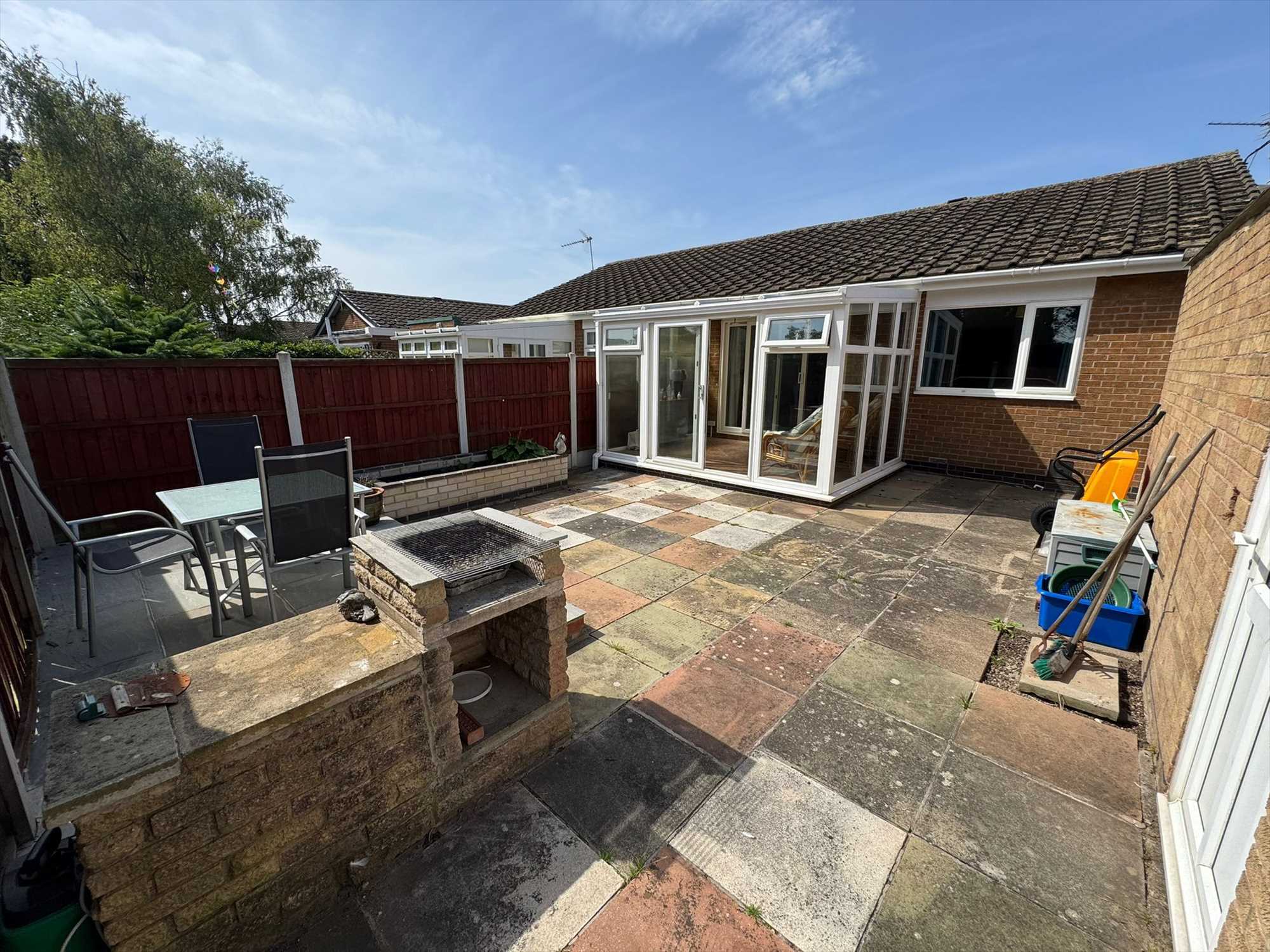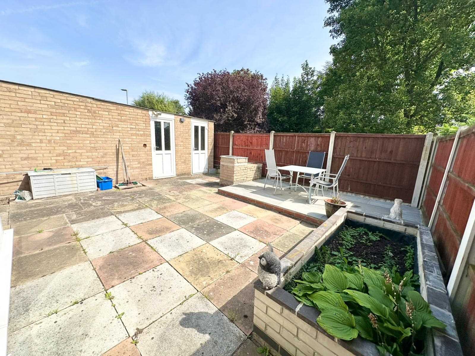 The rear garden is fully enclosed with timber fencing and has been entirely paved for ease of maintenance. complemented by raised planting beds and a brick-built BBQ area, and provides direct access to the garage and adjoining storage area, making it both practical and enjoyable for outdoor living.
