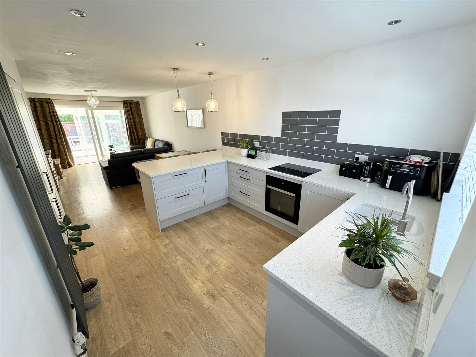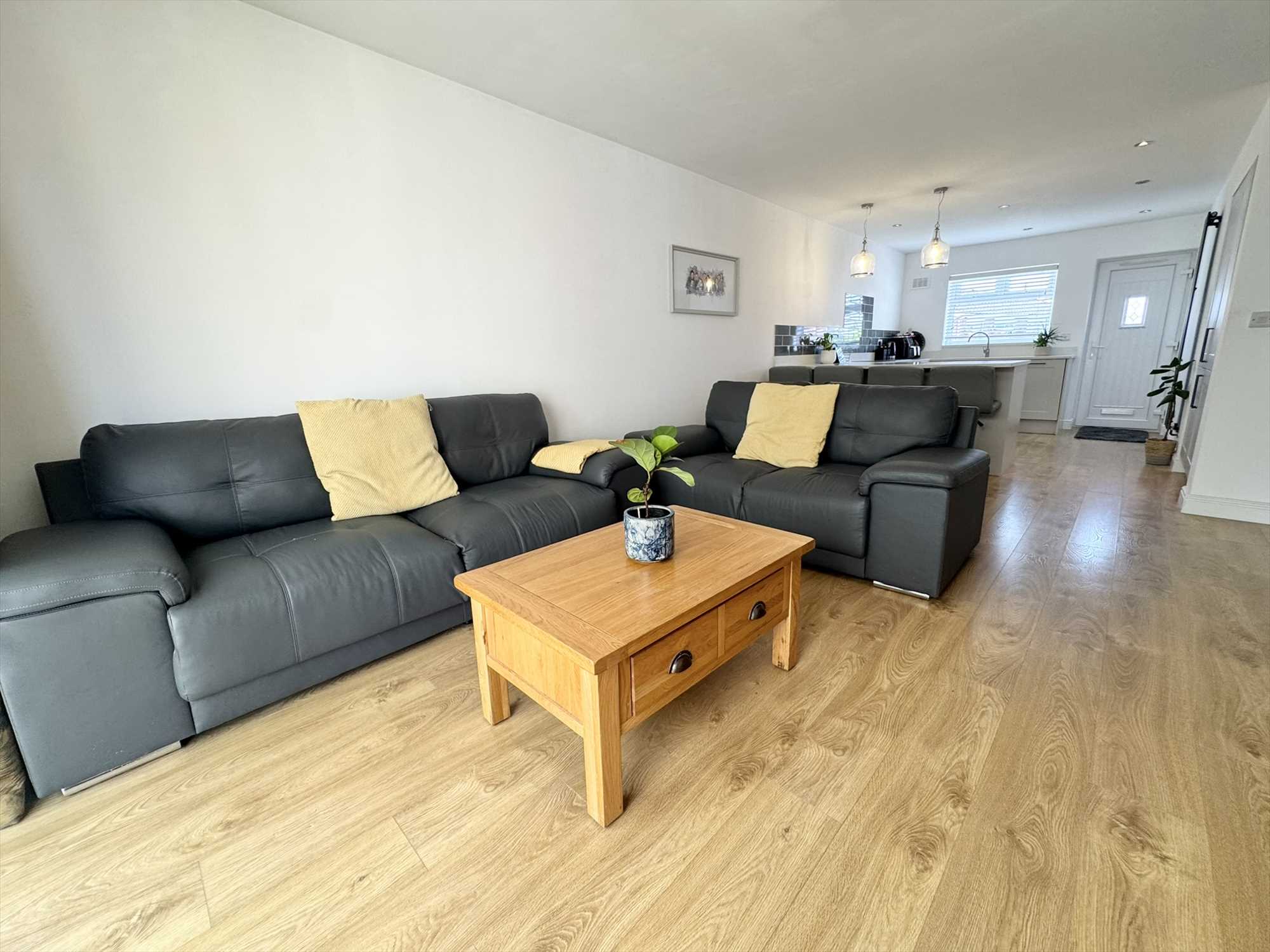 UPVC double glazed windows to the front aspect, UPVC Front door, fitted with a range of modern base units, with quartz worktops over, tield splashbacks, undermount sink unit with mixer tap over, integrated dishwasher, fitted electric oven, ceramic hob, integrated fridge freezer, pantry storage cupboard, column radiator, ceiling spot lights, breakfast bar seating area, two ceiling pendant lights, laminate wood effect flooring.