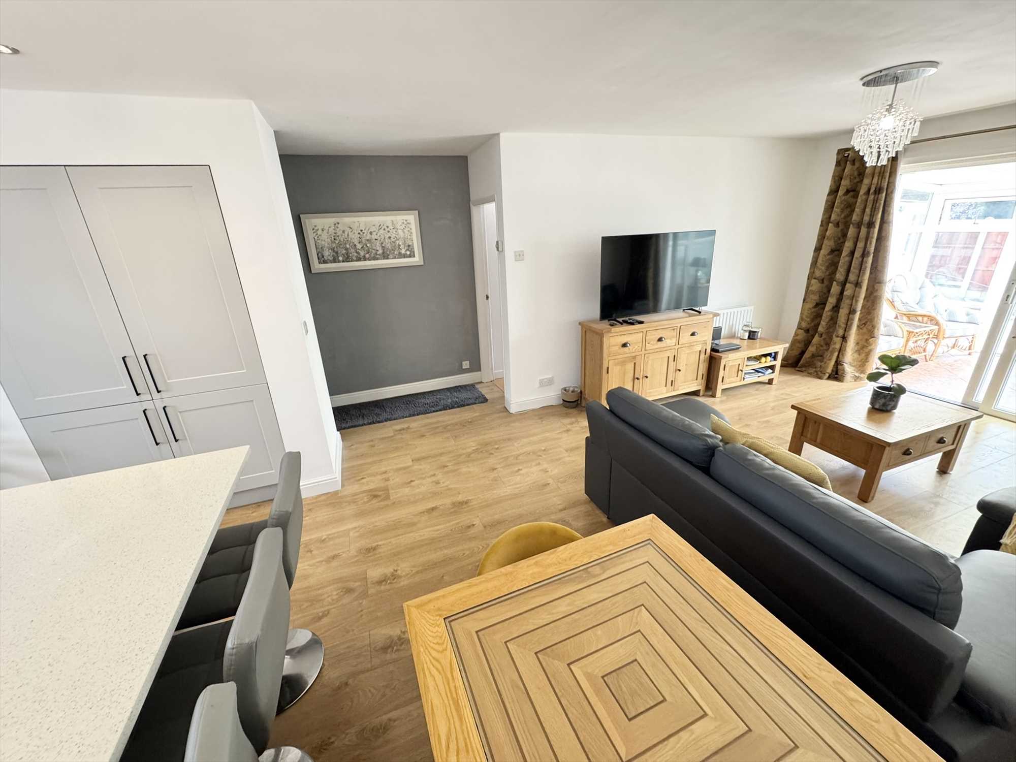 UPVC double glazed sliding patio doors leading to the conservatory, ceiling light pendant, radiator, laminate wood effect flooring.