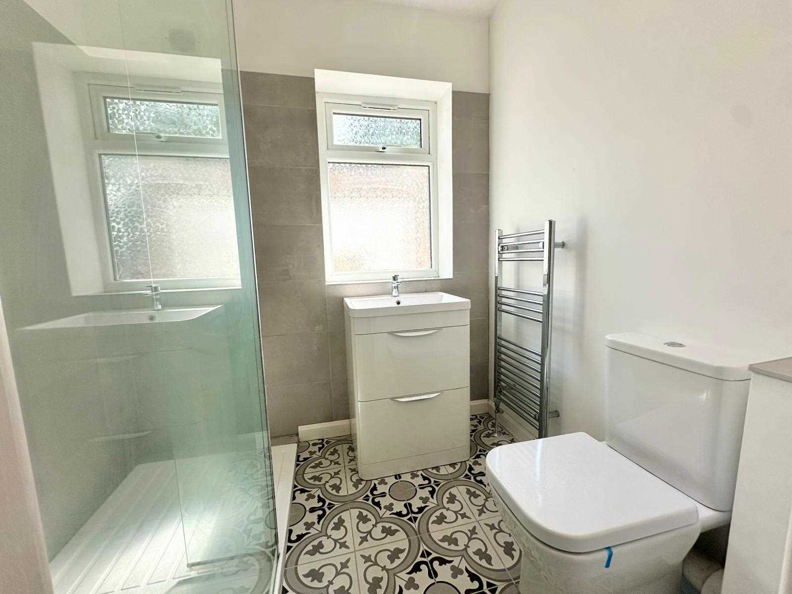 UPVC doubled glazed obscure window to the rear aspect, ceiling light fitting, low level flush WC, vanity wash hand basin, fully tiled walk in shower with mixer shower, glass shower screen, heated tower rail, tiled flooring.
