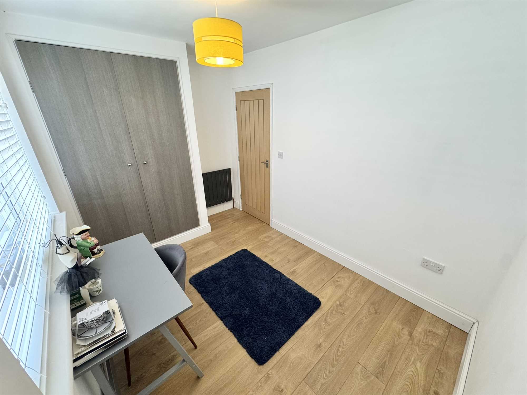 UPVC double glazed window to the front aspect, pendant light fitting, built in wardrobe housing combi boiler, radiator, laminate wood effect flooring.