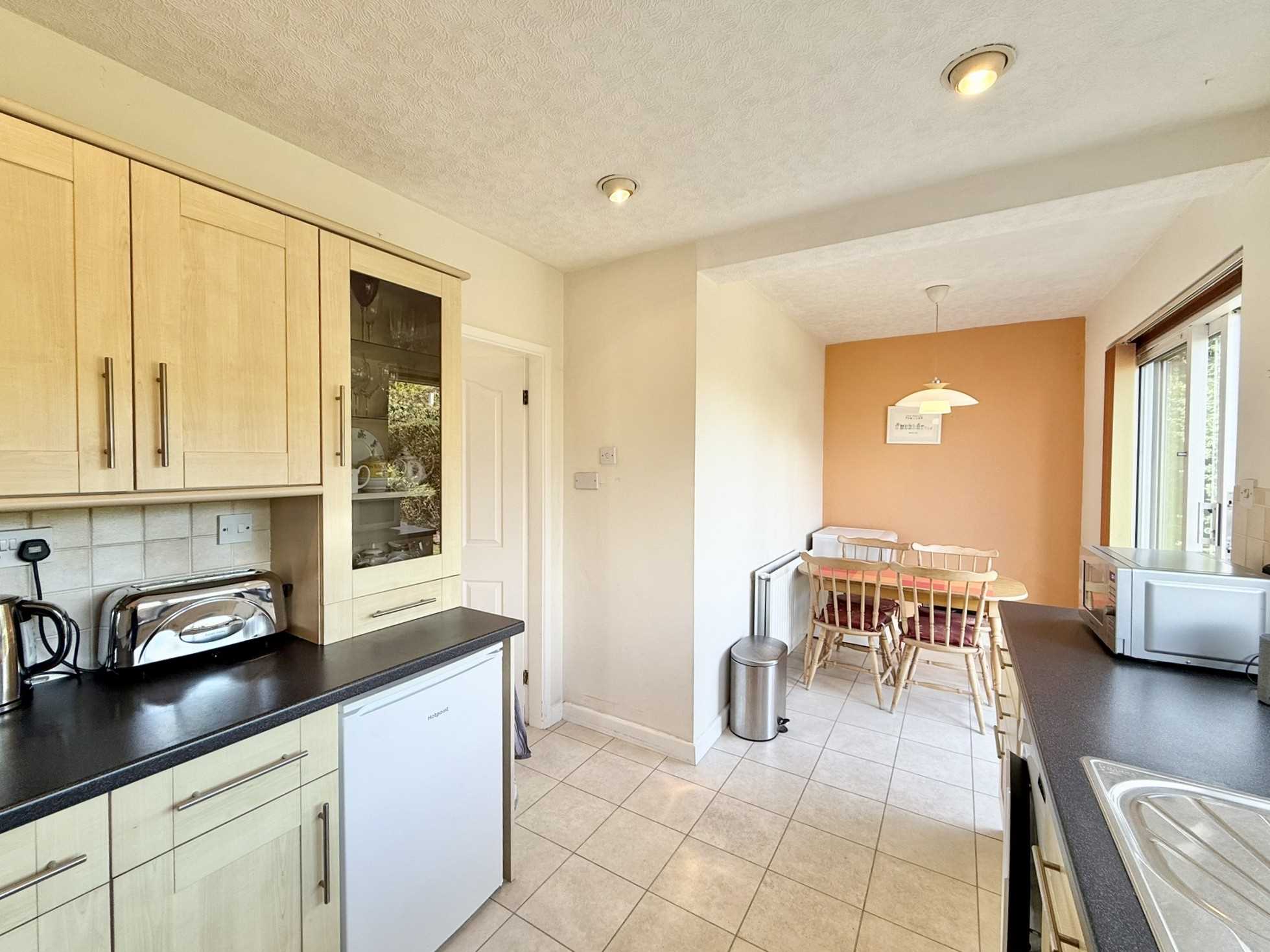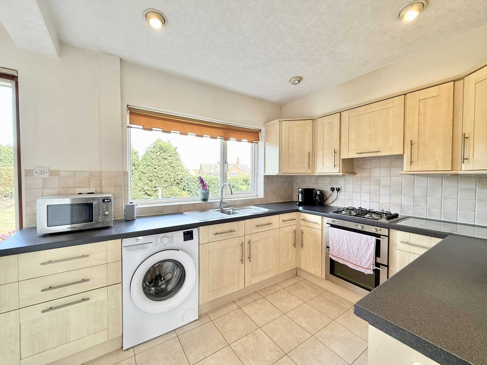 UPVC double glazed window and sliding patio door to rear aspect, ceiling spotlights, ceiling light pendant, a range of wall, drawer, and base units, stainless steel sink and drainer unit with mixer tap over, space for a washing machine, space for an under counter fridge, integrated electric oven, four ring gas hob with extractor over, radiator, tiled flooring.