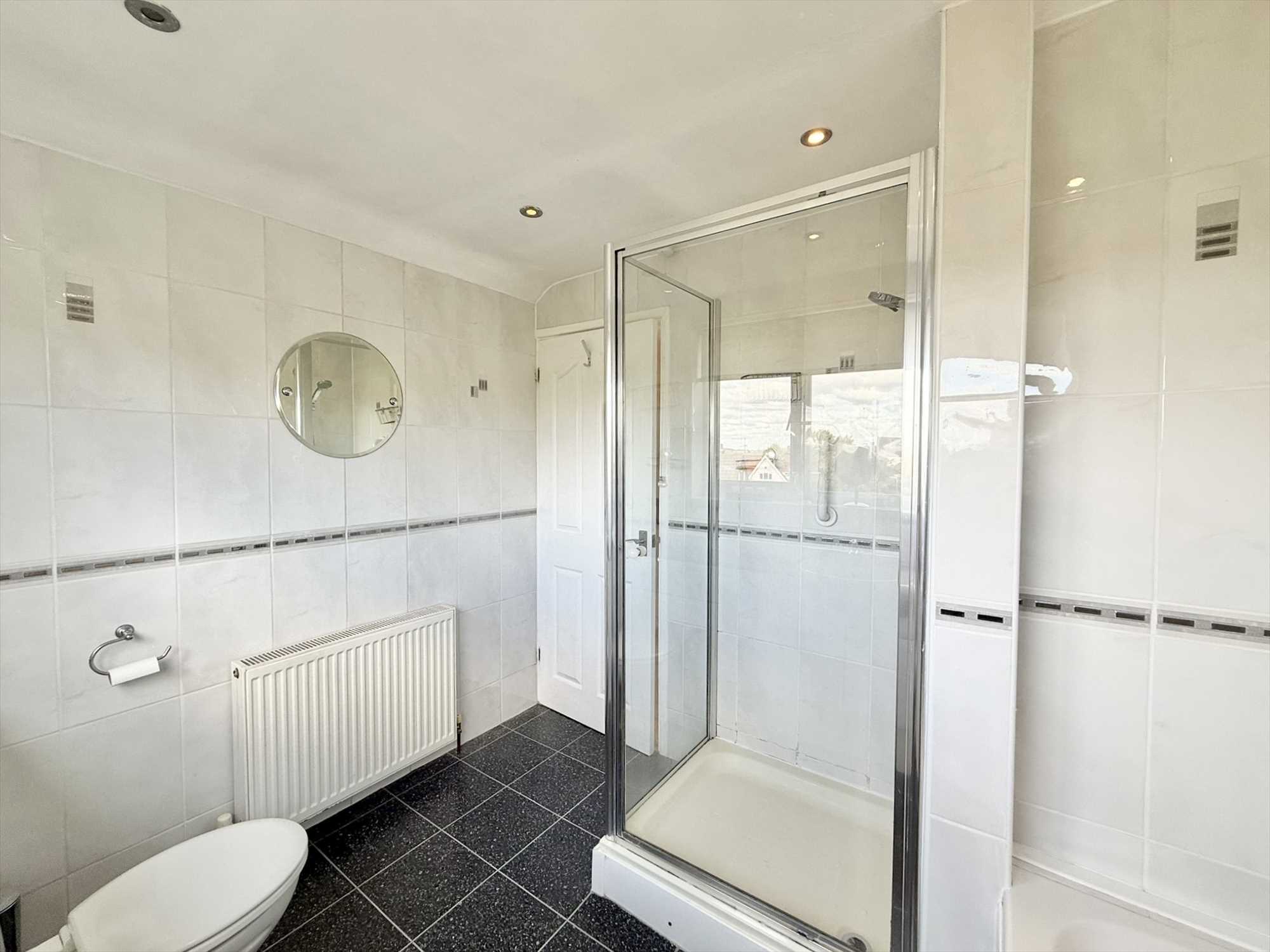 UPVC obscure double glazed window to rear aspect, ceiling spotlights, fully tiled walls, low level flush WC, vanity hand wash basin, panelled bath, enclosed shower unit, radiator, tiled flooring.