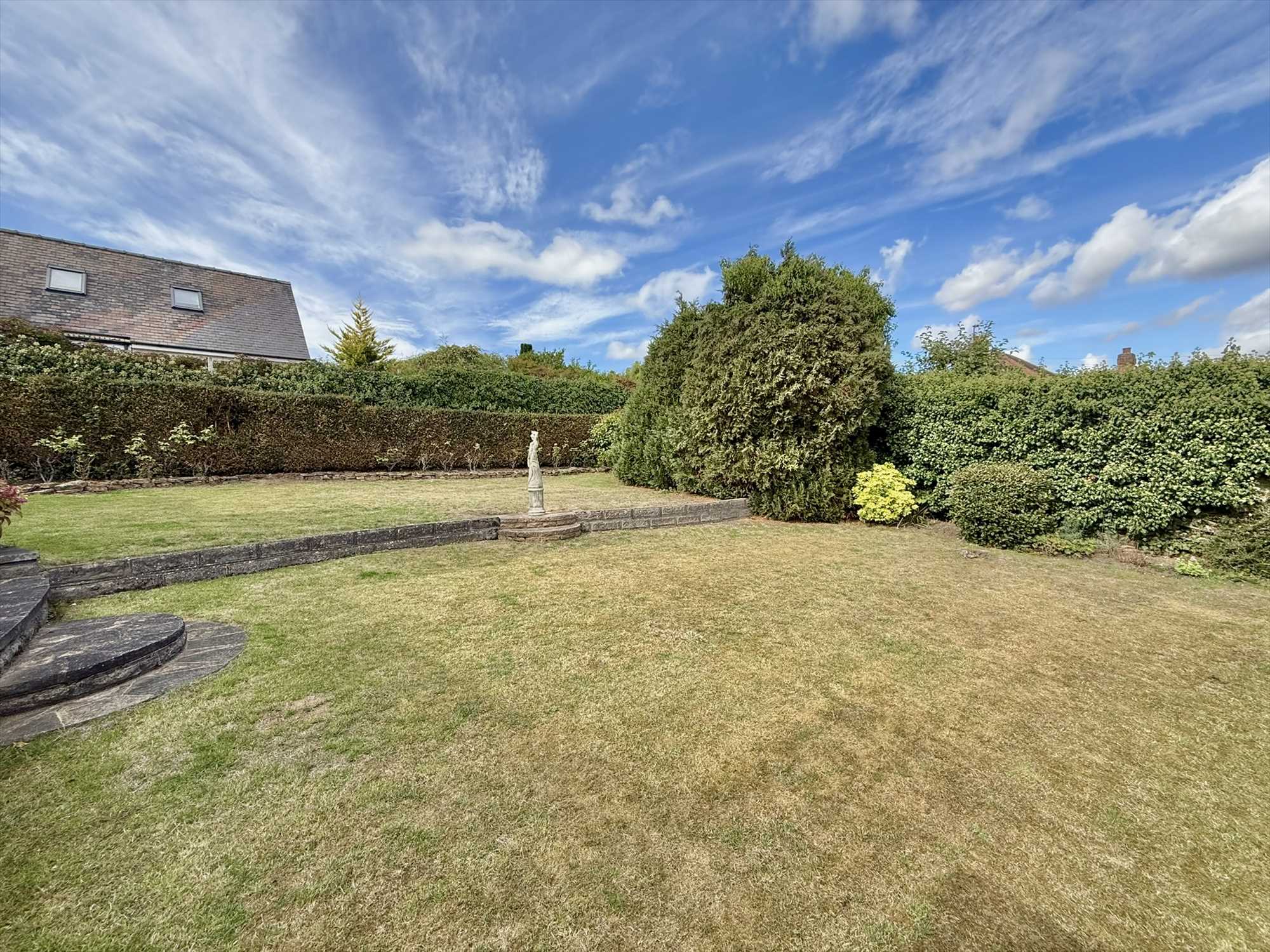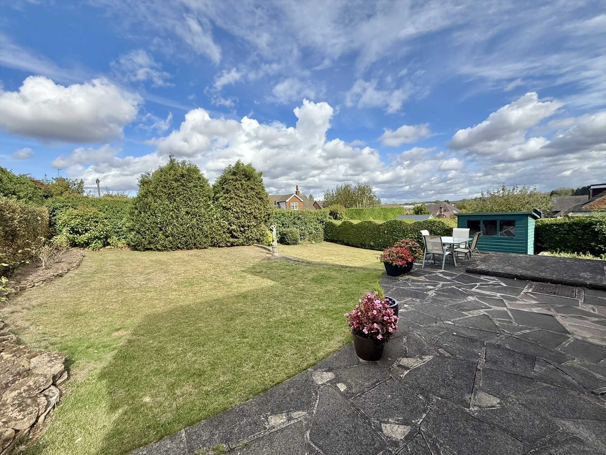 The rear garden is fully enclosed by mature hedges and timber fencing and features a well kept lawn, established borders with shrubs and trees, and a generous patio are perfect for entertaining or providing a sunny spot to relax. The garden further benefits from a timber shed, access to the garage via a personnel door, and a side gate giving access to the front of the property.
