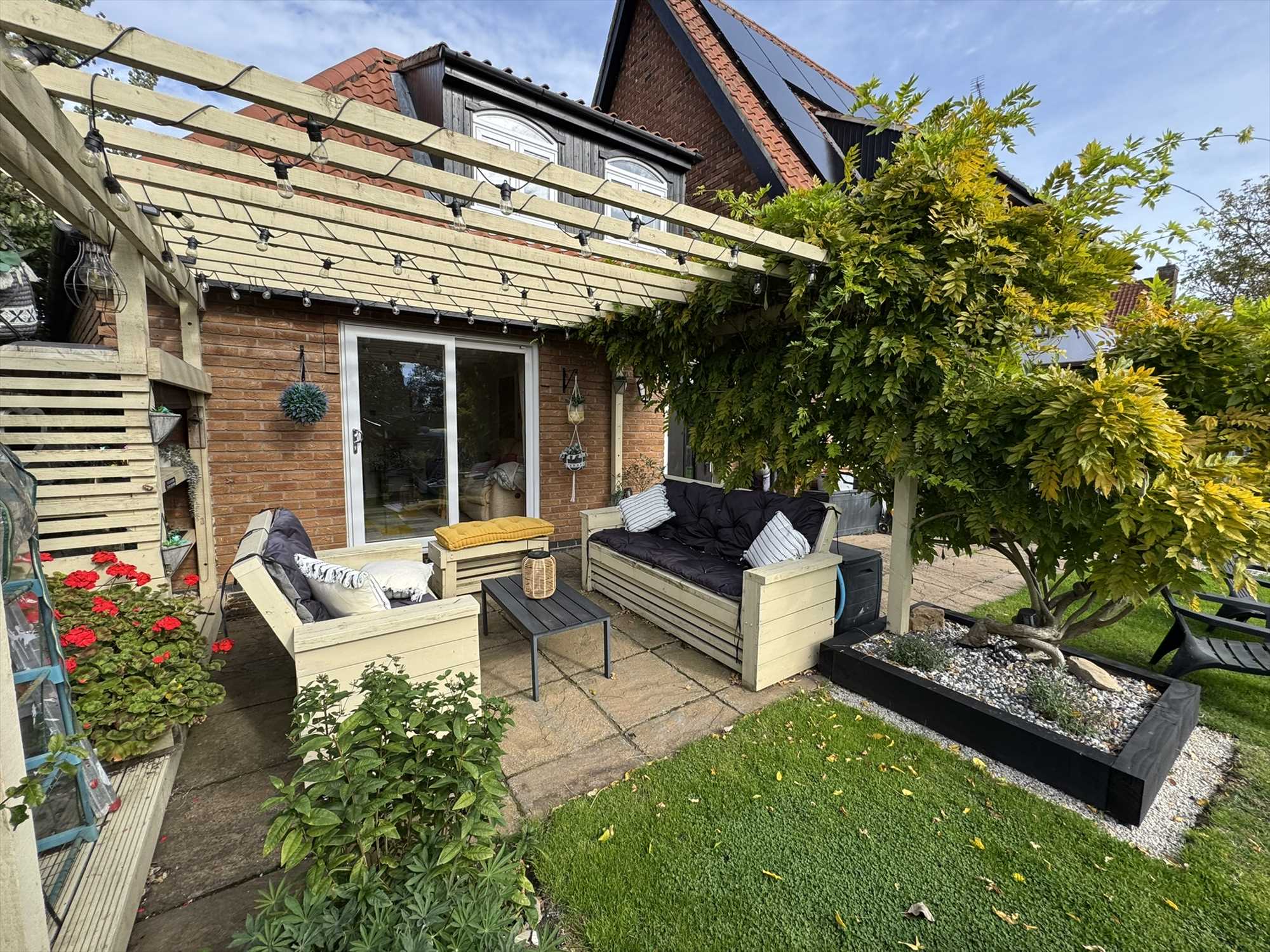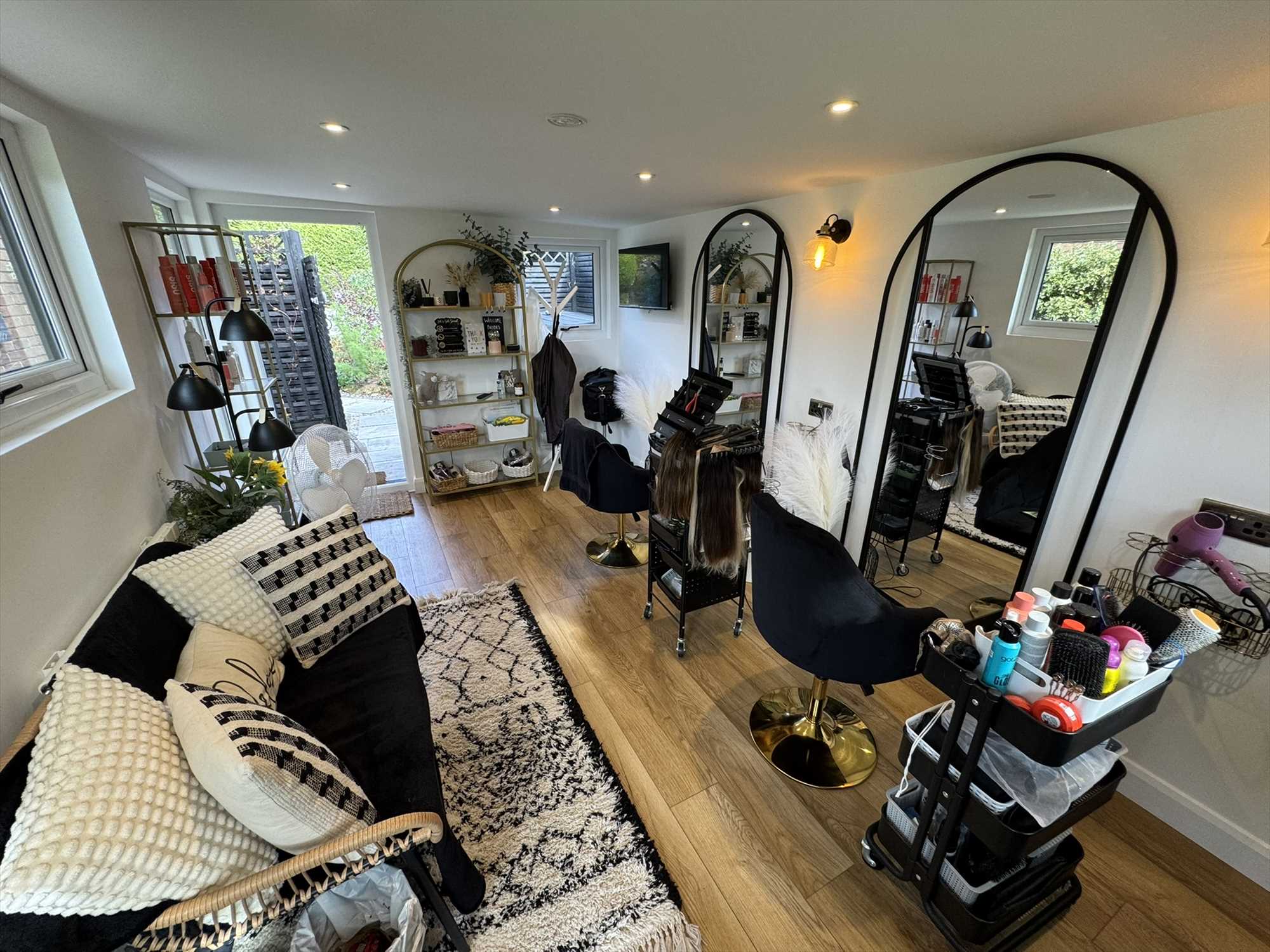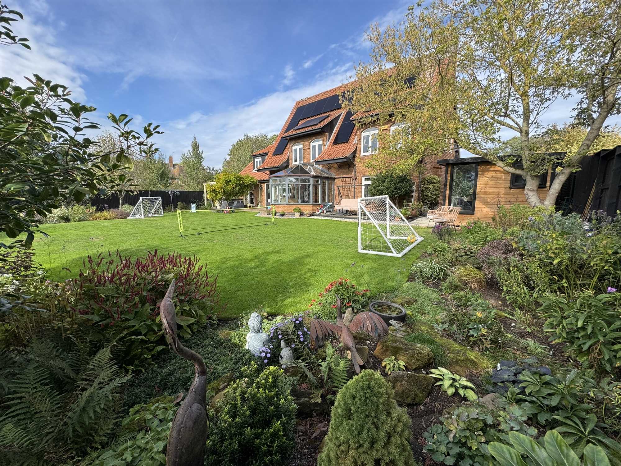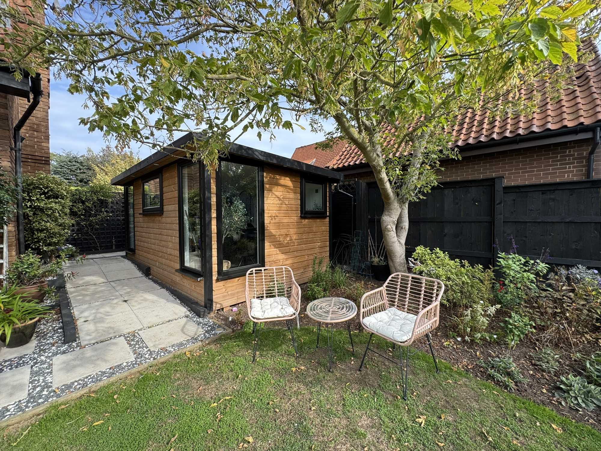 Externally, the south-west facing rear garden is a true highlight- tastefully landscaped and thoughtfully planted with a variety of mature trees and shrubs providing colour and interest all year round. The space offers both peaceful corners for relaxation and a generous lawn for family activities. A section of the patio is reserved exclusively for the annexe, giving its occupants a secluded outdoor retreat. The garden also includes a fully powered cabin with heating, currently used as a home hairdressing salon but suitable for a variety of uses such as a home office or studio.