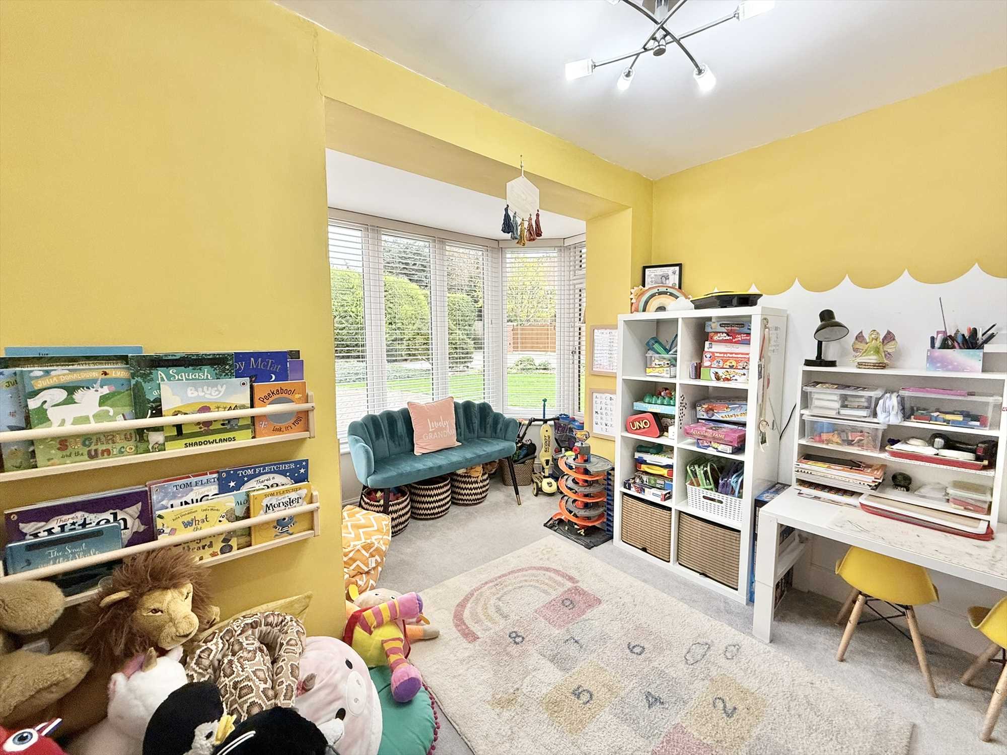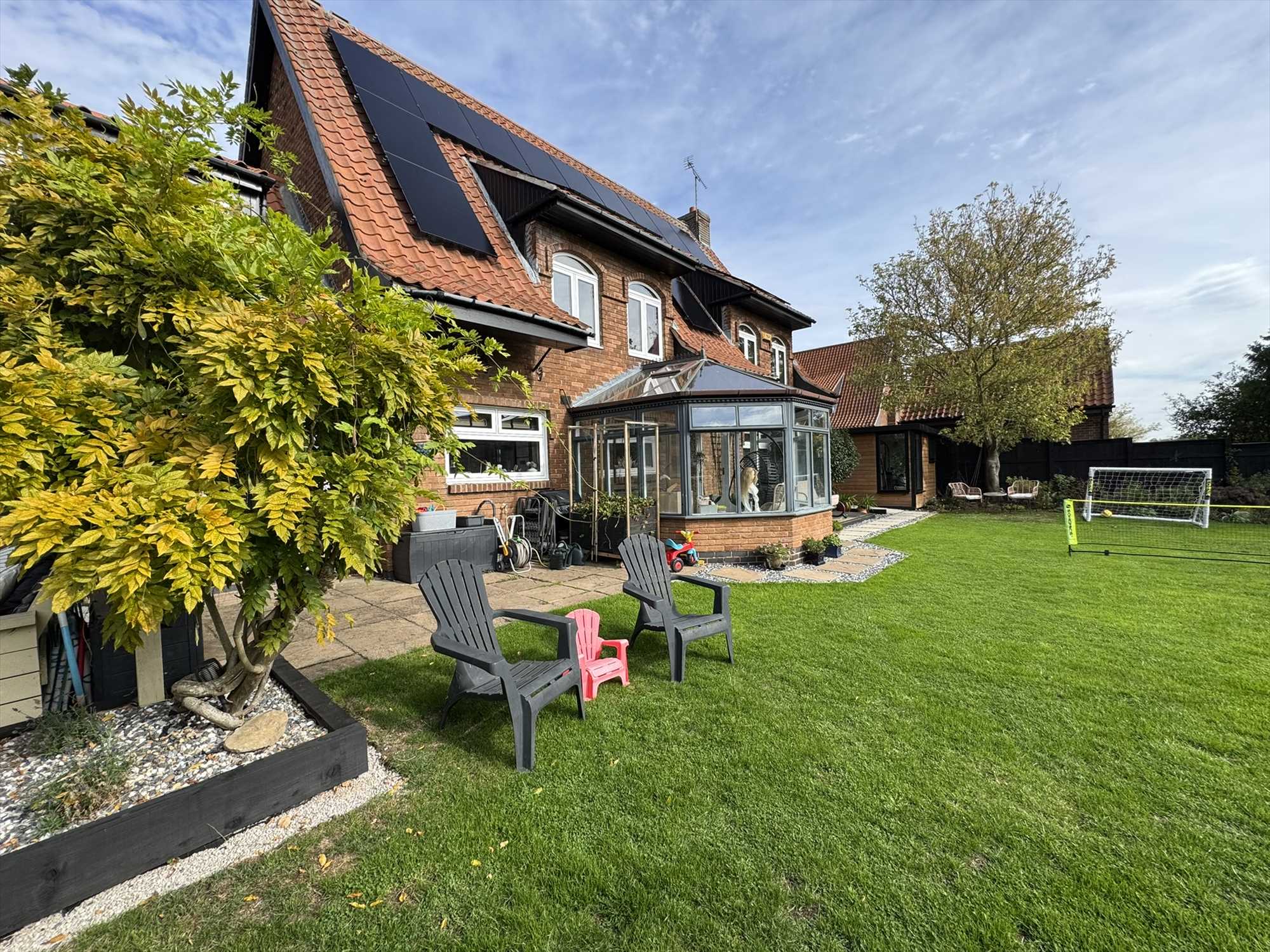 Upon entering, you are welcomed by a bright and inviting entrance hallway leading to a generous dual-aspect living room featuring a charming log-burning stove. There is also a light-filled playroom or additional reception space, a stylish downstairs WC, and a stunning open-plan kitchen and dining area positioned to the rear of the property. The kitchen is fitted with quality units, integrated appliances, and enjoys views across the landscaped garden, making it perfect for family gatherings and entertaining. A conservatory and a practical utility room complete the ground floor accommodation.