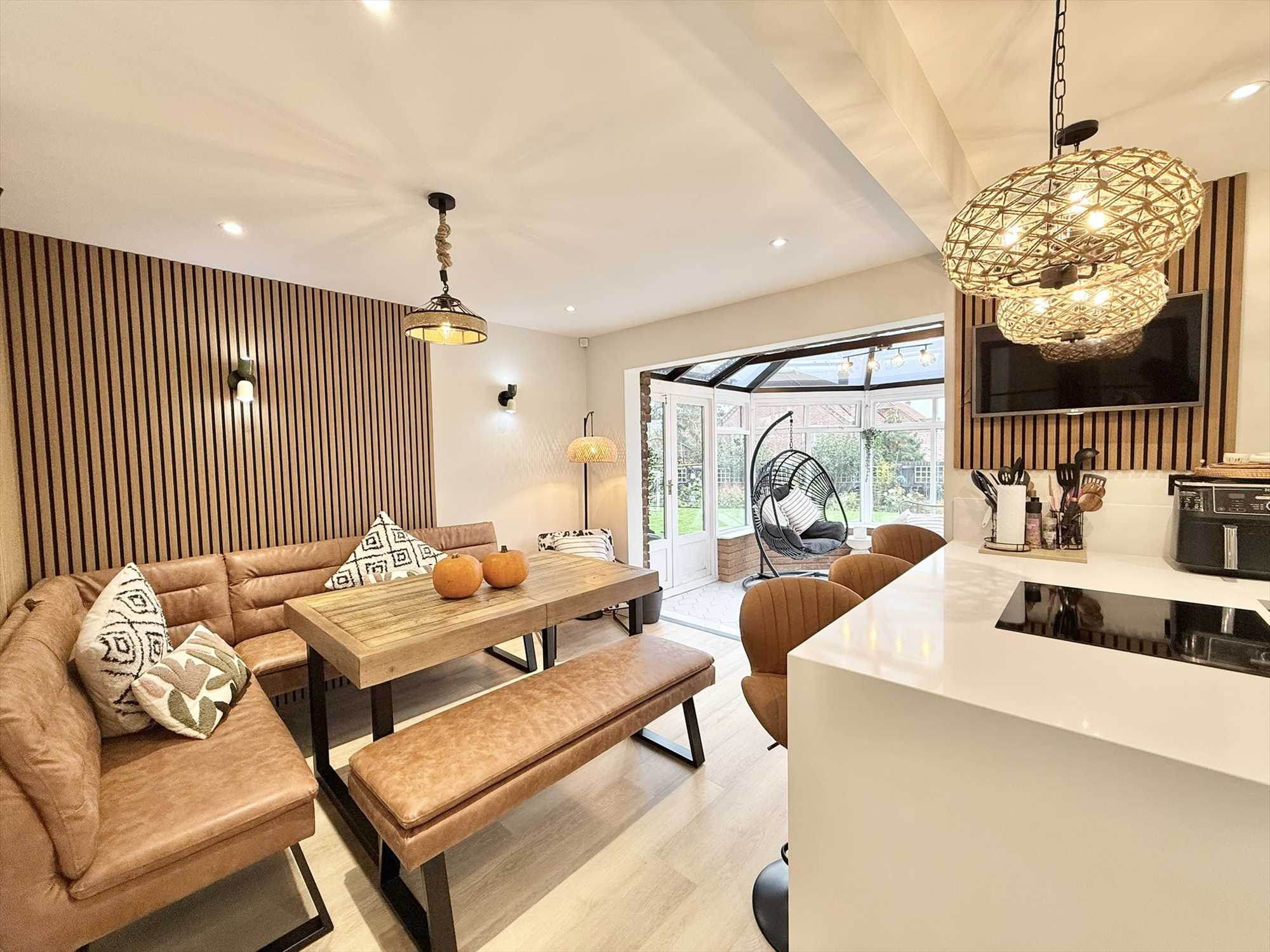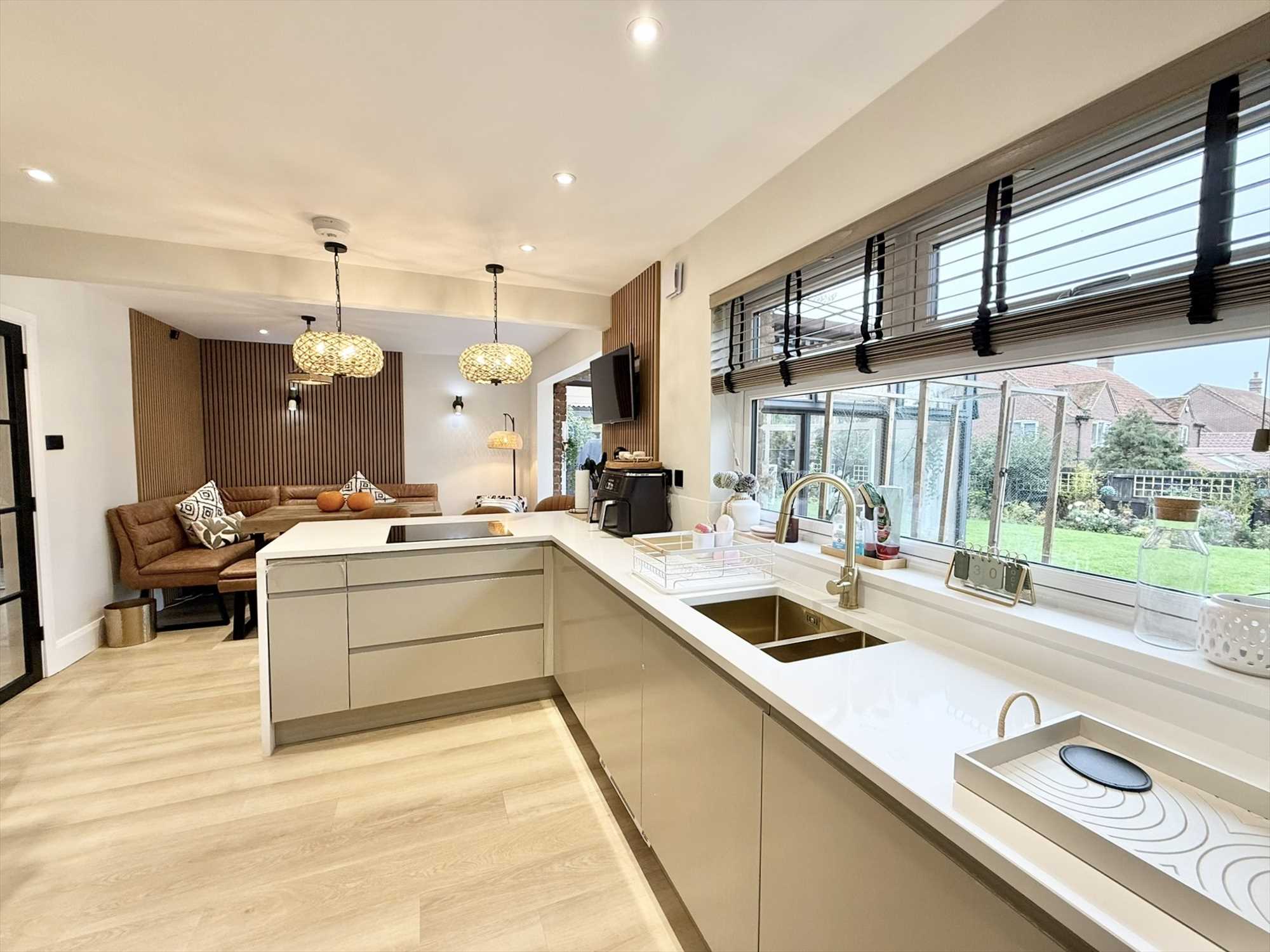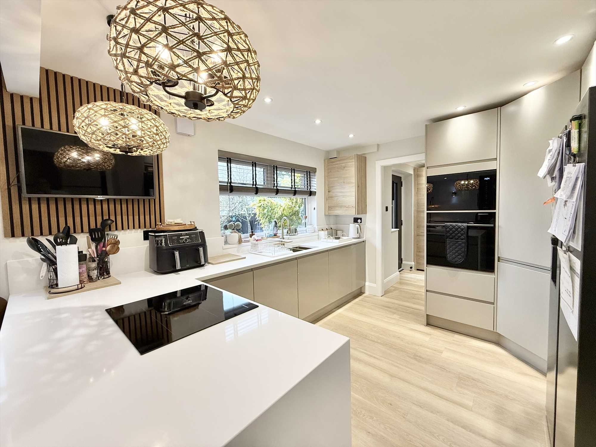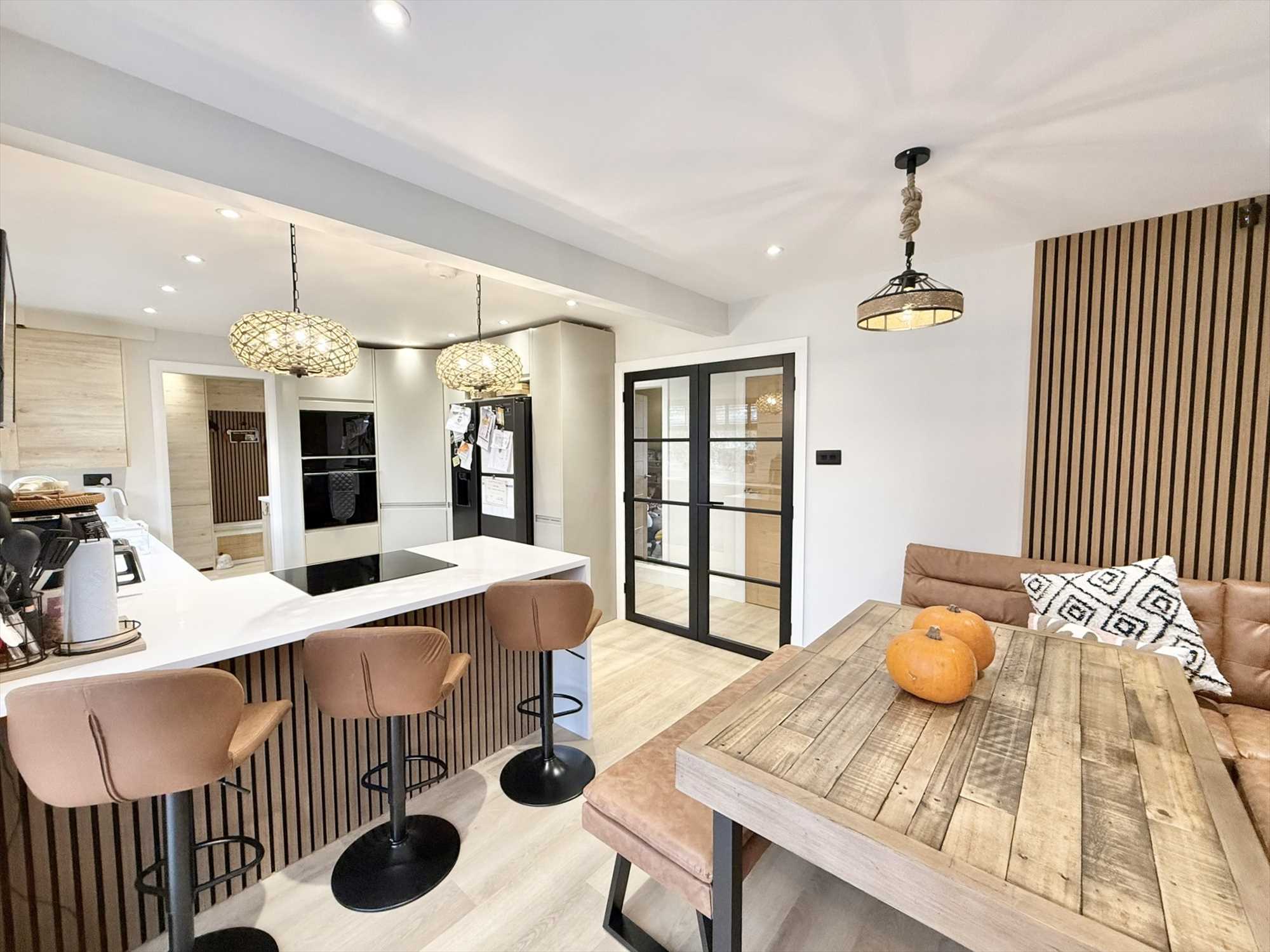 Double glazed window to rear aspect, ceiling spotlights, feature pendant lights, wall lights, a range of contemporary wall, drawer, and base units with breakfast bar and quartz worktop, under mount one and a half sink with mixer tap over, four ring electric hob, integrated microwave, integrated oven, integrated dishwasher, space for an American style fridge freezer, wood effect flooring.