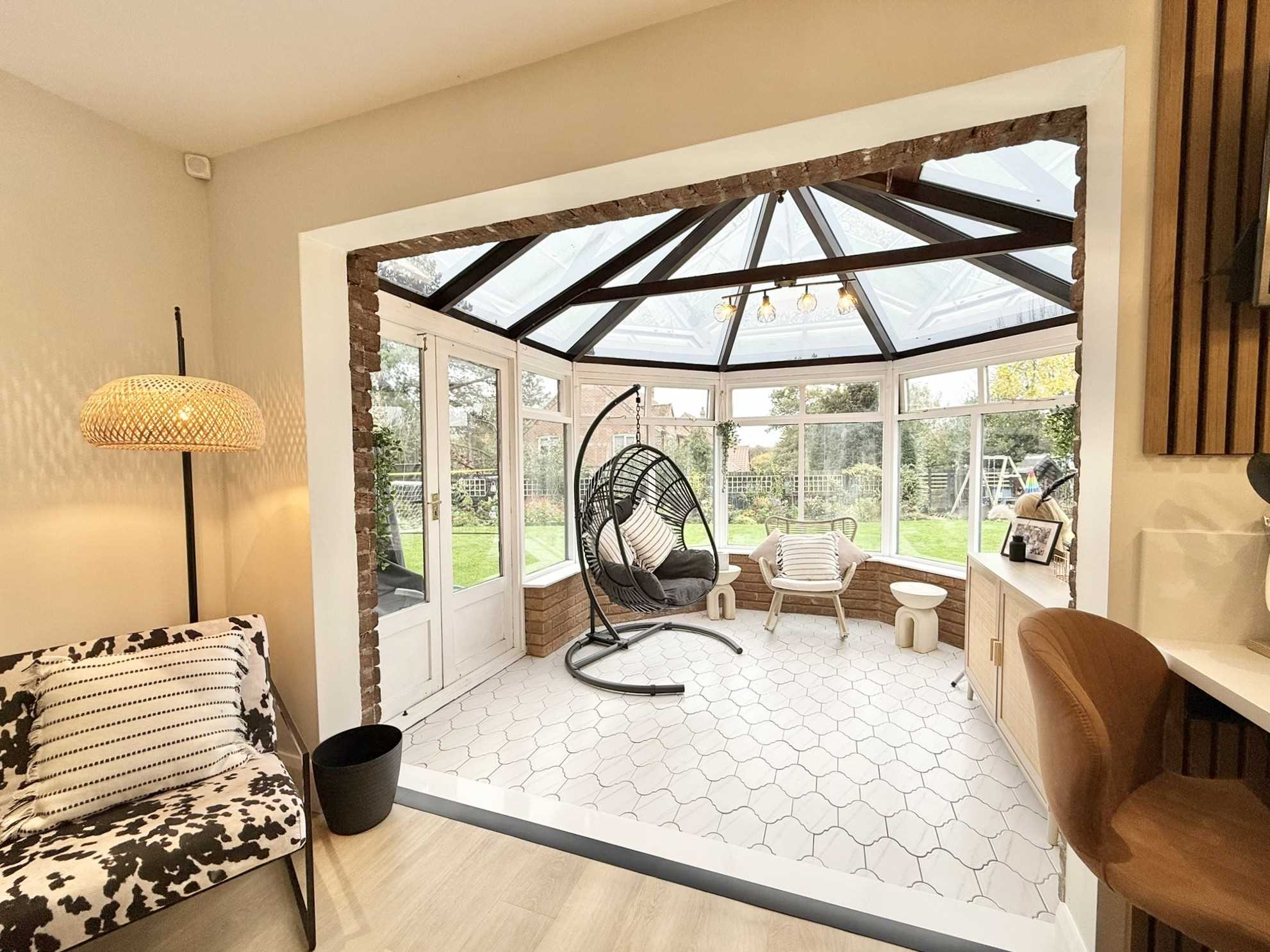 Double glazed windows, double glazed roof, double glazed french doors leading out to the patio, ceiling light fitting, radiator, tiled floor.
