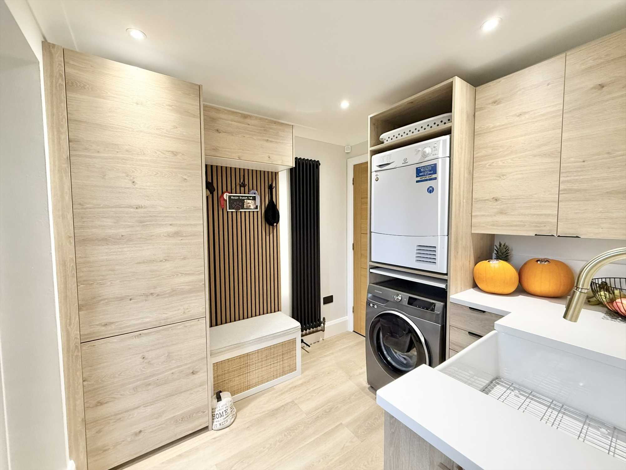 Exterior door with obscure double glazed panels to rear aspect, ceiling spotlights, a range of wall, drawer, and base units, Belfast sink with mixer tap over, space for a washing machine, space for a tumble dryer, radiator, wood effect flooring.