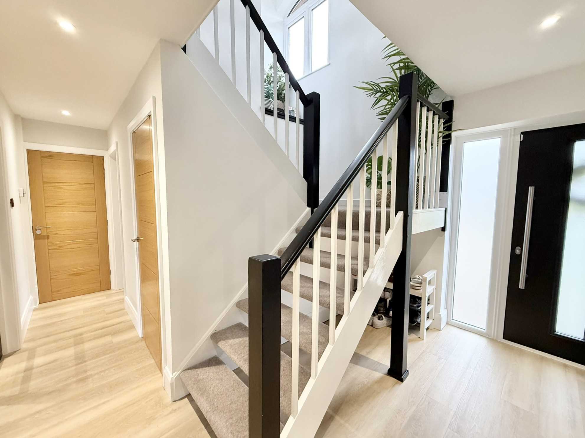 Exterior door with double glazed obscure glass side panels to front aspect, ceiling spotlights, stairs to the first floor, radiator, wood effect flooring.