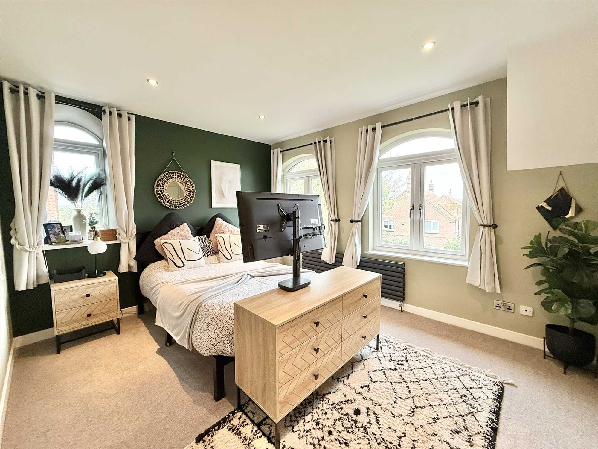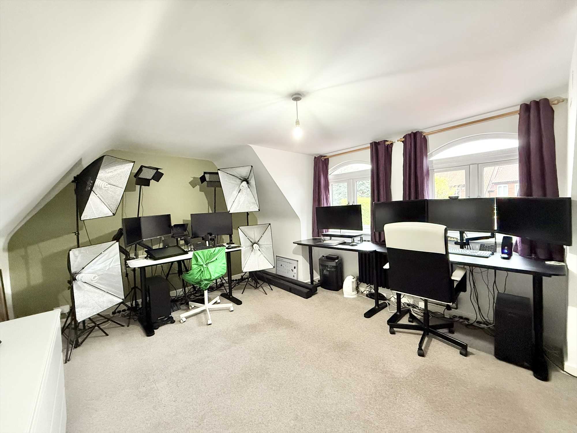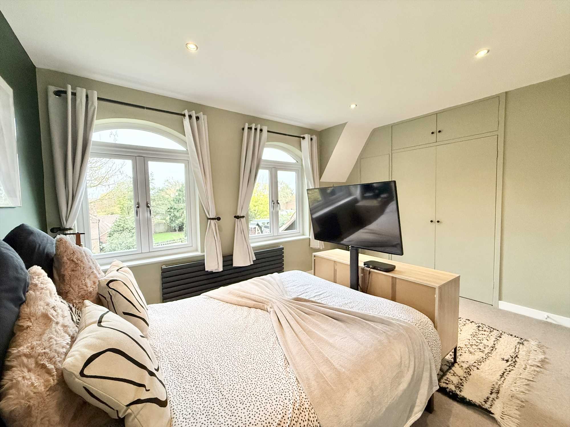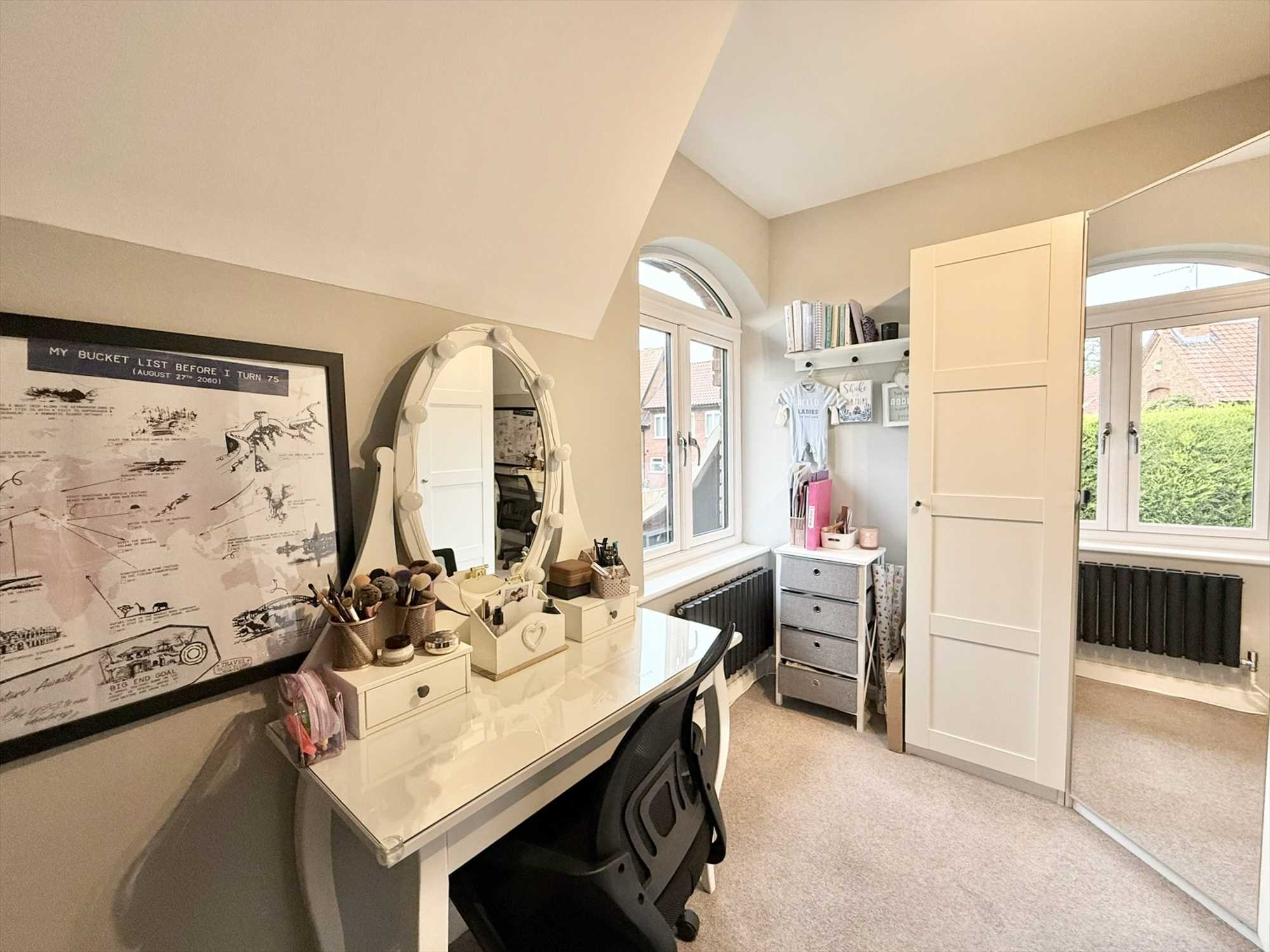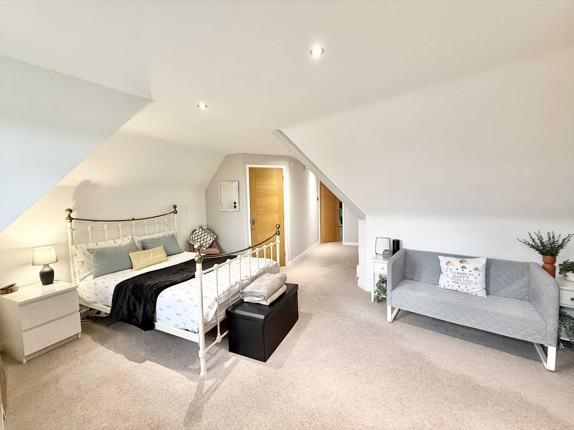 Double glazed ceiling spotlights, built in storage cupboard, access to eaves storage space, radiator, carpet, corridor leading to en-suite bathroom and home office space.
