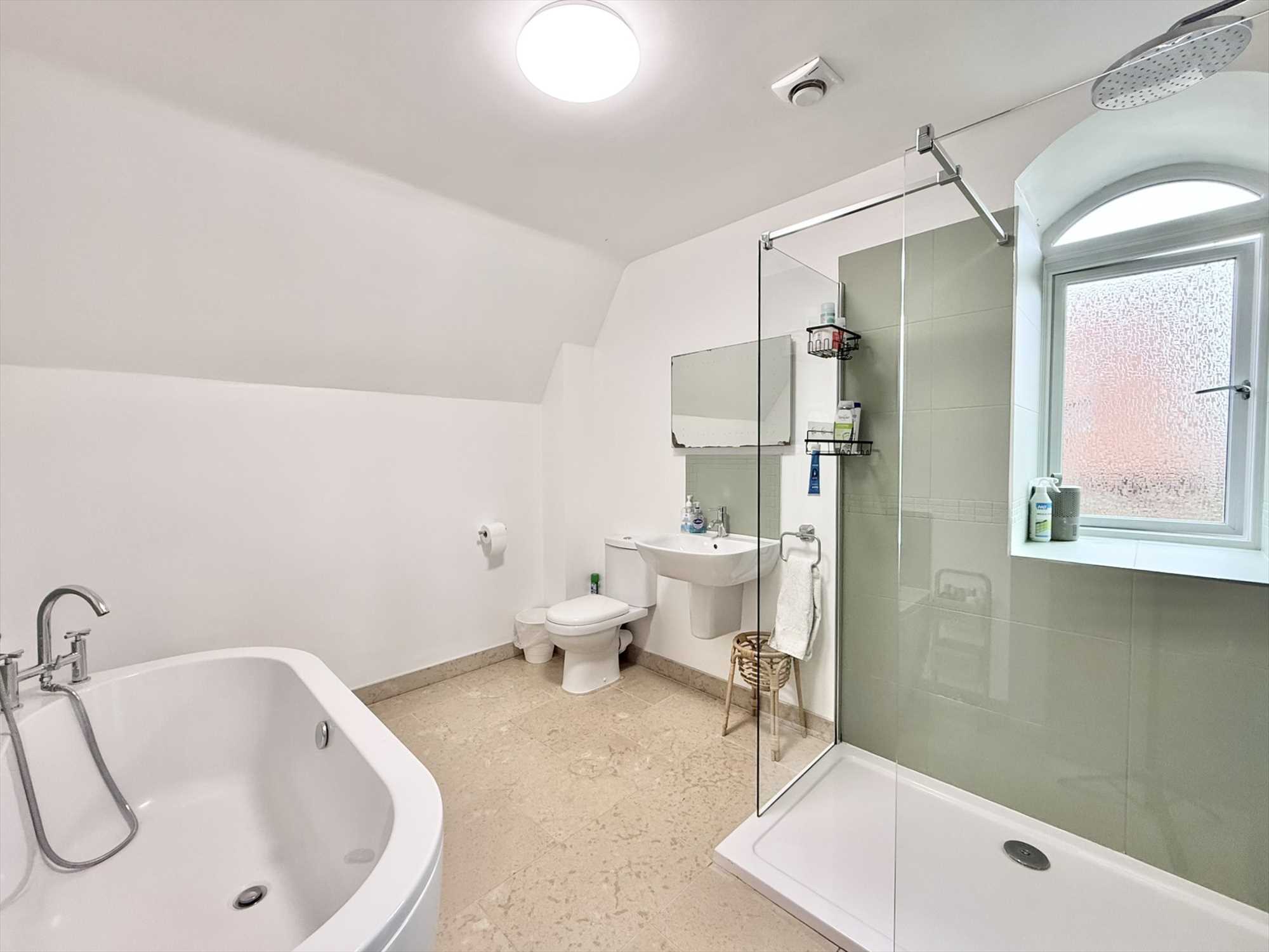 Obscure double glazed window to side aspect, ceiling light fitting, partially tiled walls, low level flush WC, pedestal hand wash basin, walk in double width shower with glass screen and dual shower head, curved back to wall bath, built in storage cupboard, chrome heated towel rail, tiled flooring.