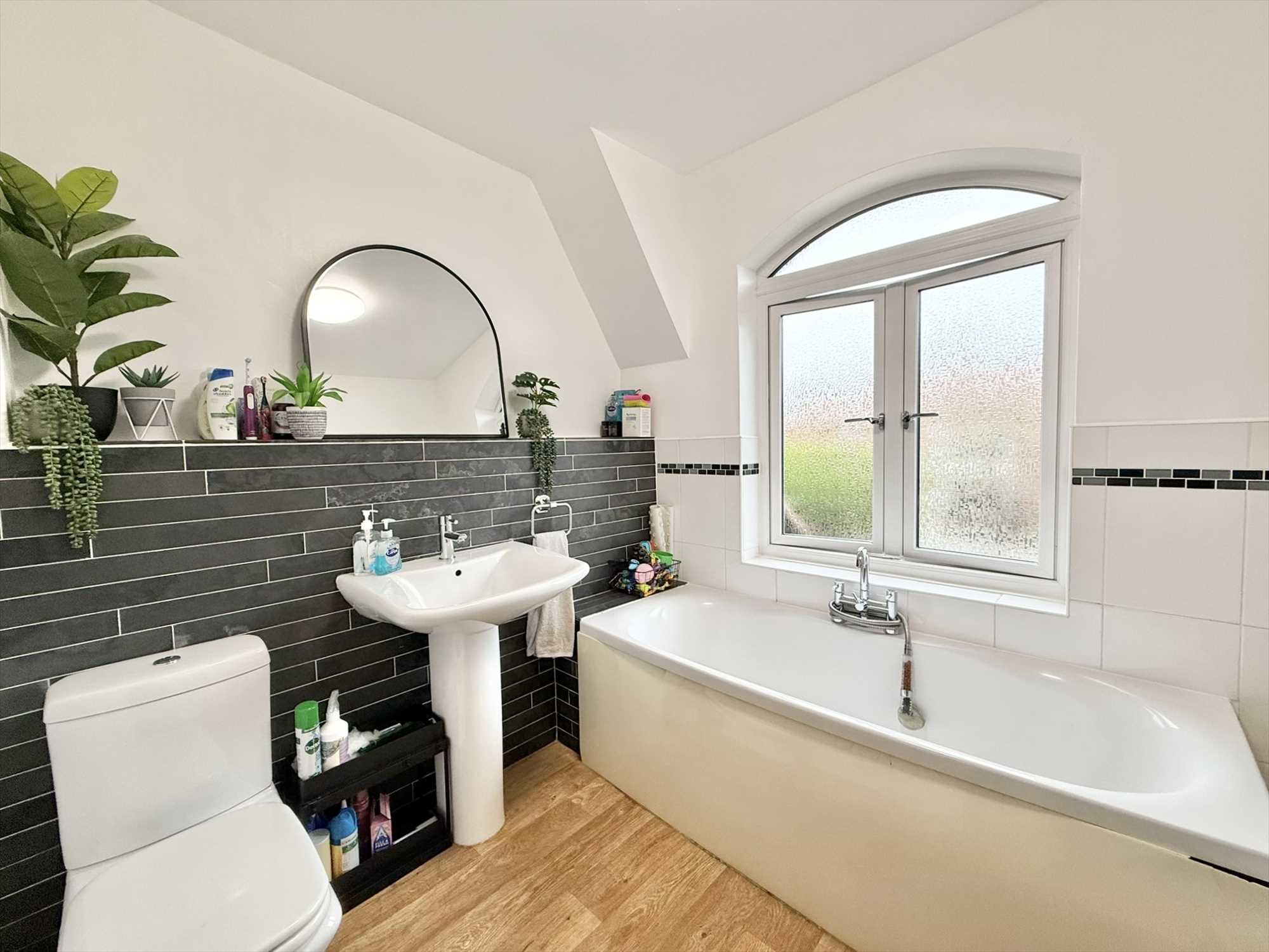 Obscure double glazed window to front aspect, ceiling light fitting, extractor fan, partially tiled walls, low level flush WC, pedestal hand wash basin, panelled bath, enclosed shower unit with sliding glass screen, chrome heated towel rail, shaver point, wood effect flooring.