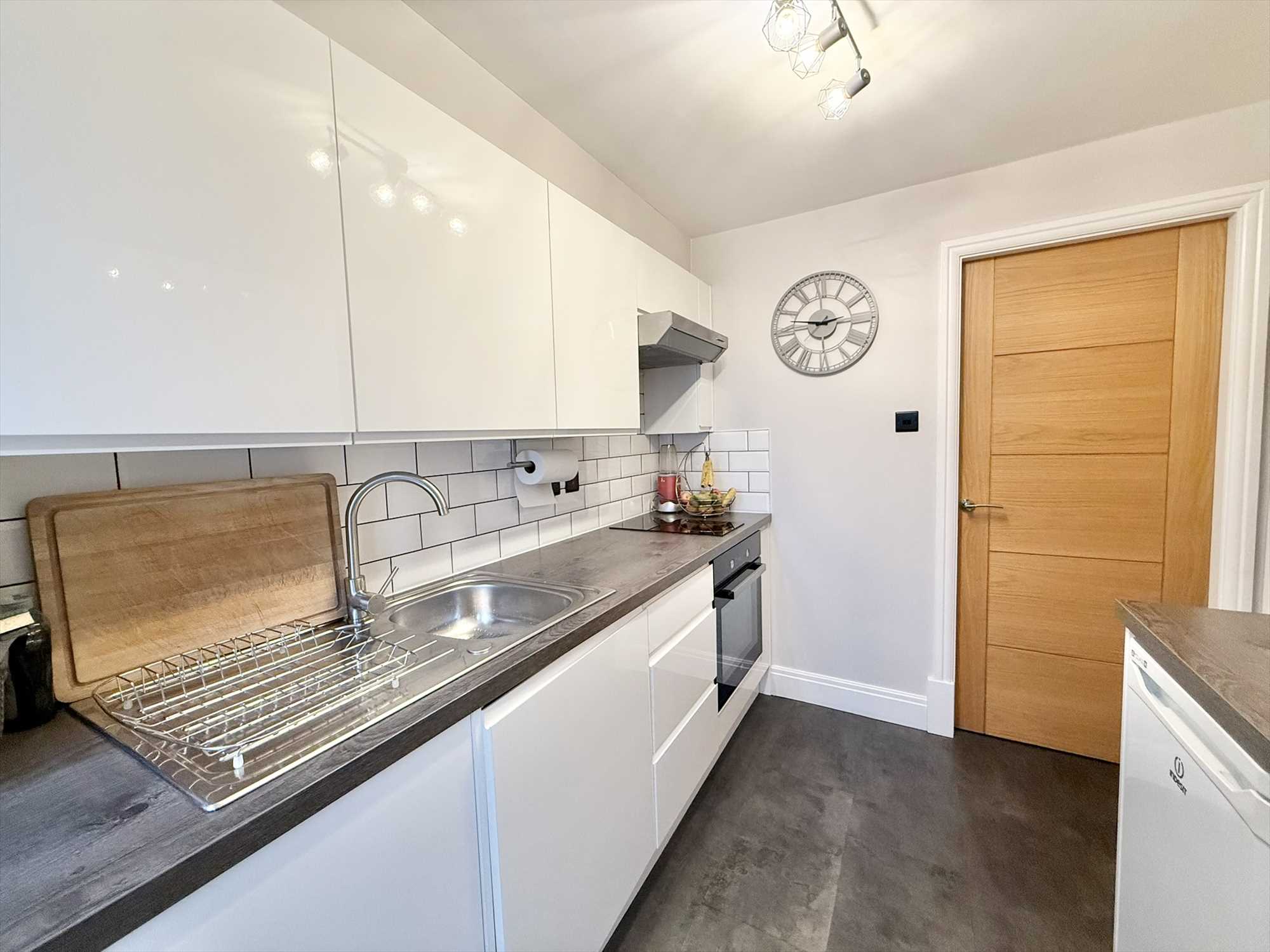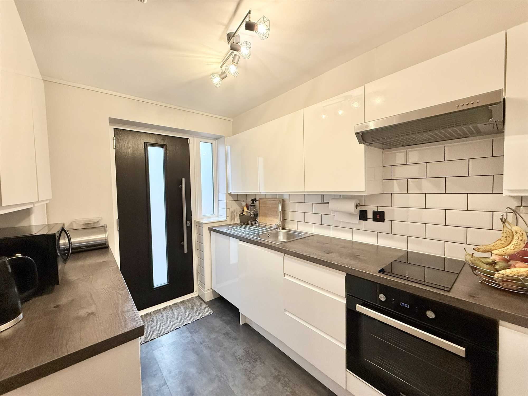 Exterior door with obscure double glazed side panel, ceiling light fitting, a range of white gloss wall, drawer, and base units with worktop over and tiled splash back, integrated oven, two ring electric hob with extractor hood over, stainless steel sink and drainer unit with mixer tap over, space for an under counter fridge, wood effect flooring.