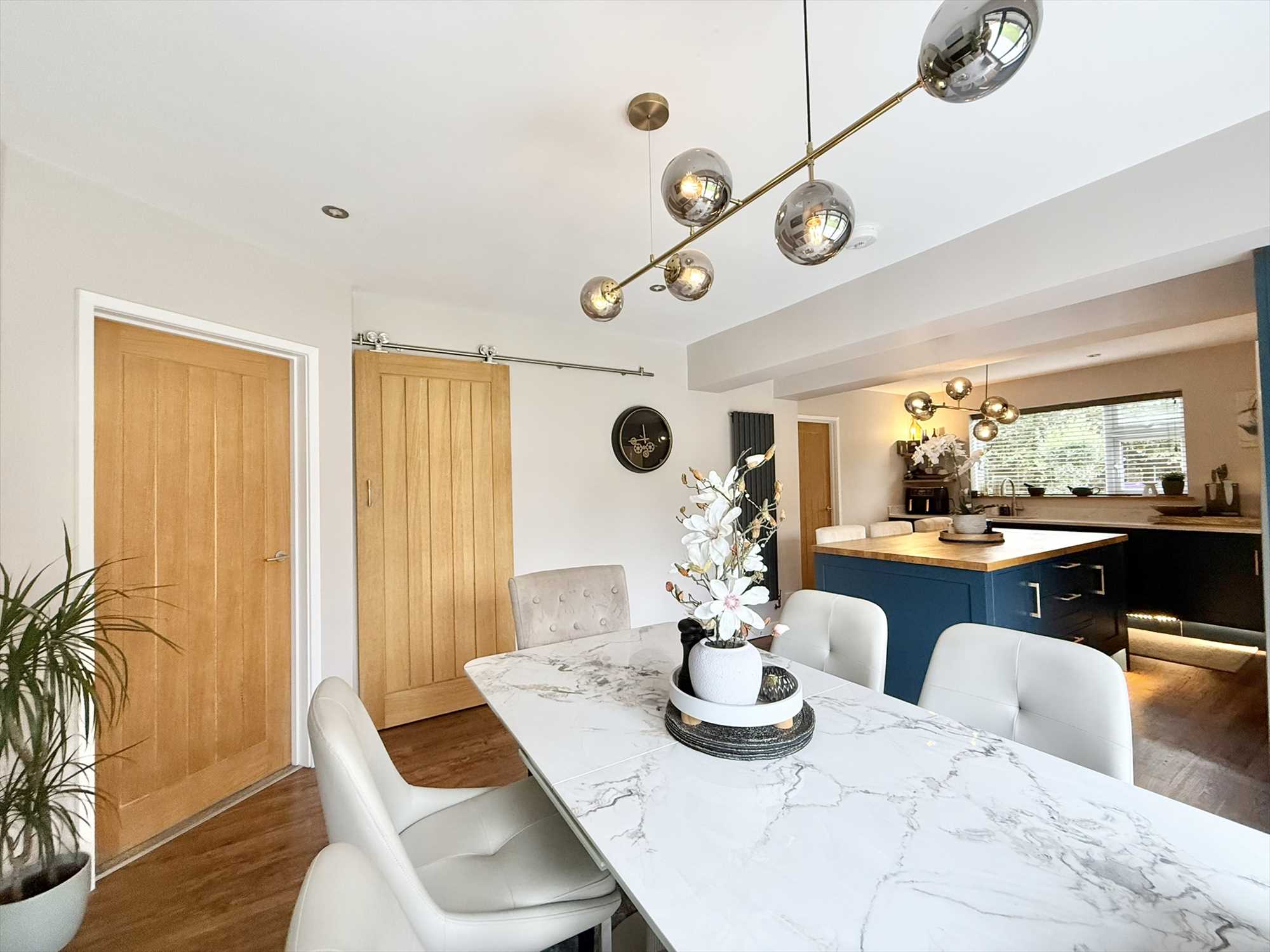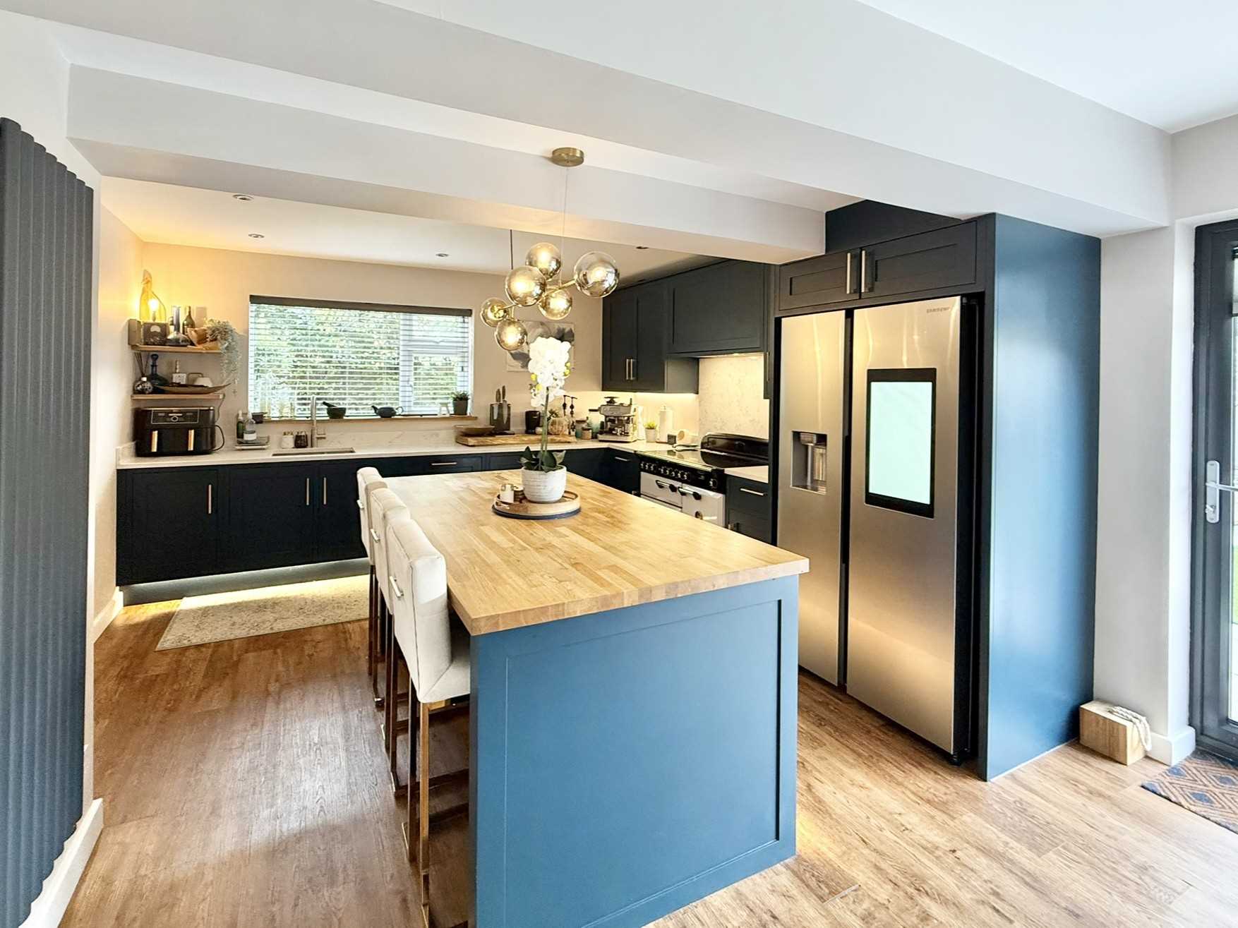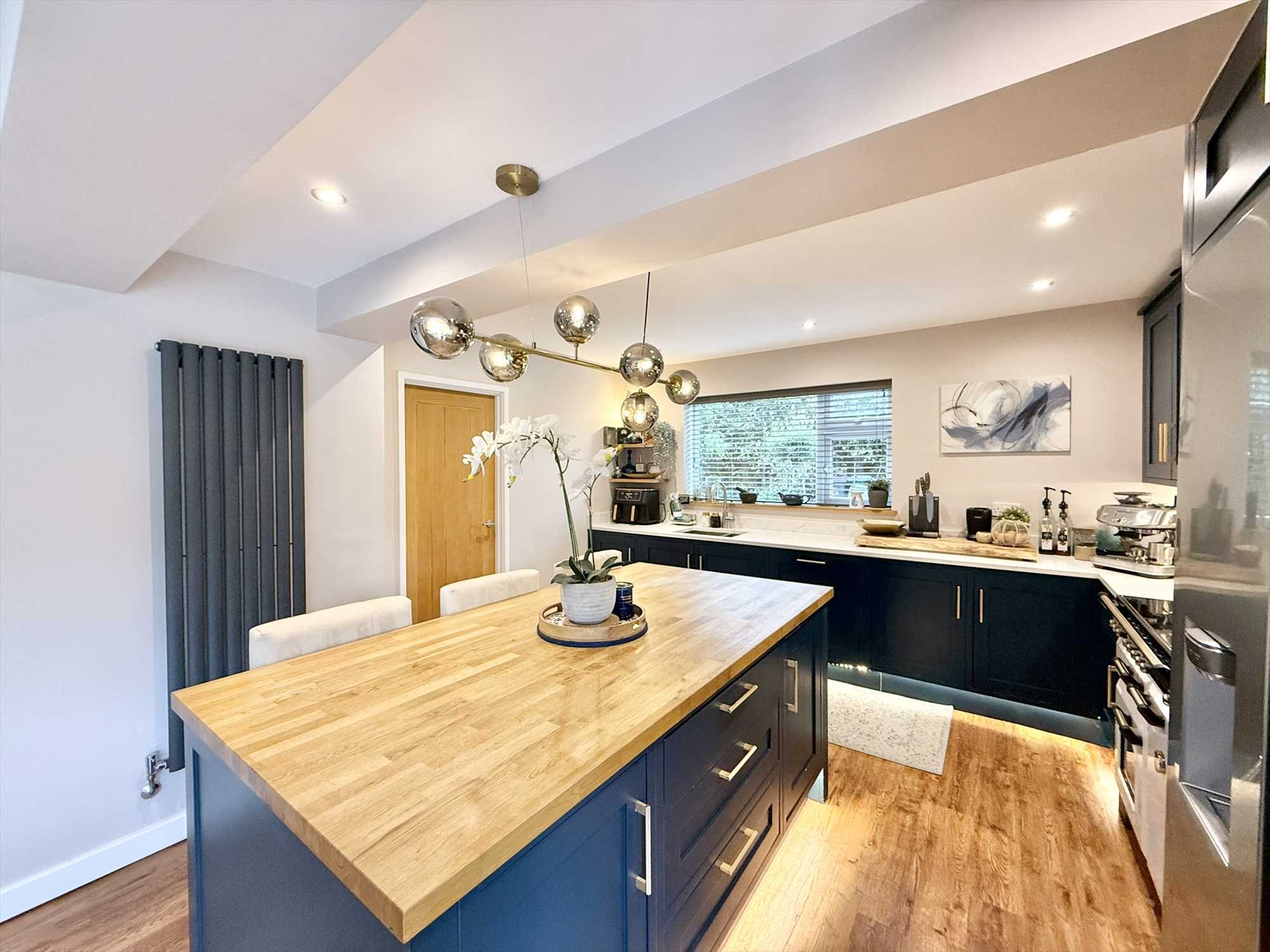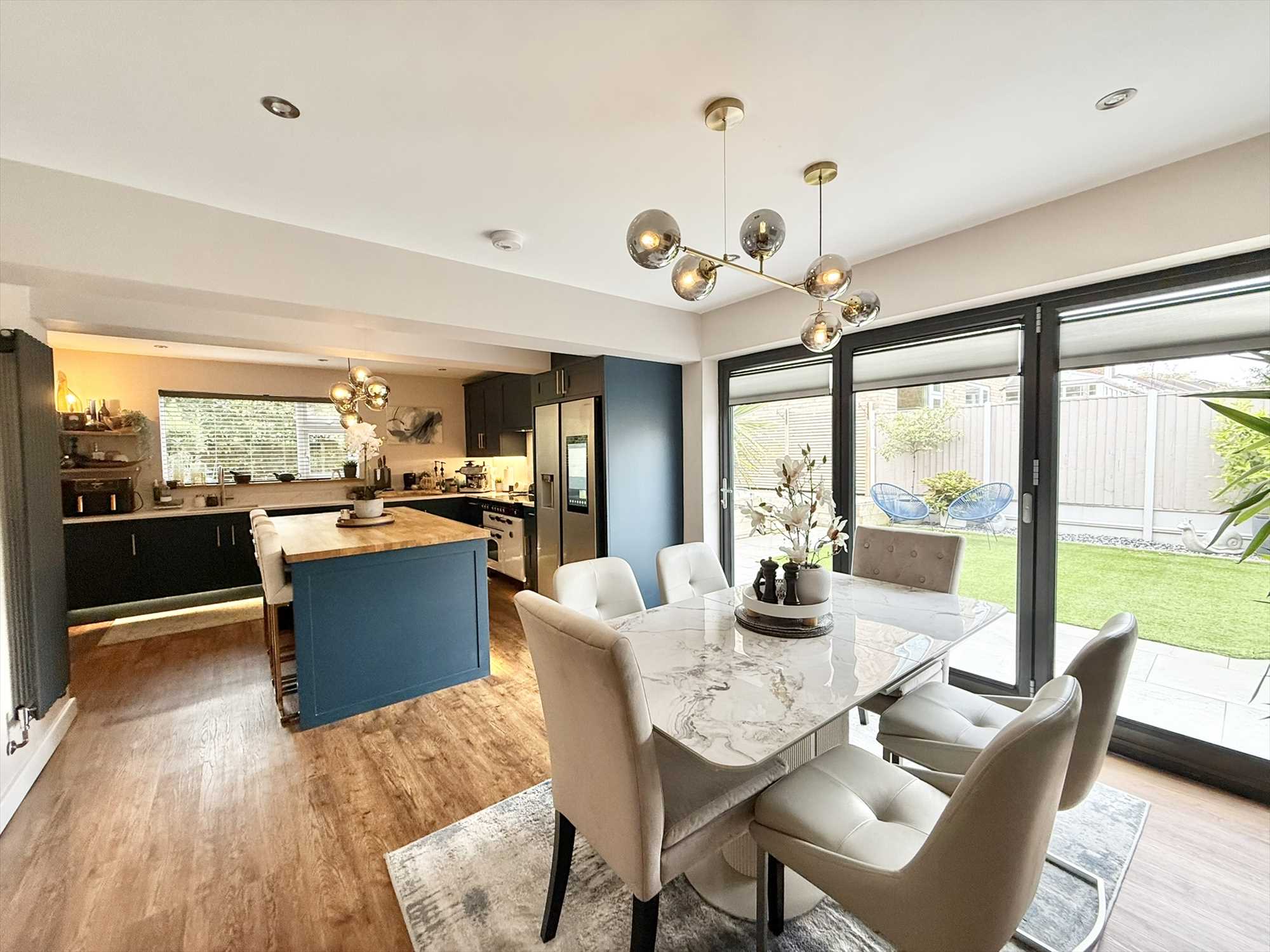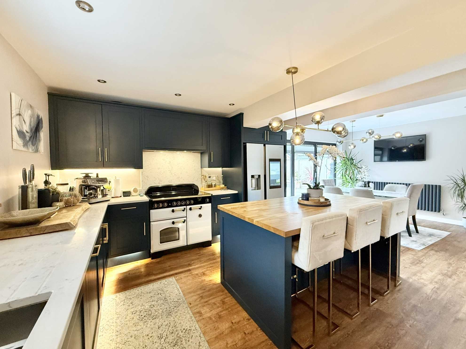 UPVC double glazed window to side aspect, UPVC double glazed bi fold doors to rear aspect, ceiling spotlights, two ceiling light fittings, a range of navy blue shaker style wall, drawer, and base units with marble effect worktop over, matching breakfast bar with wooden worktop, undermount stainless steel one and a half sink, integrated dishwasher, Rangemaster cooker with concealed extractor hood over, space for an American style fridge freezer, under cabinet strip lighting, two radiators, pantry with sliding oak door, LVT flooring.