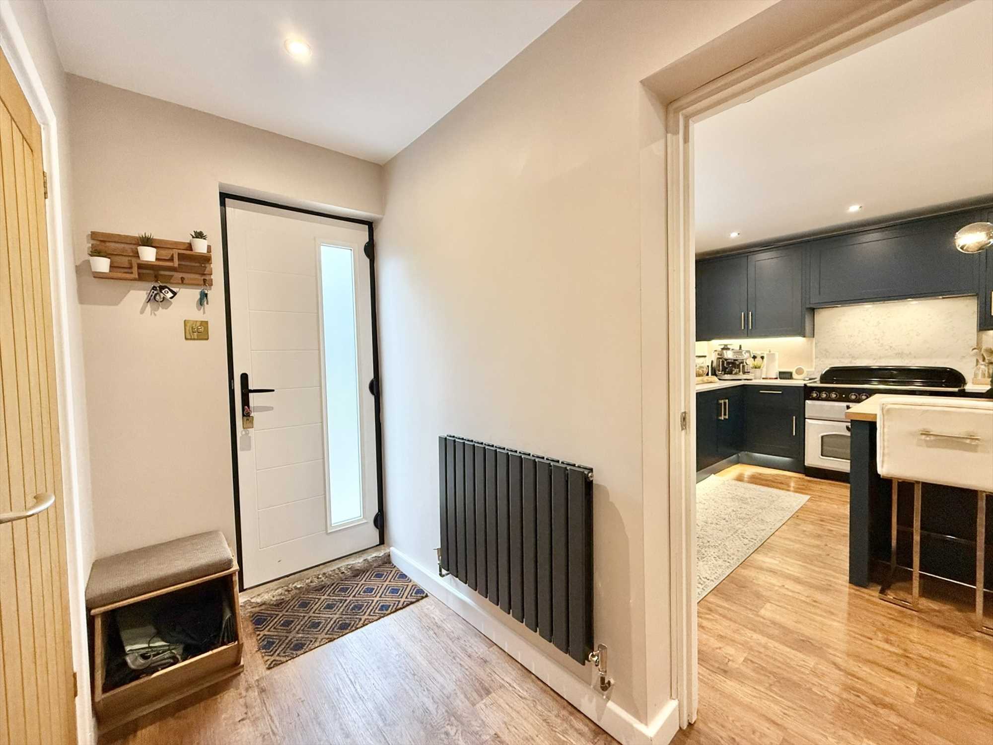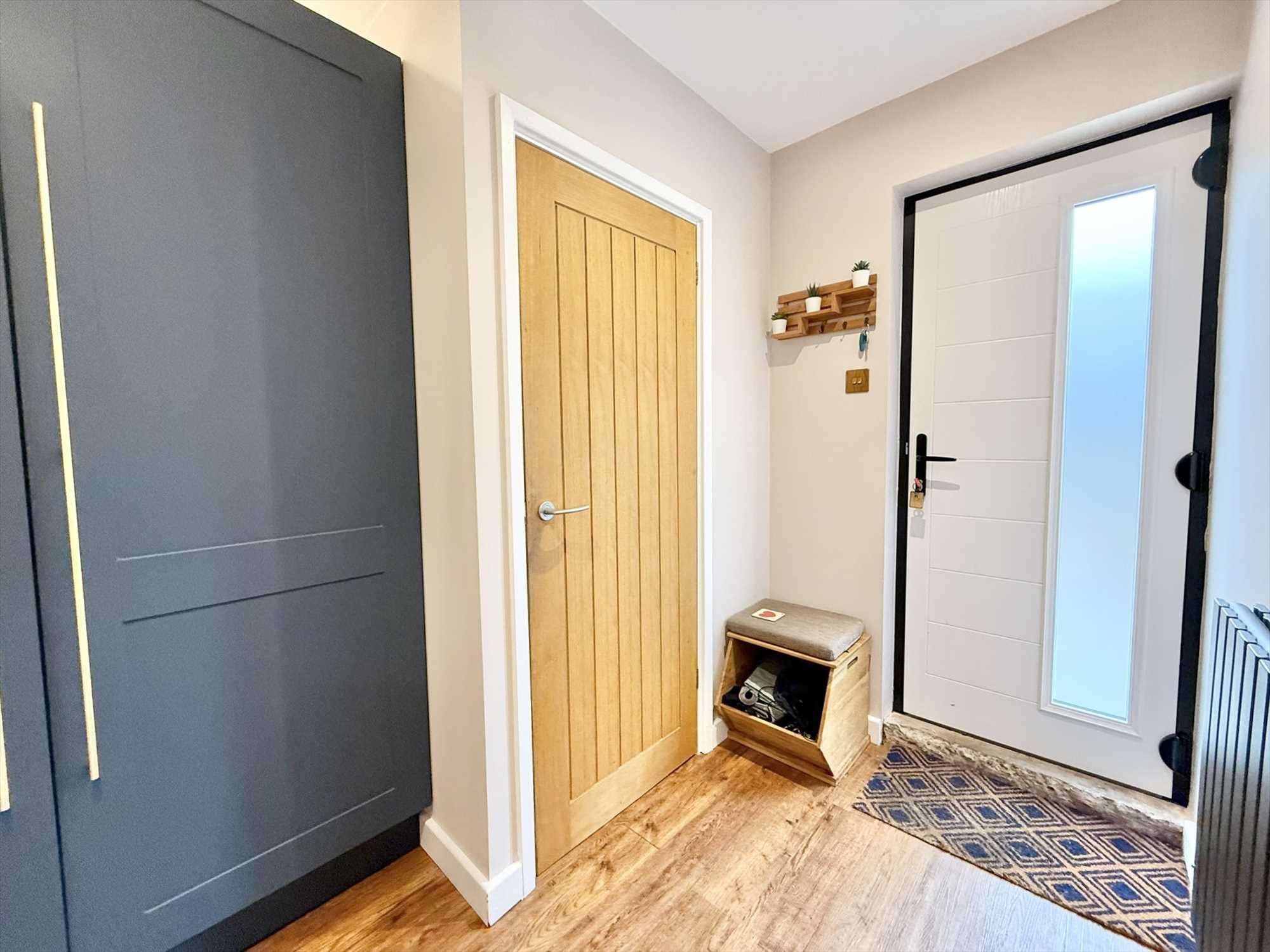 Composite door with obscure glass panels to side aspect, ceiling spotlights, built in storage cupboards with space and plumbing for a washing machine and tumble dryer, radiator, LVT flooring.