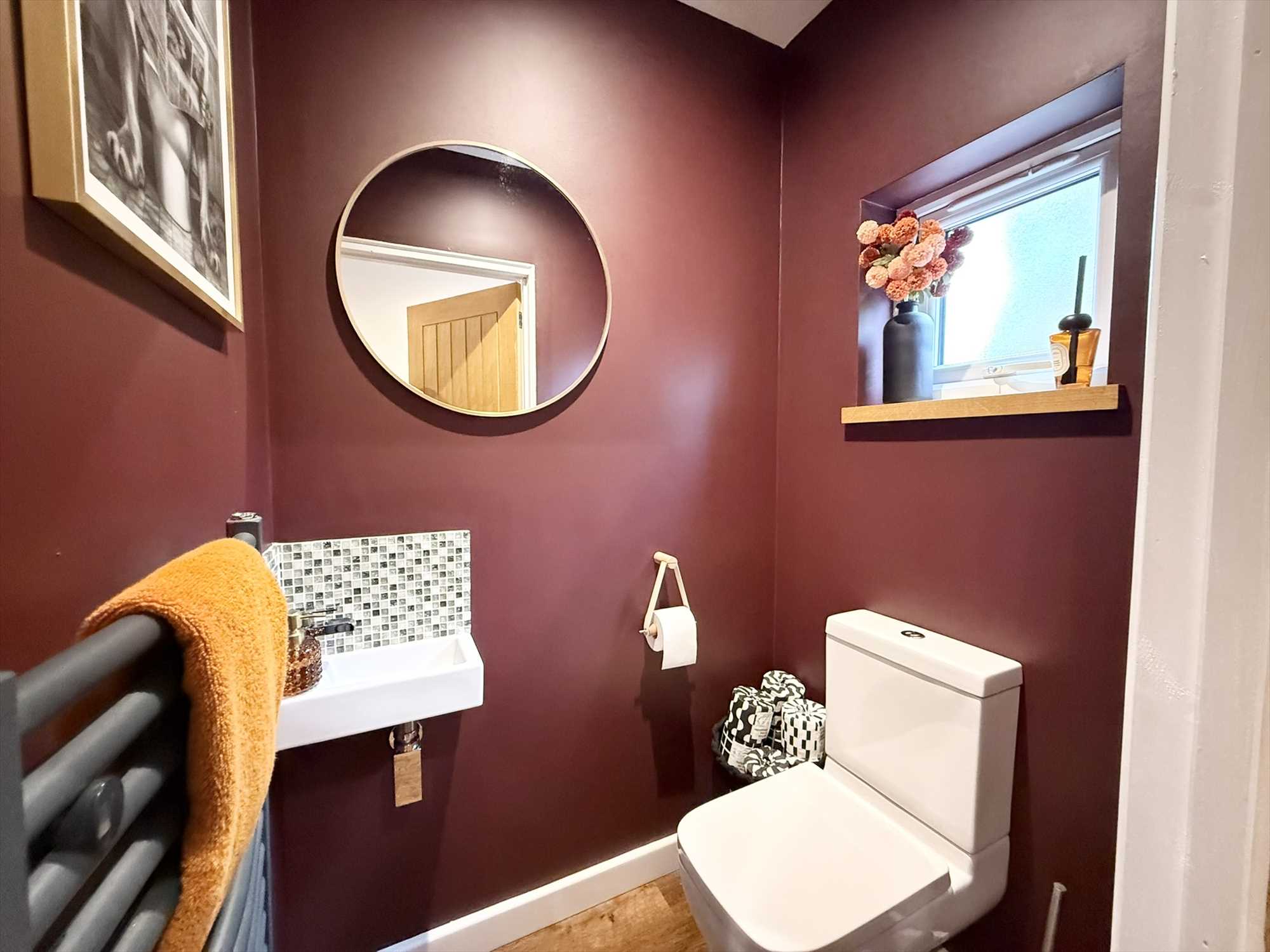 UPVC obscure double glazed window to side aspect, ceiling spotlights, low level flush WC, hand wash basin, heated towel rail, LVT flooring.