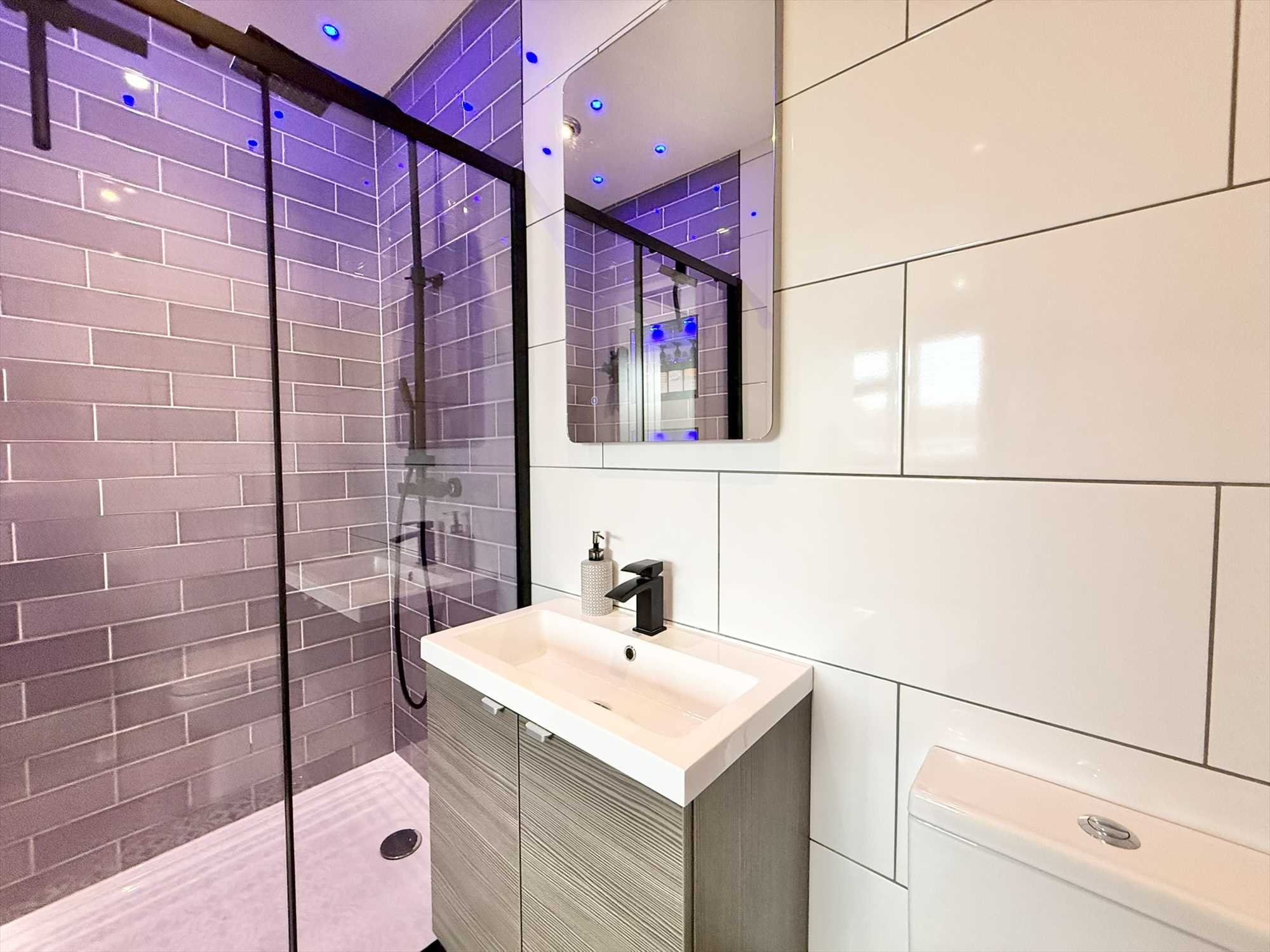 Ceiling spotlights, fully tiled walls, low level flush WC, vanity hand wash basin, walk in shower with sliding glass door, heated towel rail, tiled flooring.