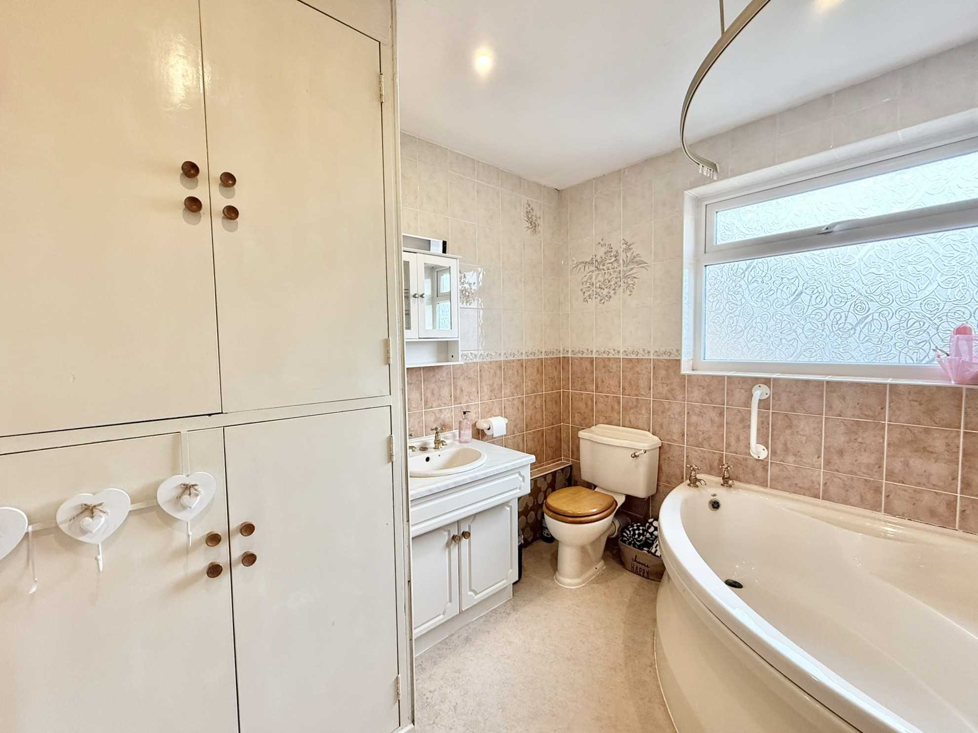 UPVC obscure double glazed window to rear aspect, ceiling spotlights, low level flush WC, vanity hand was basin, corner bath, built in storage cupboard, radiator, tile effect flooring.