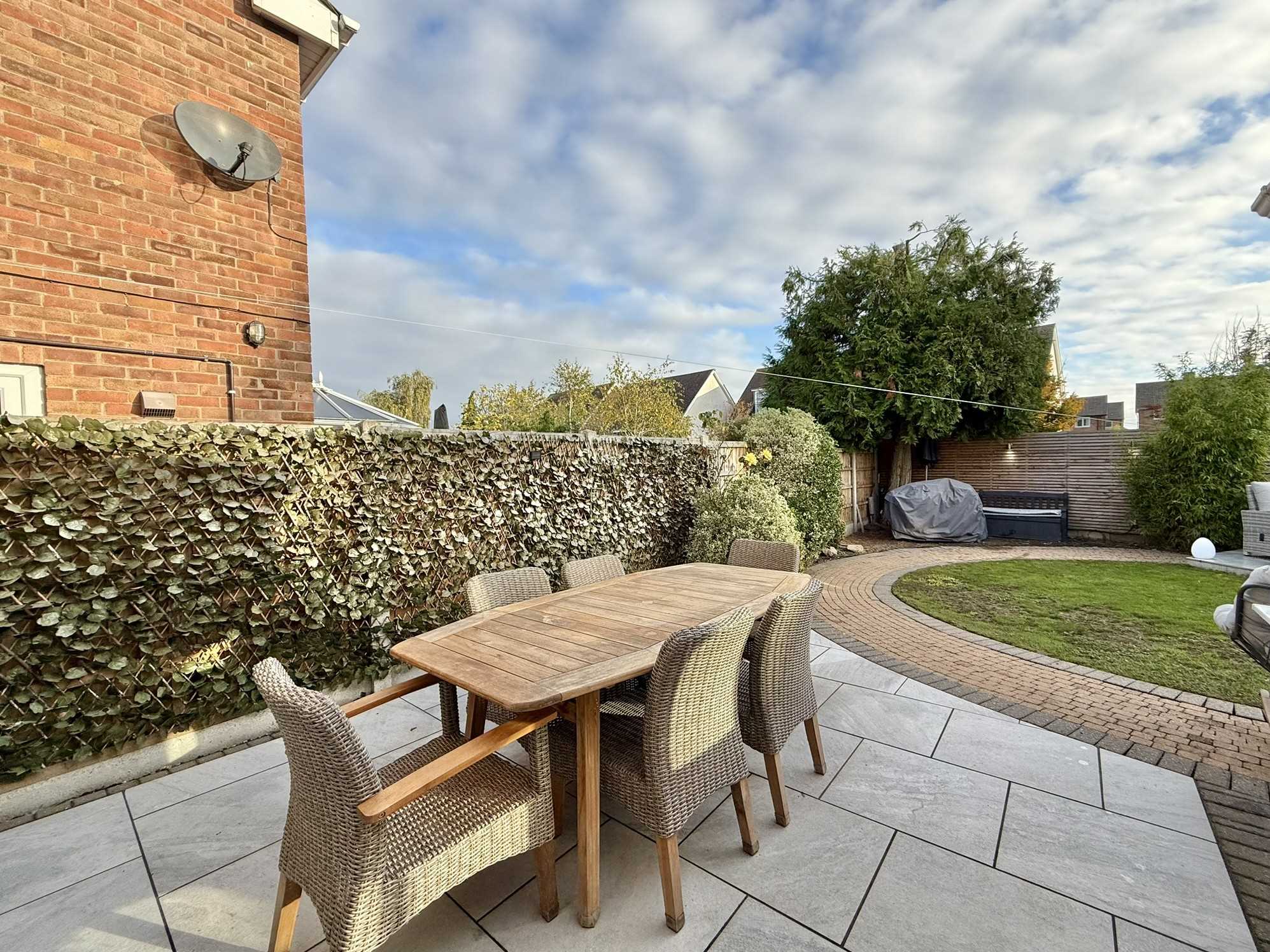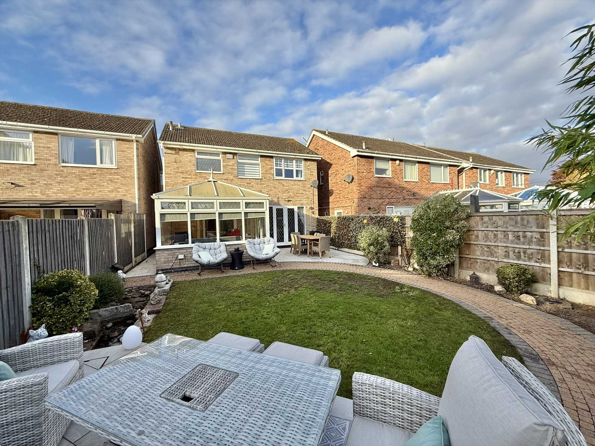 Outside, the property boasts off road parking, an integral garage/ store, and a beautifully landscaped rear garden designed for both relaxation and entertaining. The garden features multiple patio areas, attractive planting, and a tranquil water feature, creating a wonderful outdoor retreat.