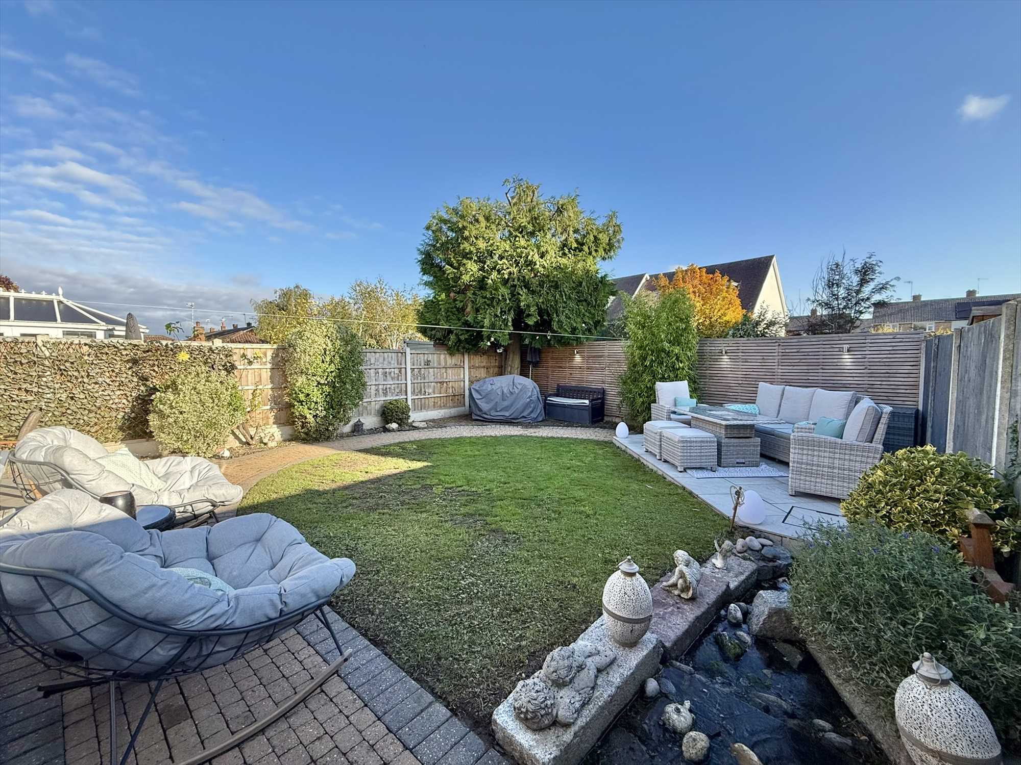 To the rear lies a generously sized, beautifully landscaped garden which is fully enclosed by timber fencing. A combination of block paving and a neatly maintained lawn is complemented by mature borders filled with established shrubs and trees, creating an attractive and tranquil setting. Two stone patio areas offer ideal spaces for outdoor dining, entertaining, or simply relaxing, while a charming water feature adds a soothing, natural ambiance. The garden also benefits from, exterior electrical sockets, outdoor tap, and gated side access leading to the front of the property.