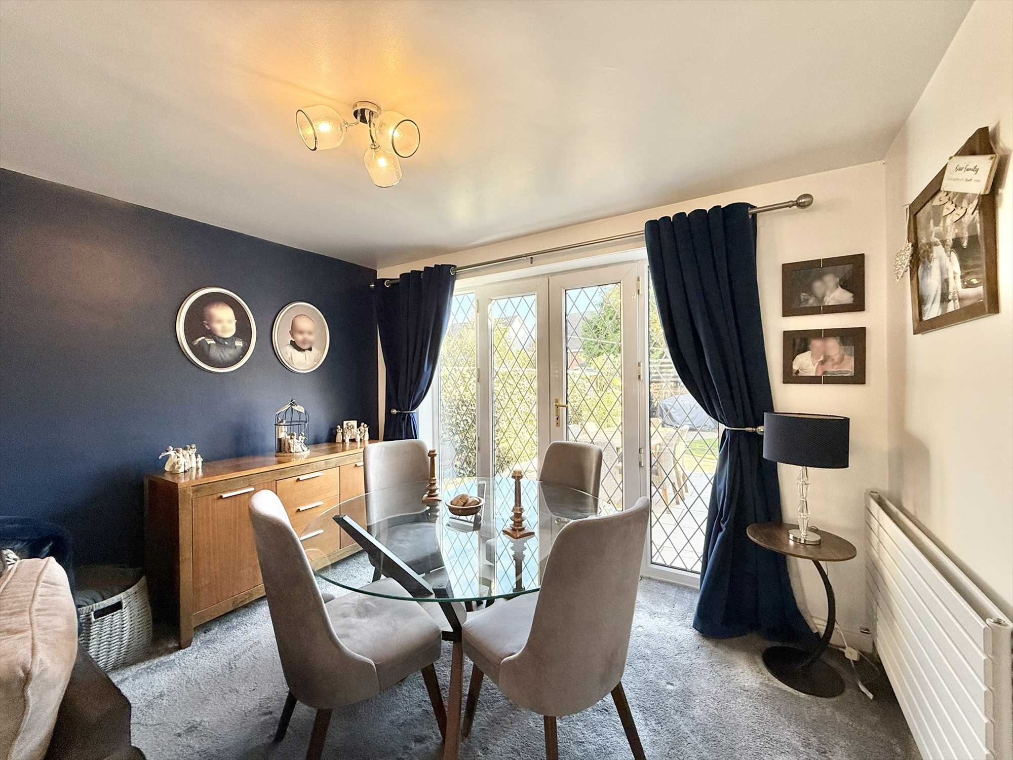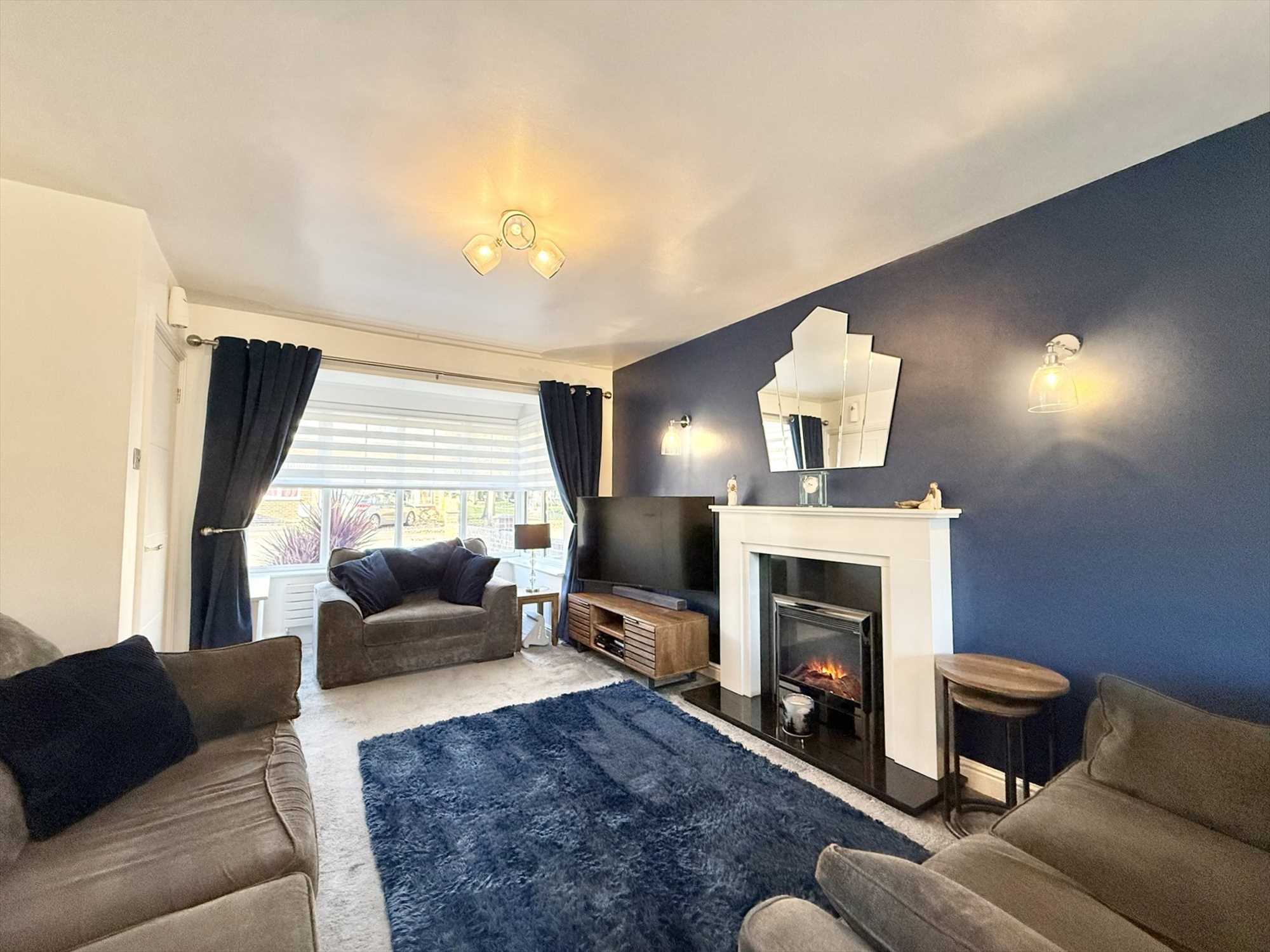 UPVC double glazed bay window to front aspect, UPVC double glazed windows and French doors to rear aspect, two ceiling light fittings, wall lights, two radiators, feature electric fireplace, carpet.