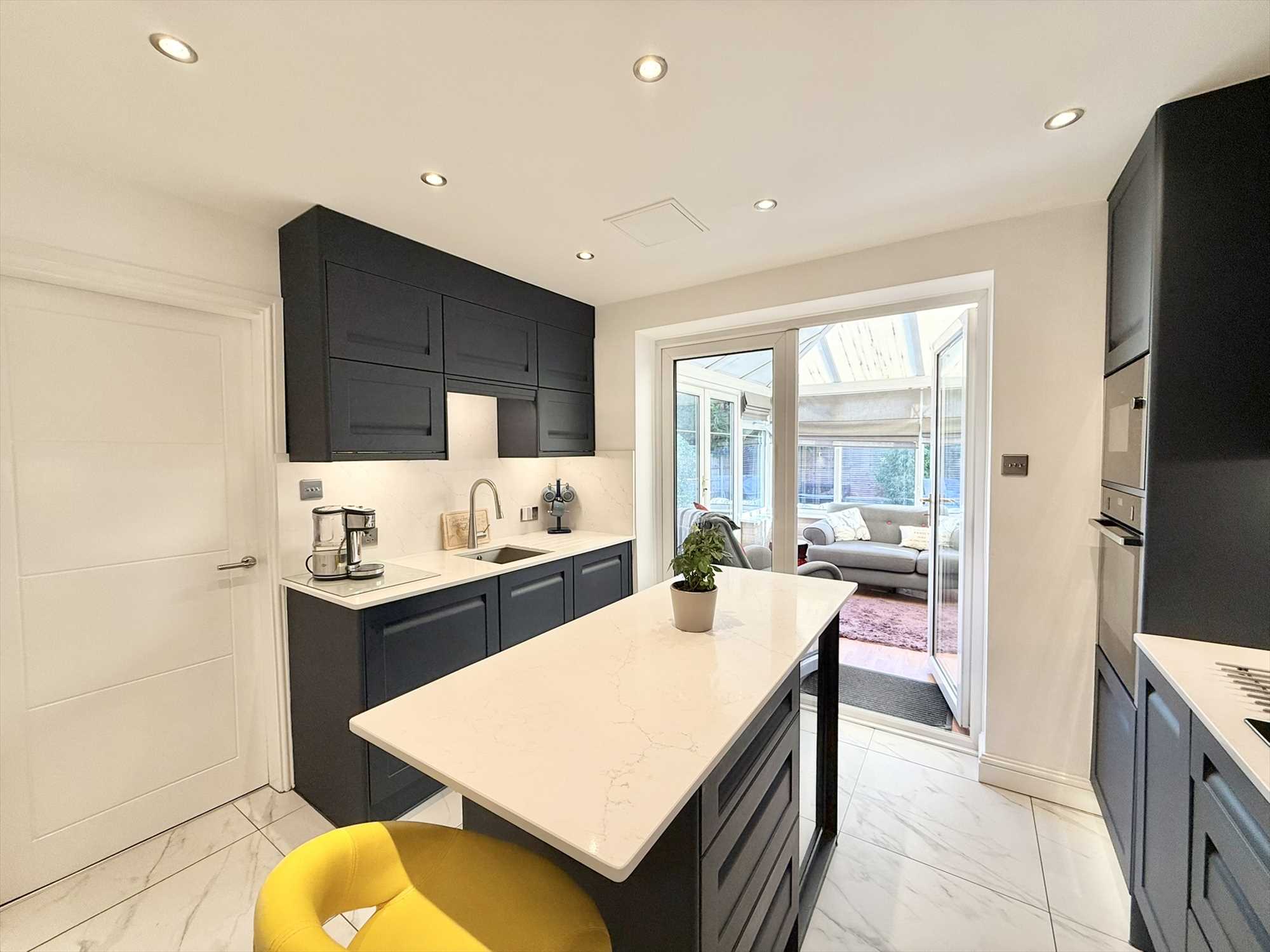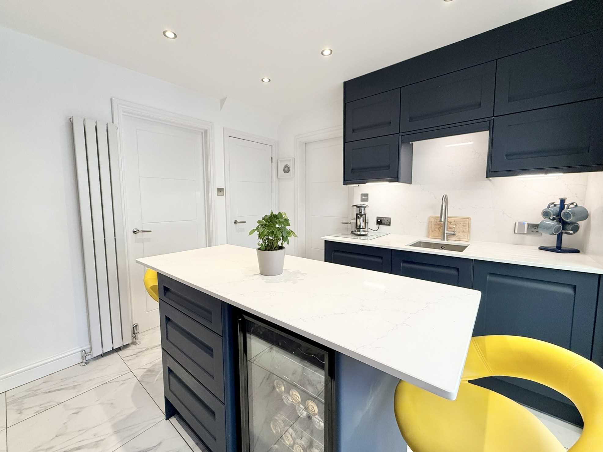 UPVC double glazed French doors to rear aspect, ceiling spotlights, a range of contemporary navy blue wall, drawer, and base units with marble effect worktop, matching breakfast bar, undermount stainless steel sink with mixer tap over, integrated oven, integrated microwave, four ring gas hob with extractor hood over, integrated fridge, integrated dishwasher, wine cooler, radiator, tiled flooring.